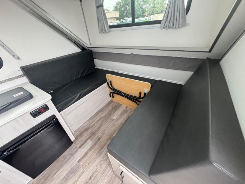 Looking for a camper that you can relax and unwind inside when you aren't exploring outdoors? Need sleeping space for two or three? Well the rear sofa bed in this camper converts into a 56" x 76" bed and the front dinette converts into a 46" x 76" bed. You will find storage space under the dinette seats, shelves on either side of the sofa, and a storage area across from the kitchen. You can prepare delicious meals with the two burner stove, clean up with the sink, and keep your perishables fresh within the refrigerator/freezer underneath the stove and sink. You might even like to add an optional soft or hard dormer to the front or rear of this unit, and/or the optional Off Road package.