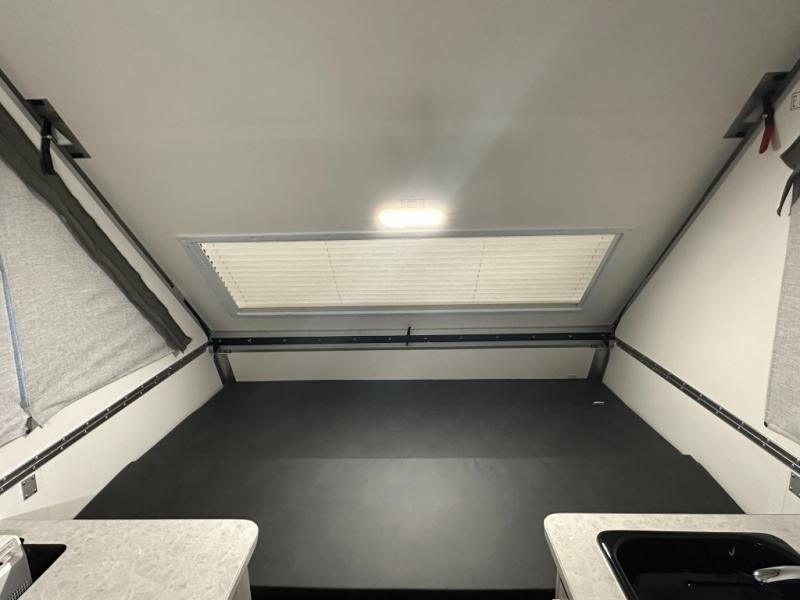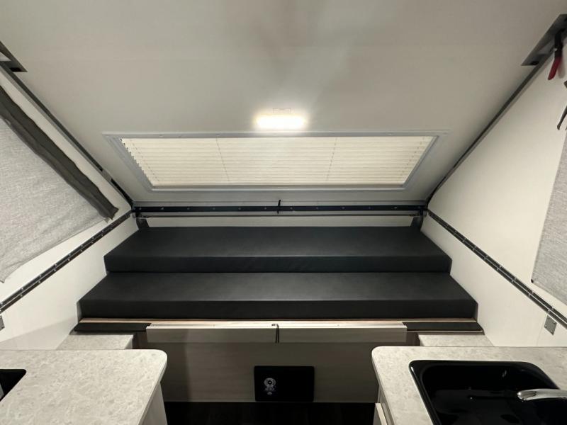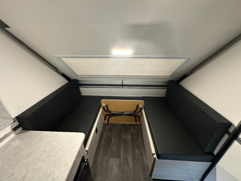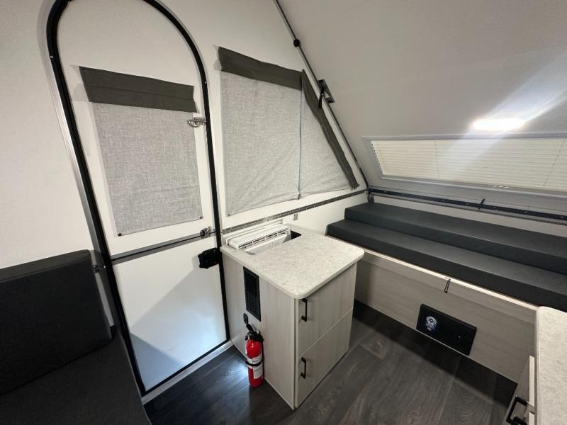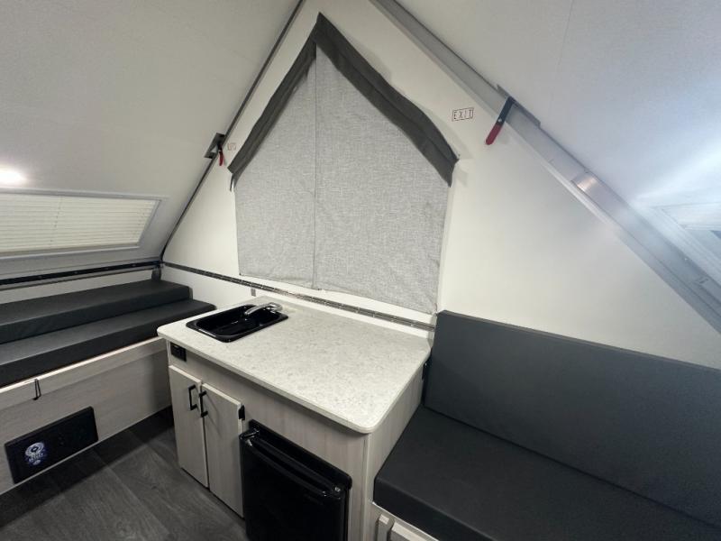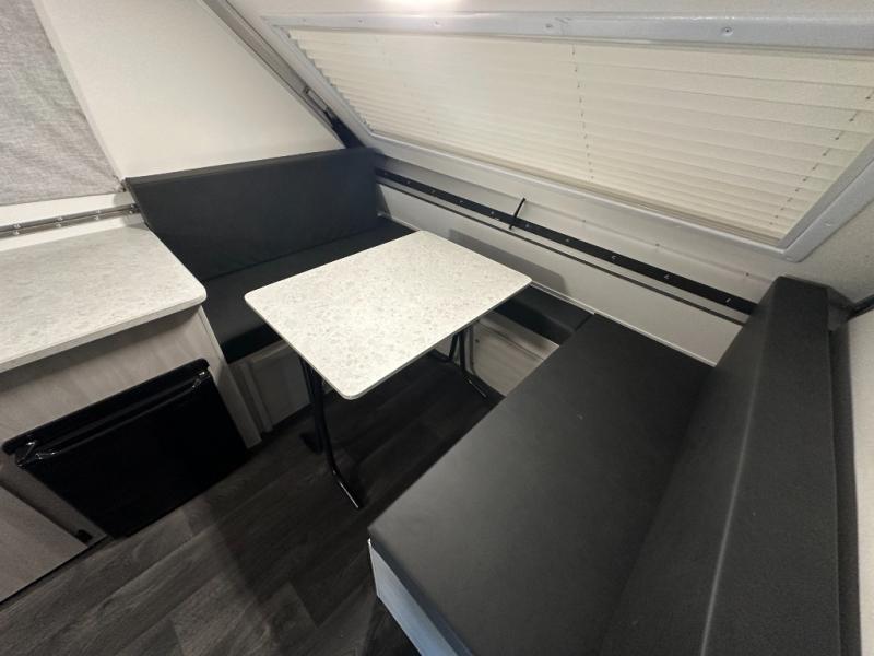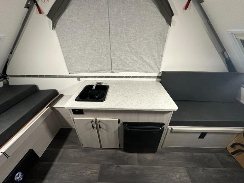 Get ready to sleep above ground as you upgrade from tent camping to this A-frame camper! It is easy to tow, set up and store when the fun is over. Inside you will find ample storage for your gear, a dinette to dine at when you aren't outside, and a sofa bed to relax on before bedtime. The dinette converts to a 46" x 76" bed, and the rear sofa converts to a 56" x 76" bed. There are three electrical outlets inside to keep your phone and camera charged, and the LED lights will help keep your space well lit. An optional 1.7 cu. ft. 12V refrigerator can be added, along with an optional side-mount A/C unit and optional 200-watt solar panel for added convenience!