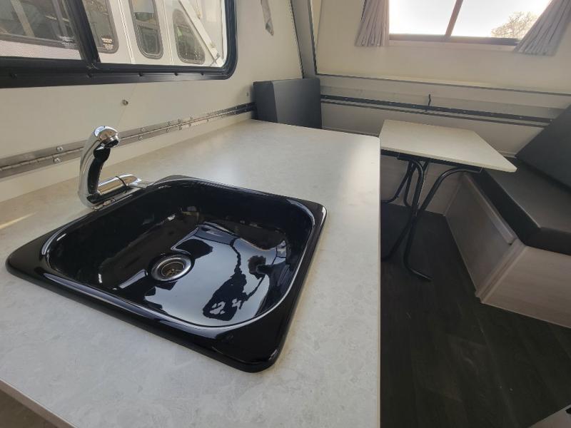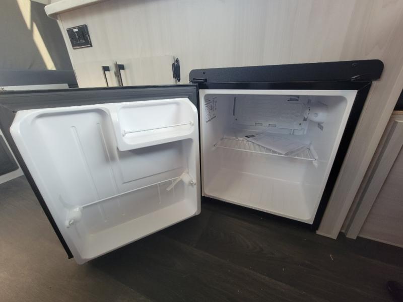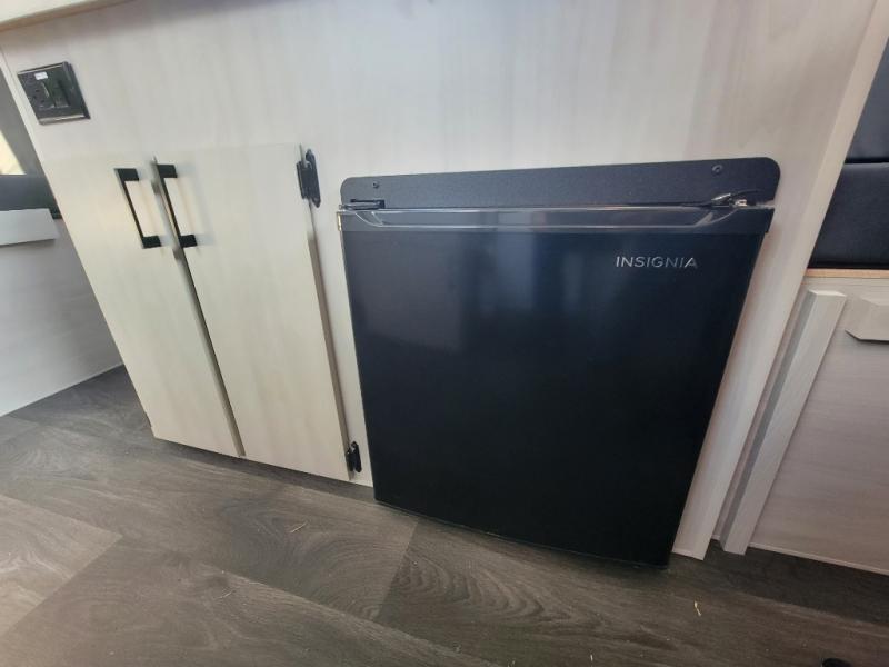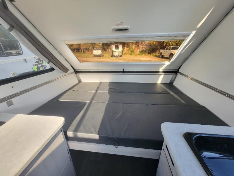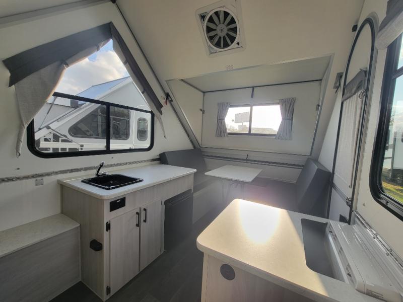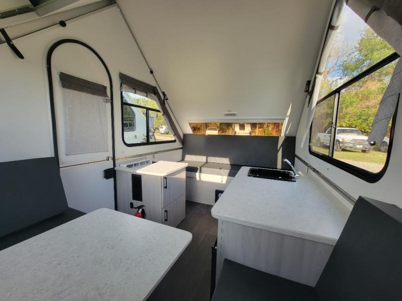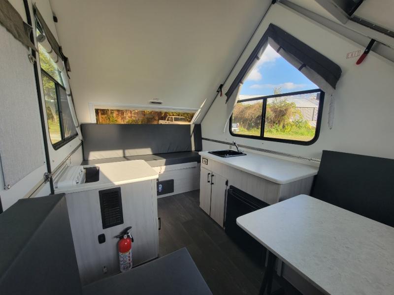 Get ready to sleep above ground as you upgrade from tent camping to this A-frame camper! It is easy to tow, set up and store when the fun is over. Inside you will find ample storage for your gear, a dinette to dine at when you aren't outside, and a sofa bed to relax on before bedtime. The dinette converts to a 46" x 76" bed, and the rear sofa converts to a 56" x 76" bed. There are three electrical outlets inside to keep your phone and camera charged, and the LED lights will help keep your space well lit. An optional 1.7 cu. ft. 12V refrigerator can be added, along with an optional side-mount A/C unit and optional 200-watt solar panel for added convenience!