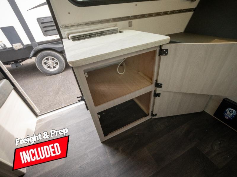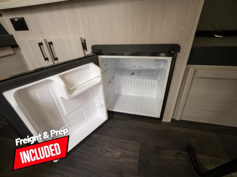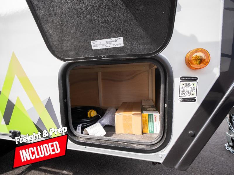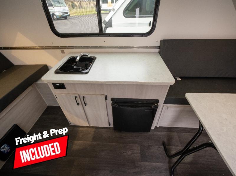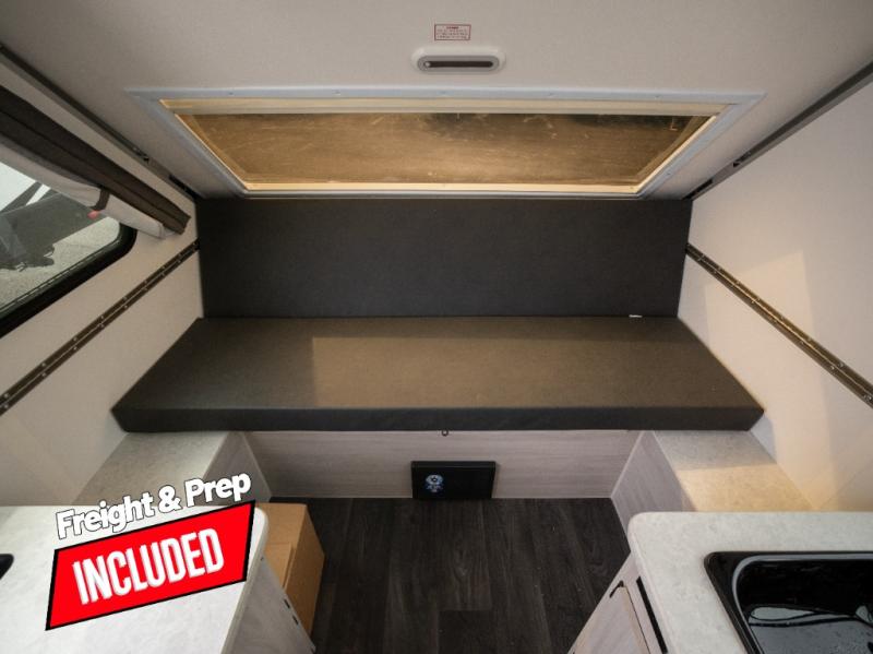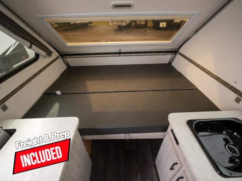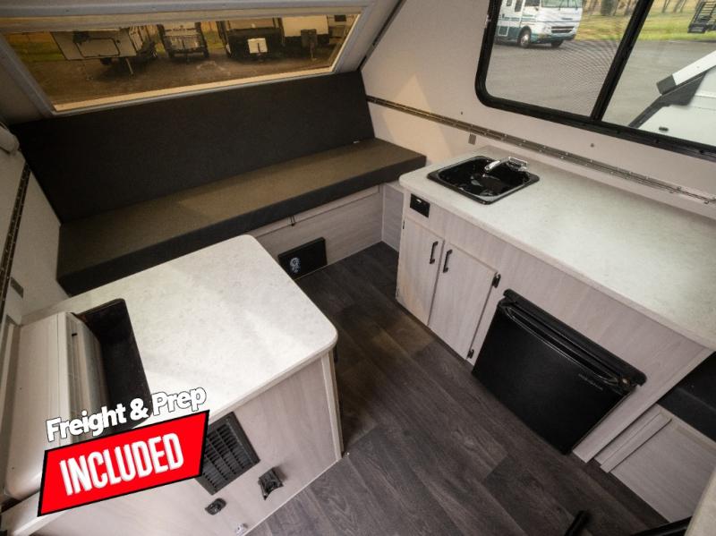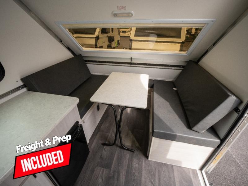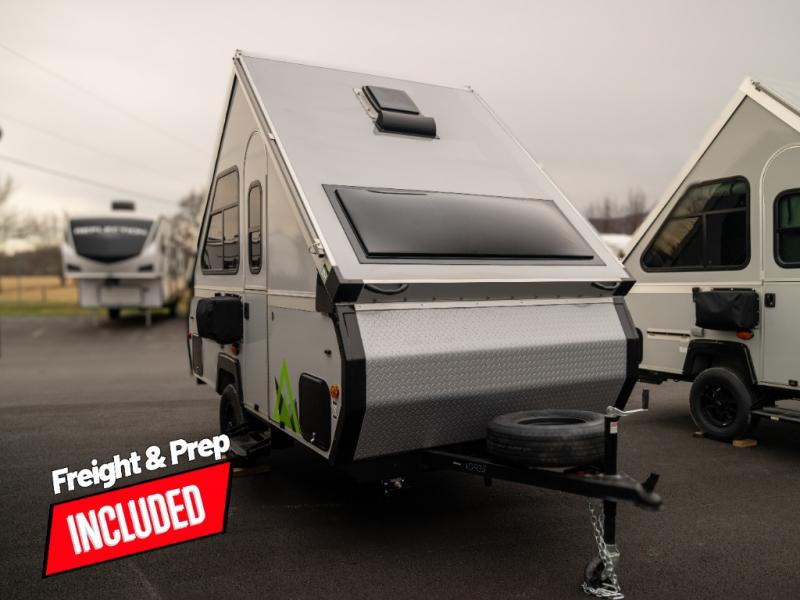 Get ready to sleep above ground as you upgrade from tent camping to this A-frame camper! It is easy to tow, set up and store when the fun is over. Inside you will find ample storage for your gear, a dinette to dine at when you aren't outside, and a sofa bed to relax on before bedtime. The dinette converts to a 46" x 76" bed, and the rear sofa converts to a 56" x 76" bed. There are three electrical outlets inside to keep your phone and camera charged, and the LED lights will help keep your space well lit. An optional 1.7 cu. ft. 12V refrigerator can be added, along with an optional side-mount A/C unit and optional 200-watt solar panel for added convenience!