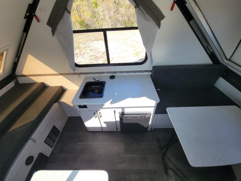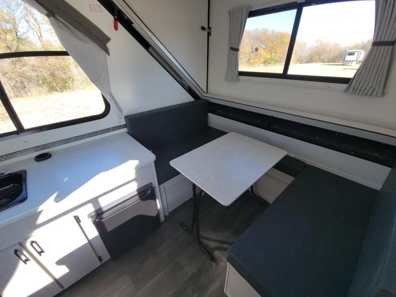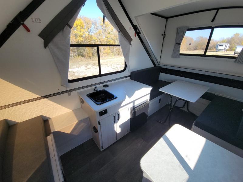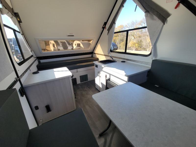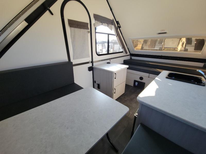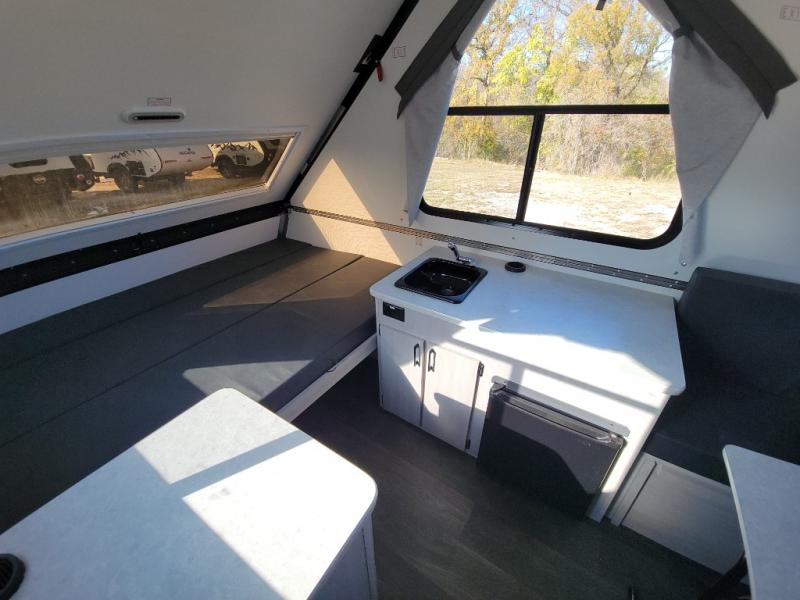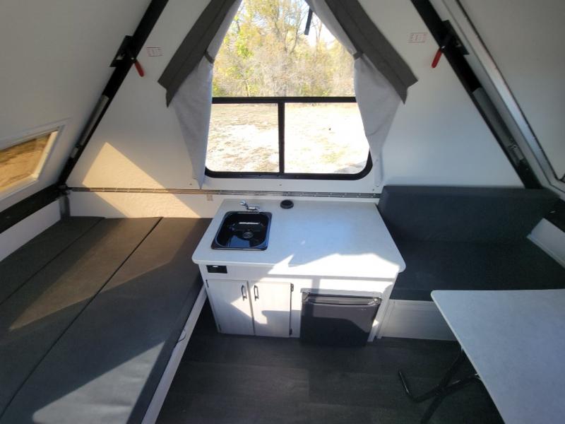 Get ready to sleep above ground as you upgrade from tent camping to this A-frame camper! It is easy to tow, set up and store when the fun is over. Inside you will find ample storage for your gear, a dinette to dine at when you aren't outside, and a sofa bed to relax on before bedtime. The dinette converts to a 46" x 76" bed, and the rear sofa converts to a 56" x 76" bed. There are three electrical outlets inside to keep your phone and camera charged, and the LED lights will help keep your space well lit. An optional 1.7 cu. ft. 12V refrigerator can be added, along with an optional side-mount A/C unit and optional 200-watt solar panel for added convenience!