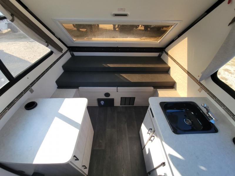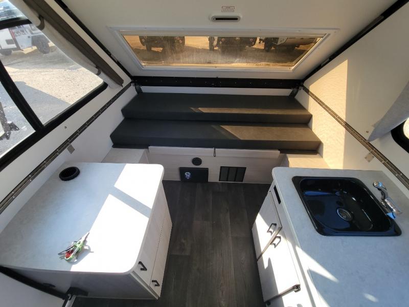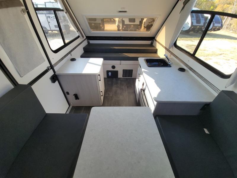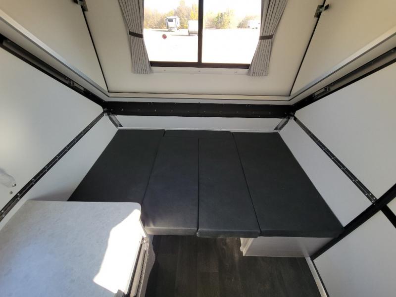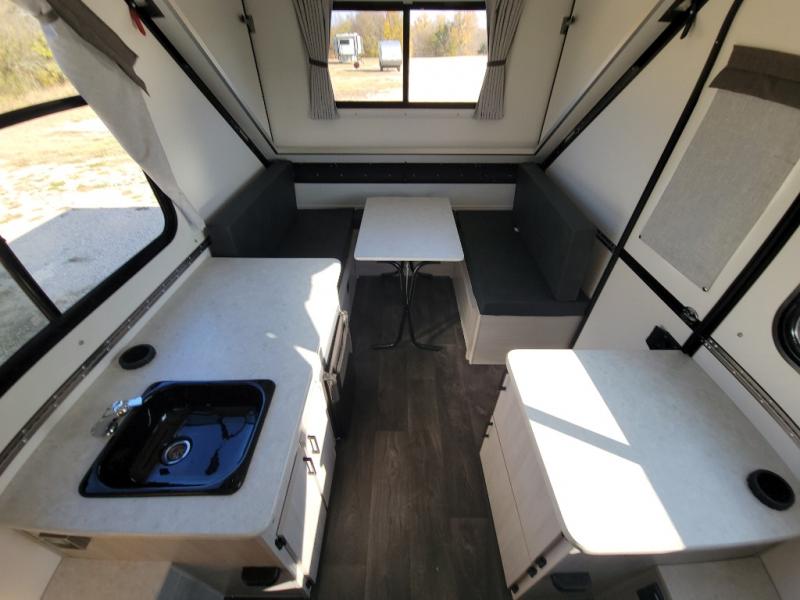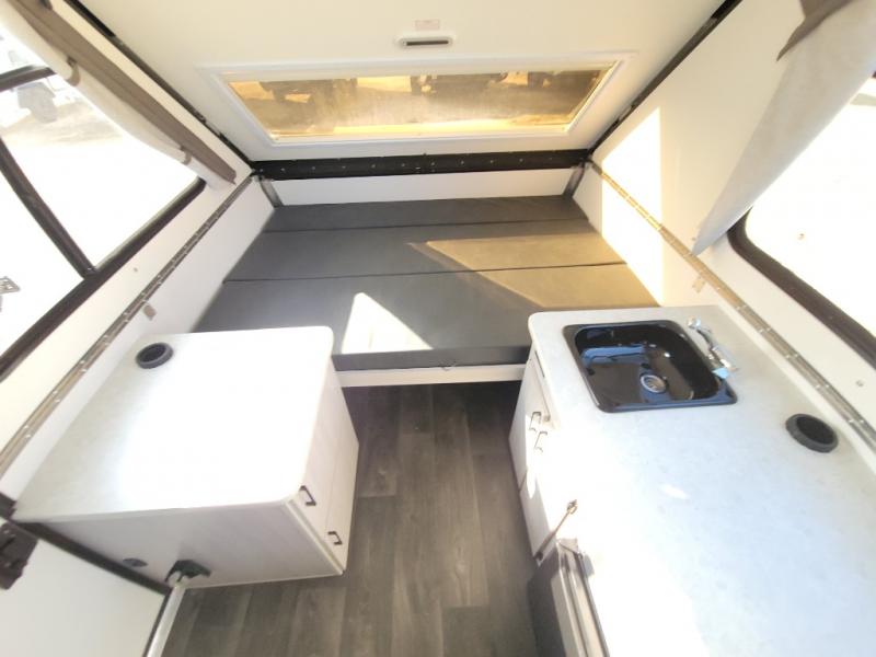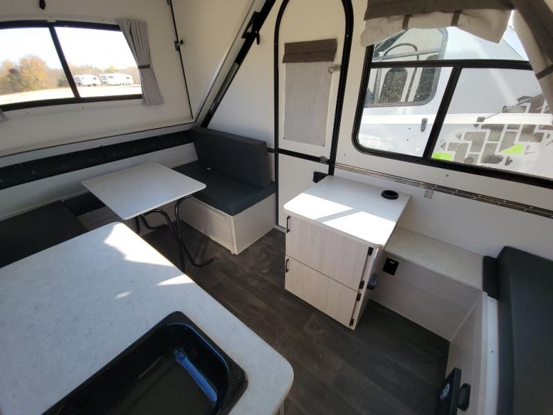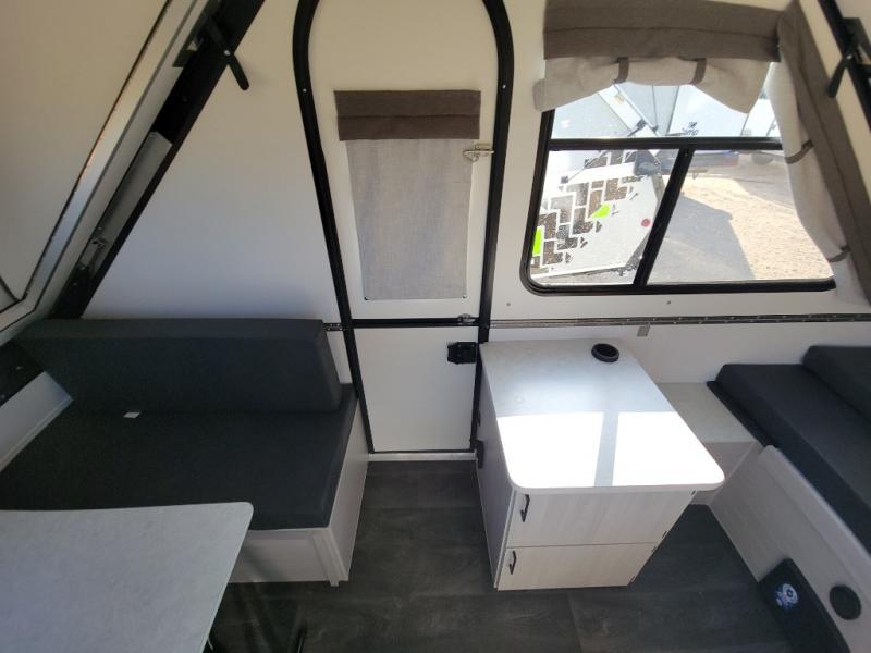Get ready to sleep above ground as you upgrade from tent camping to this A-frame camper! It is easy to tow, set up and store when the fun is over. Inside you will find ample storage for your gear, a dinette to dine at when you aren't outside, and a sofa bed to relax on before bedtime. The dinette converts to a 46" x 76" bed, and the rear sofa converts to a 56" x 76" bed. There are three electrical outlets inside to keep your phone and camera charged, and the LED lights will help keep your space well lit. An optional 1.7 cu. ft. 12V refrigerator can be added, along with an optional side-mount A/C unit and optional 200-watt solar panel for added convenience!