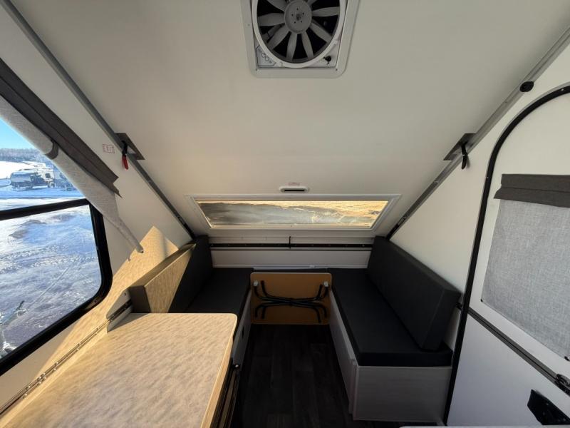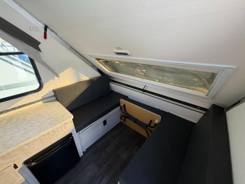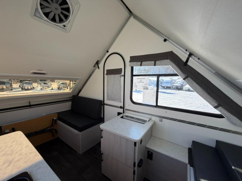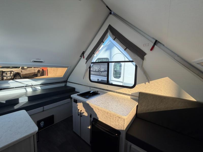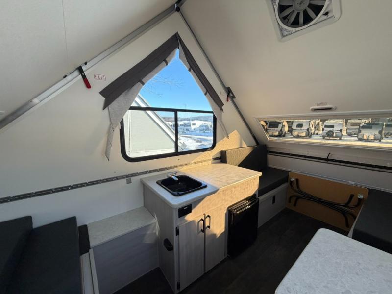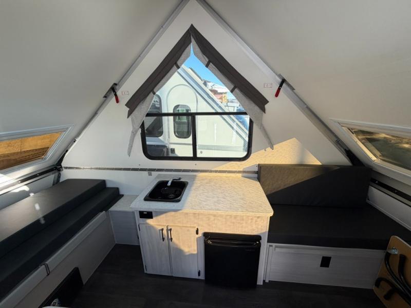 Get ready to sleep above ground as you upgrade from tent camping to this A-frame camper! It is easy to tow, set up and store when the fun is over. Inside you will find ample storage for your gear, a dinette to dine at when you aren't outside, and a sofa bed to relax on before bedtime. The dinette converts to a 46" x 76" bed, and the rear sofa converts to a 56" x 76" bed. There are three electrical outlets inside to keep your phone and camera charged, and the LED lights will help keep your space well lit. An optional 1.7 cu. ft. 12V refrigerator can be added, along with an optional side-mount A/C unit and optional 200-watt solar panel for added convenience!