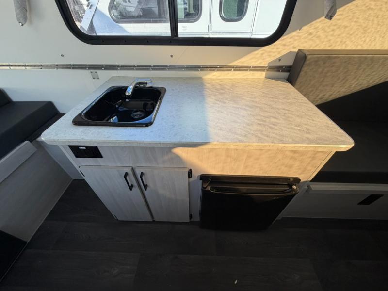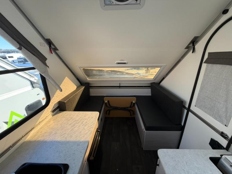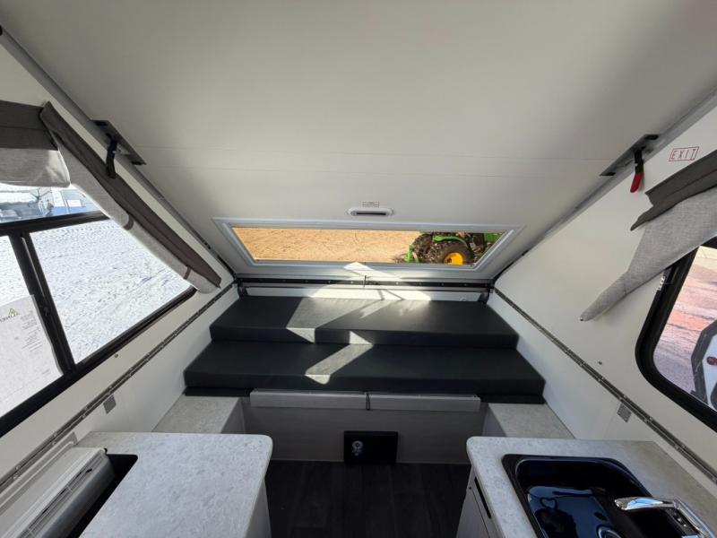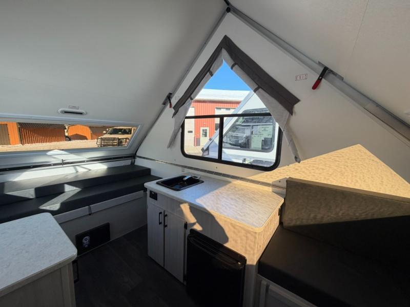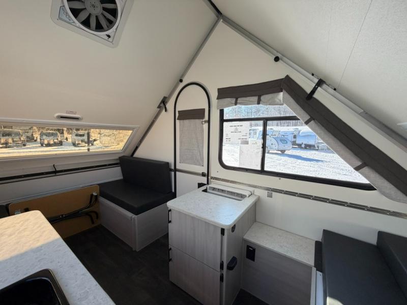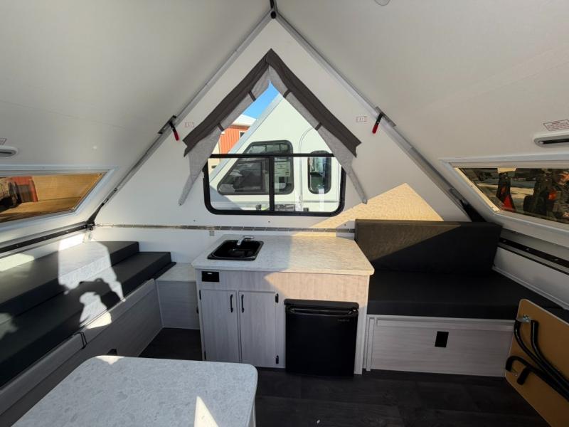 Get ready to sleep above ground as you upgrade from tent camping to this A-frame camper! It is easy to tow, set up and store when the fun is over. Inside you will find ample storage for your gear, a dinette to dine at when you aren't outside, and a sofa bed to relax on before bedtime. The dinette converts to a 46" x 76" bed, and the rear sofa converts to a 56" x 76" bed. There are three electrical outlets inside to keep your phone and camera charged, and the LED lights will help keep your space well lit. An optional 1.7 cu. ft. 12V refrigerator can be added, along with an optional side-mount A/C unit and optional 200-watt solar panel for added convenience!