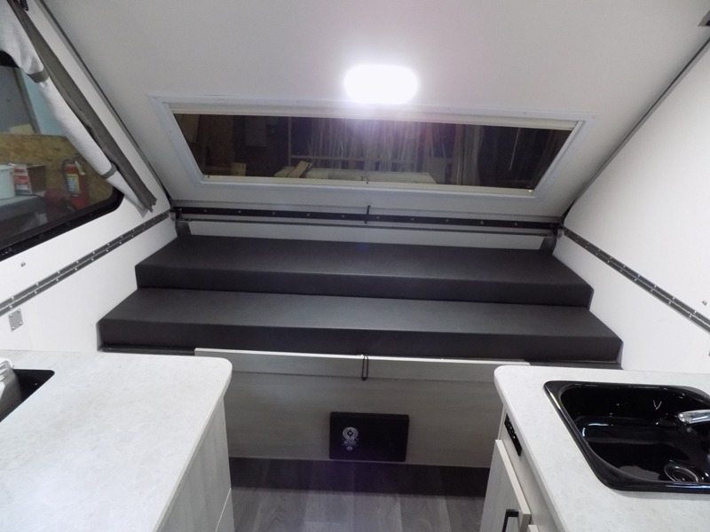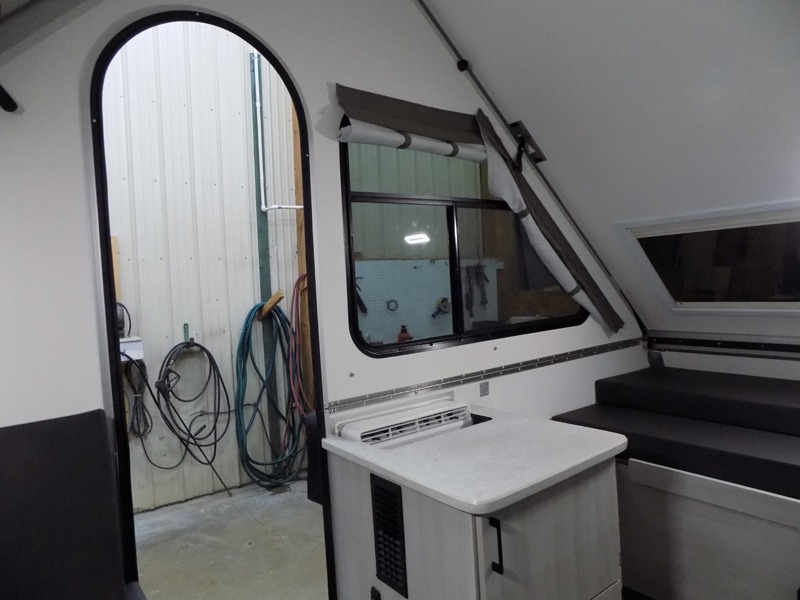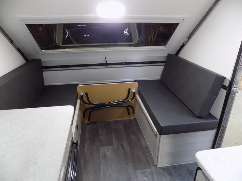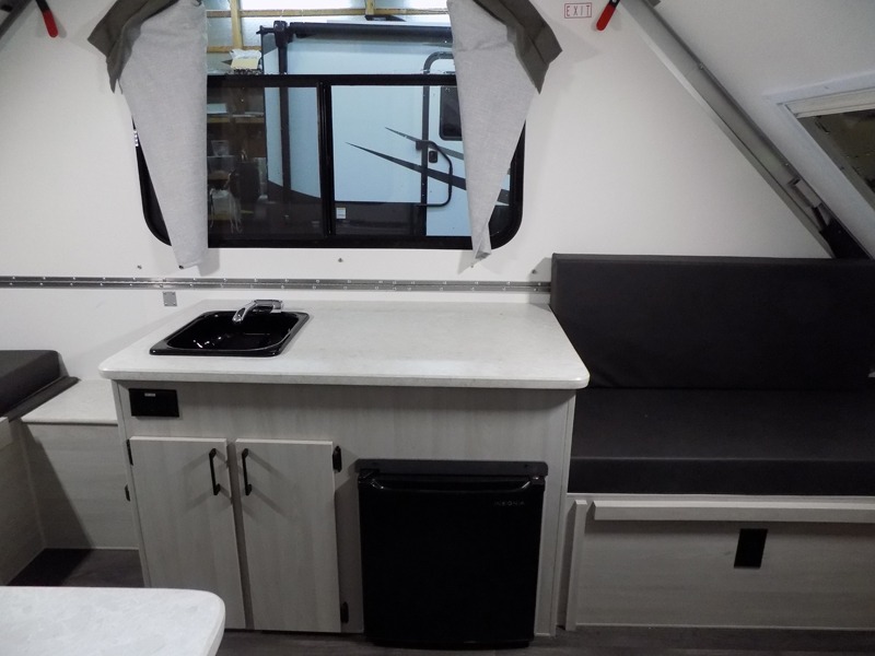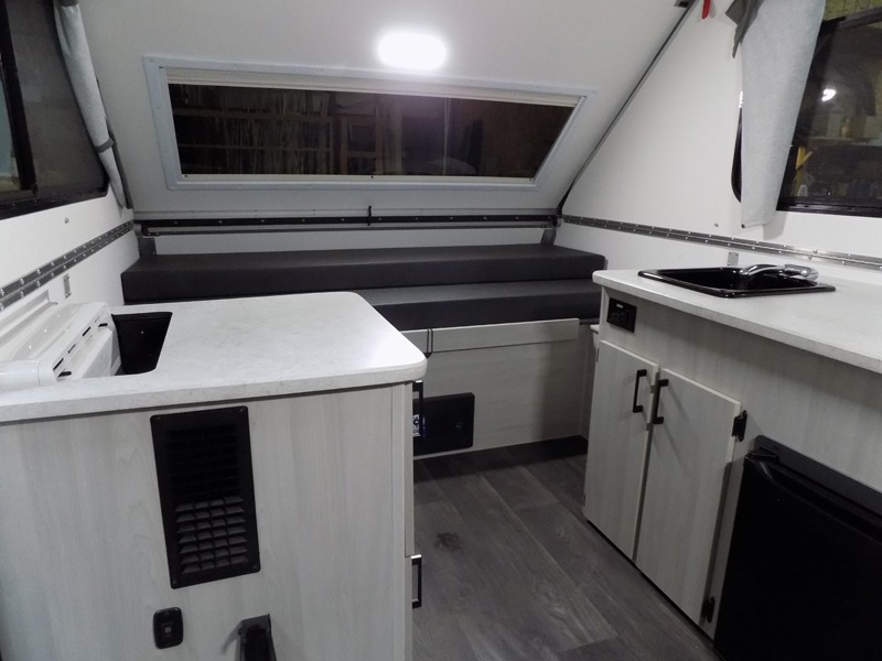 Get ready to sleep above ground as you upgrade from tent camping to this A-frame camper! It is easy to tow, set up and store when the fun is over. Inside you will find ample storage for your gear, a dinette to dine at when you aren't outside, and a sofa bed to relax on before bedtime. The dinette converts to a 46" x 76" bed, and the rear sofa converts to a 56" x 76" bed. There are three electrical outlets inside to keep your phone and camera charged, and the LED lights will help keep your space well lit. An optional 1.7 cu. ft. 12V refrigerator can be added, along with an optional side-mount A/C unit and optional 200-watt solar panel for added convenience!
