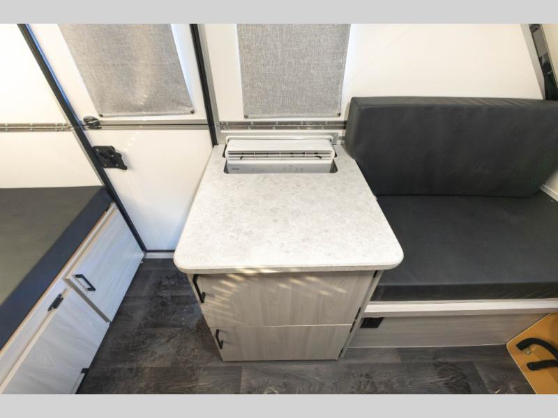 When all you need is the basics to camp, this Scout Lite will be perfect for you! There is sleeping space on either the front 30" x 76" bed or the rear dinette which converts into a 40" x 76" bed. There is plenty of storage throughout between the storage under the front bed, under the sink, and the exterior baggage door. And you can keep everything charged with the two electrical outlets inside and the one exterior electrical outlet!