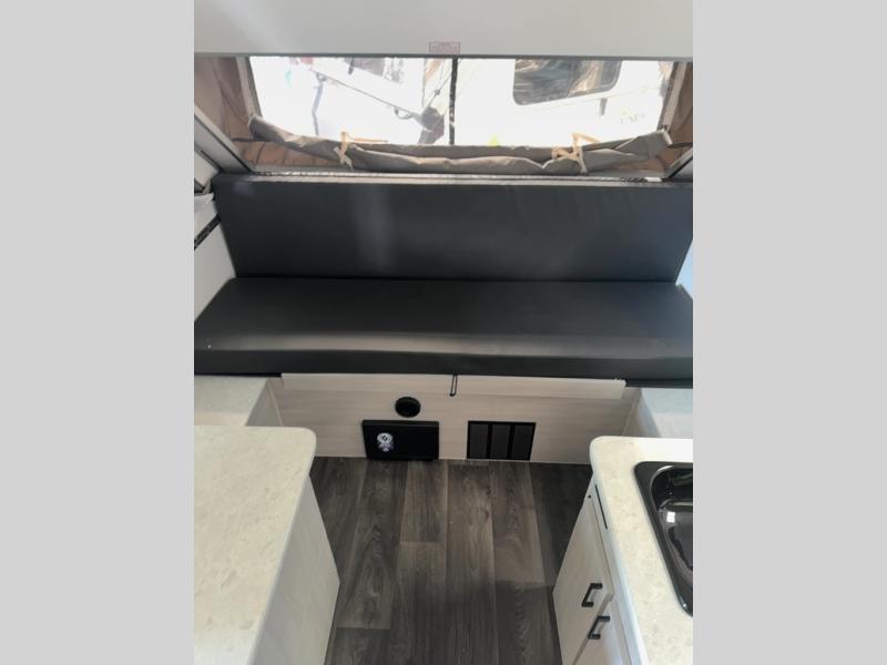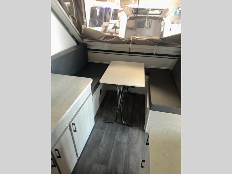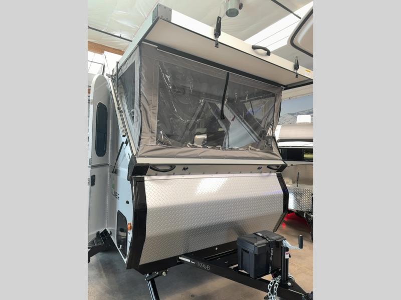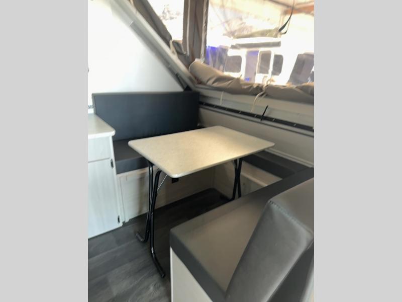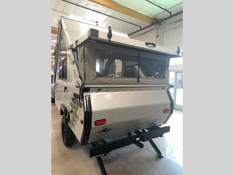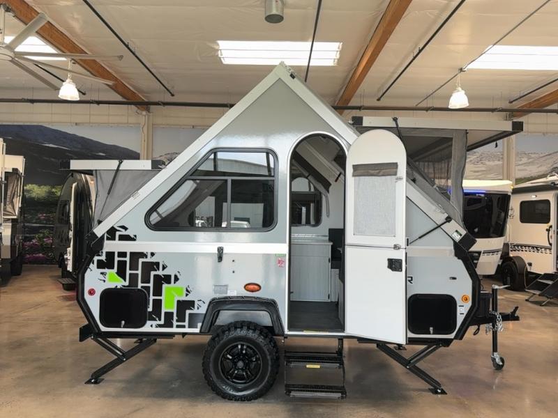 Get ready to sleep above ground as you upgrade from tent camping to this A-frame camper! It is easy to tow, set up and store when the fun is over. Inside you will find ample storage for your gear, a dinette to dine at when you aren't outside, a sofa bed to relax on before bedtime, and both furnishings covert to sleeping space. The dinette converts to a 46" x 76" bed, and there is storage under the seats. You will also have shelves to set your phone and such on. There are more features such as three electrical outlets inside, one outlet outside, high density foam, hypoallergenic cushions and mattress, a fantastic vent-fan, and options to choose from such as a front soft dormer, a rear soft dormer, and/or an Extreme Off-Road package, plus more!
