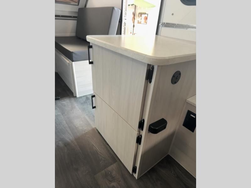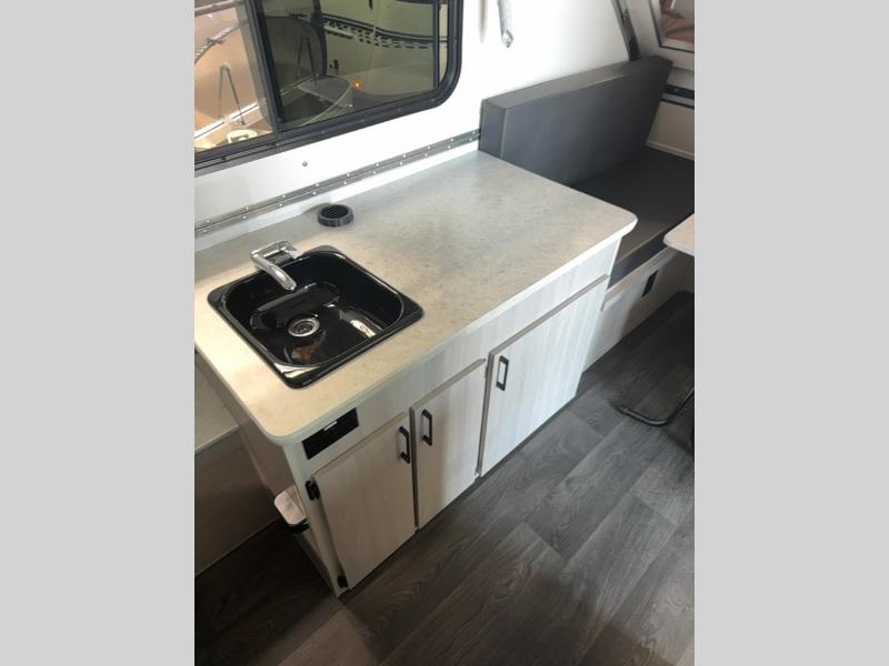 With the Scout A-frame camper by Aliner, there is an E-coated frame with powder coating on the front tongue and bumper, a diamond plate stone guard to protect against road debris, aluminum wheels, and a battery tray. There are vacuum bonded fiberglass panels, an Azdel lightweight, Thermoplastic composite interior wall and ceiling panels, and 10" electric brakes. You will also find a sink inside to wash your hands and dishes, two skylights with night shades and a door window for natural lighting, plus more!
