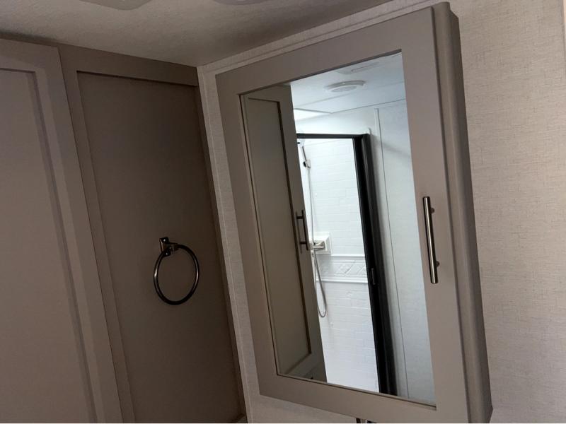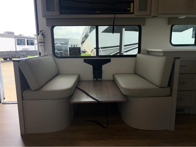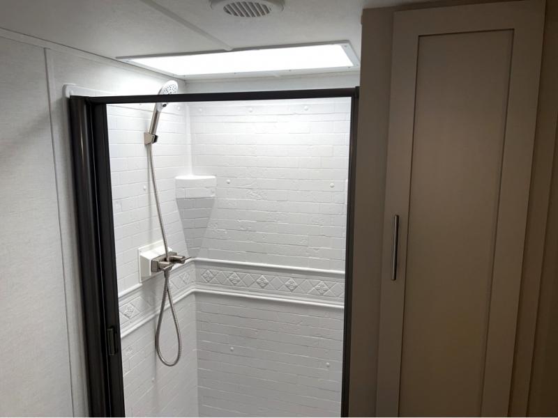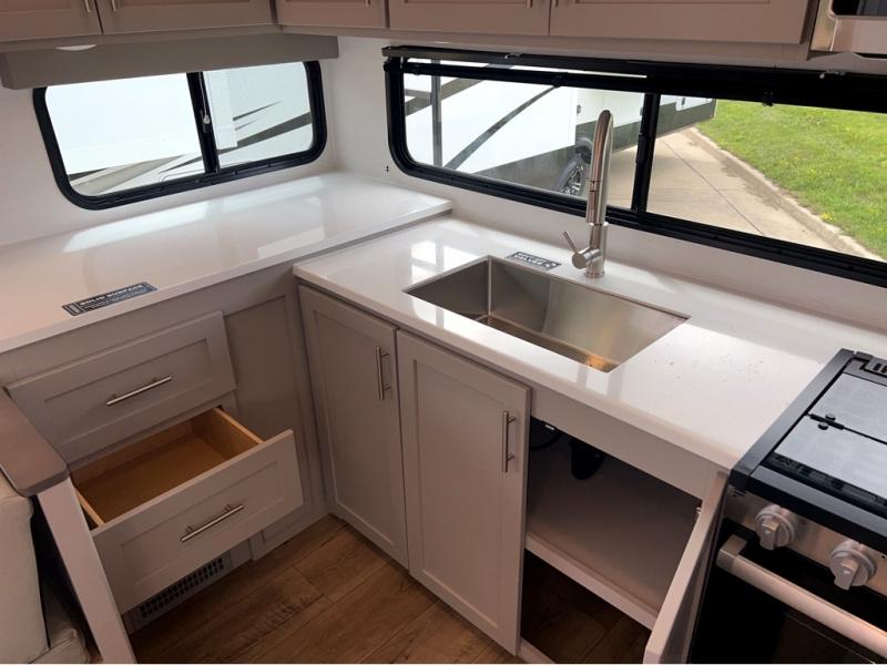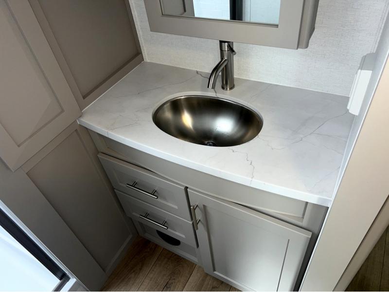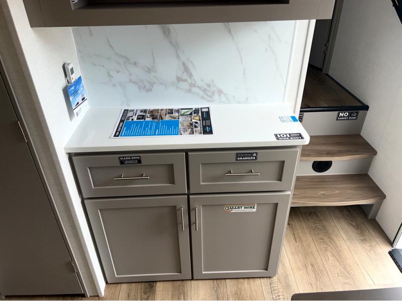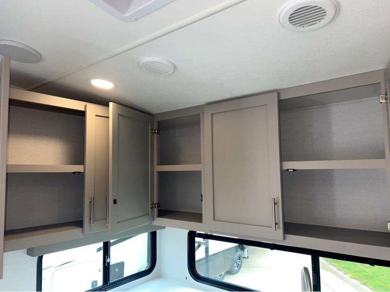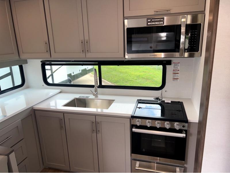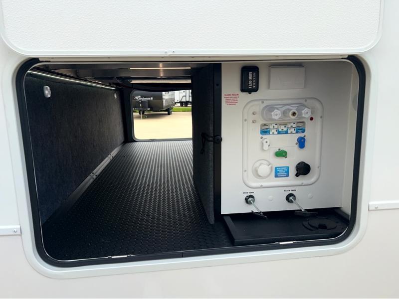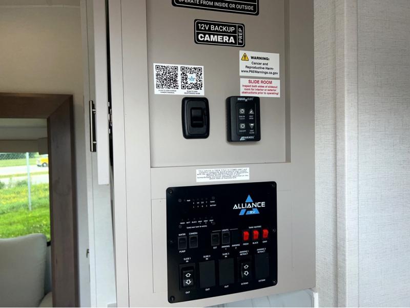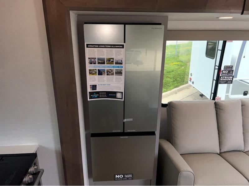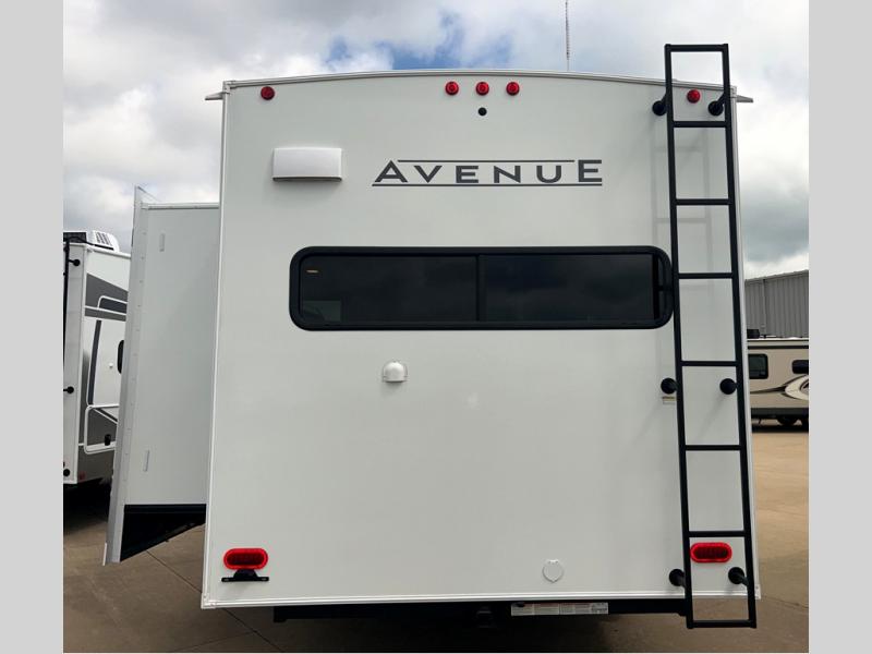 A benchmark chassis creates a space saver upper deck with each one of these Avenue All-Access fifth wheels by Alliance RV! The 101 in. wide-body construction gives you more room to walk around and the flush slide out floors throughout prevent any tripping. There are Azdel composite sidewalls inside and out, and a seamless fully walkable PVC roof for extreme durability and zero maintenance. You are sure to love no carpet throughout making each Avenue All-Access easy to clean and allergen free, not to mention pet friendly. You can maximize your space throughout with innovative storage solutions like the hidden storage behind the TV, inside the end tables, ottoman, and dinette chairs. These units also include the OTG Solar Package with a 200 watt solar panel, 15 amp MPPT charger, multiple outlets, and more to keep you powered up!