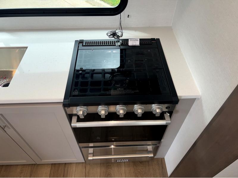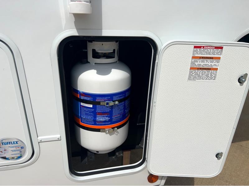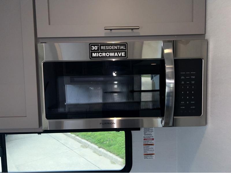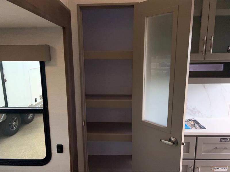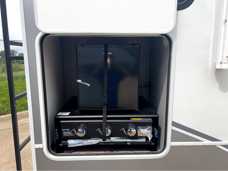 This fifth wheel is ready for adventure when you are! Once you arrive at the campground, you can put out the 16' awning, then start lunch on the exterior griddle. A booth dinette and theater sofa provide seating space inside, and there is a 50" Class HDTV to enjoy movies. The chef will also love the interior kitchen with its ample counter space, and there is plenty of storage with a hutch/pantry, second pantry, and 10 cu. ft. 12V refrigerator. Freshen up in the full bath before heading off to bed in the front private bedroom. Here, you'll find a queen bed, dual nightstands and overhead storage, plus a wardrobe with washer and dryer prep if you choose to add those appliances!