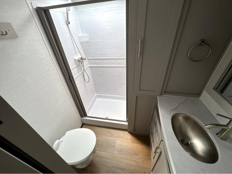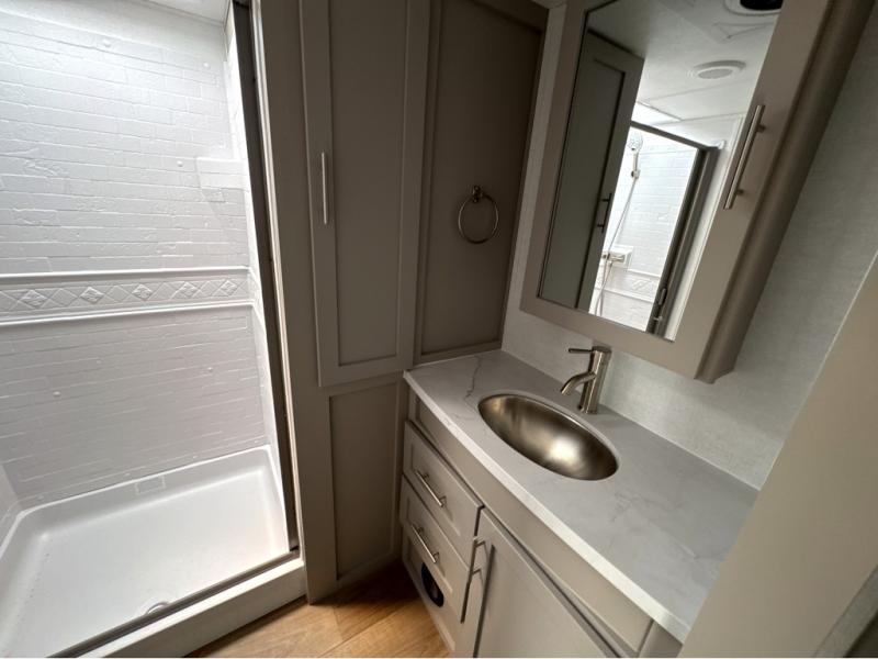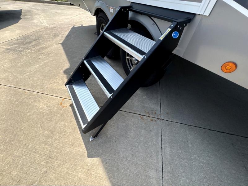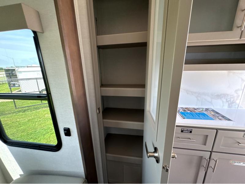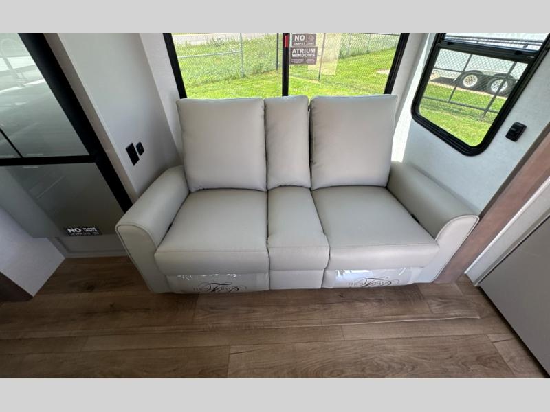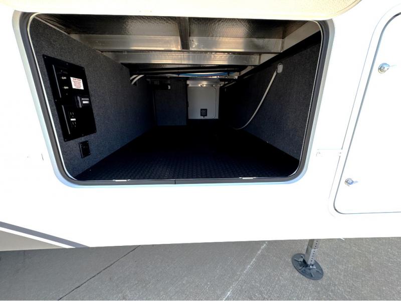 A benchmark chassis creates a space saver upper deck with each one of these Avenue All-Access fifth wheels by Alliance RV! The 101 in. wide-body construction gives you more room to walk around and the flush slide out floors throughout prevent any tripping. There are Azdel composite sidewalls inside and out, and a seamless fully walkable PVC roof for extreme durability and zero maintenance. You are sure to love no carpet throughout making each Avenue All-Access easy to clean and allergen free, not to mention pet friendly. You can maximize your space throughout with innovative storage solutions like the hidden storage behind the TV, inside the end tables, ottoman, and dinette chairs. These units also include the OTG Solar Package with a 200 watt solar panel, 15 amp MPPT charger, multiple outlets, and more to keep you powered up!
