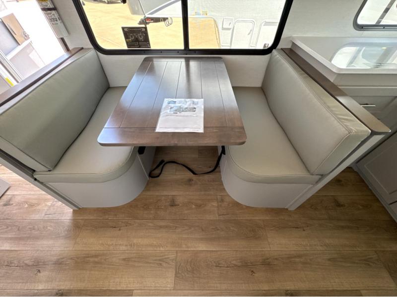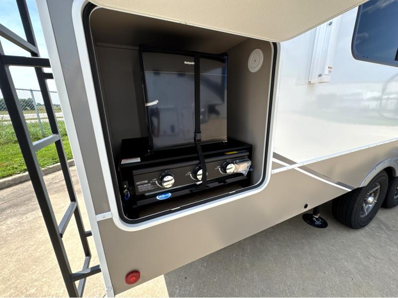 This fifth wheel is ready for adventure when you are! Once you arrive at the campground, you can put out the 16' awning, then start lunch on the exterior griddle. A booth dinette and theater sofa provide seating space inside, and there is a 50" Class HDTV to enjoy movies. The chef will also love the interior kitchen with its ample counter space, and there is plenty of storage with a hutch/pantry, second pantry, and 10 cu. ft. 12V refrigerator. Freshen up in the full bath before heading off to bed in the front private bedroom. Here, you'll find a queen bed, dual nightstands and overhead storage, plus a wardrobe with washer and dryer prep if you choose to add those appliances!