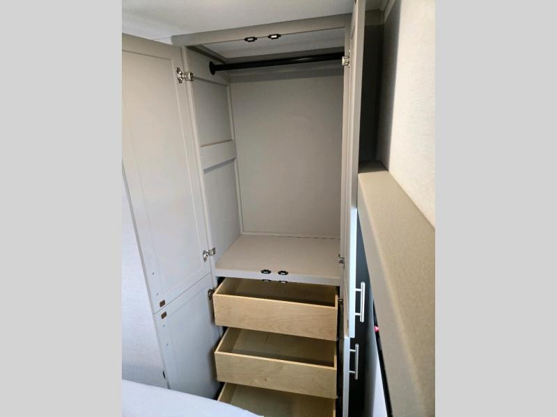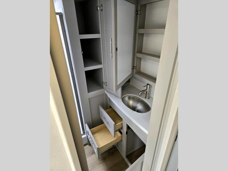 This fifth wheel is ready for adventure when you are! Once you arrive at the campground, you can put out the 16' awning, then start lunch on the exterior griddle. A booth dinette and theater sofa provide seating space inside, and there is a 50" Class HDTV to enjoy movies. The chef will also love the interior kitchen with its ample counter space, and there is plenty of storage with a hutch/pantry, second pantry, and 10 cu. ft. 12V refrigerator. Freshen up in the full bath before heading off to bed in the front private bedroom. Here, you'll find a queen bed, dual nightstands and overhead storage, plus a wardrobe with washer and dryer prep if you choose to add those appliances!