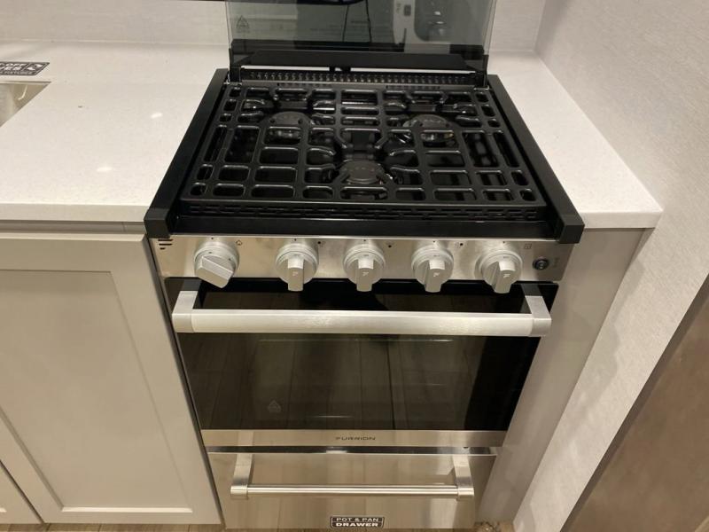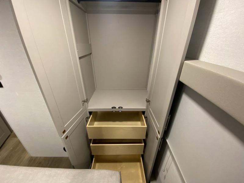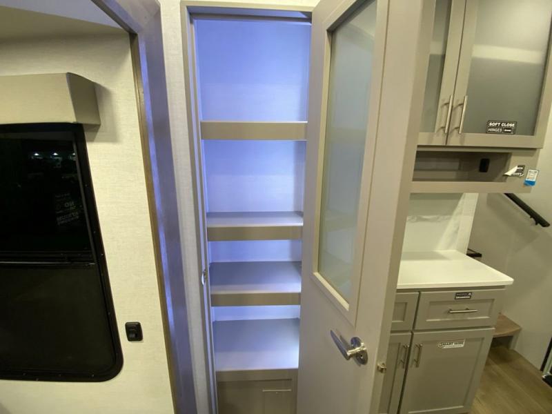 This fifth wheel is ready for adventure when you are! Once you arrive at the campground, you can put out the 16' awning, then start lunch on the exterior griddle. A booth dinette and theater sofa provide seating space inside, and there is a 50" Class HDTV to enjoy movies. The chef will also love the interior kitchen with its ample counter space, and there is plenty of storage with a hutch/pantry, second pantry, and 10 cu. ft. 12V refrigerator. Freshen up in the full bath before heading off to bed in the front private bedroom. Here, you'll find a queen bed, dual nightstands and overhead storage, plus a wardrobe with washer and dryer prep if you choose to add those appliances!