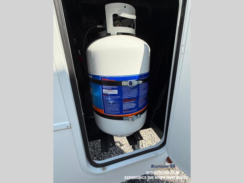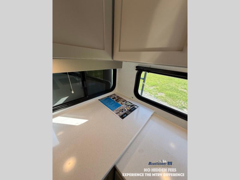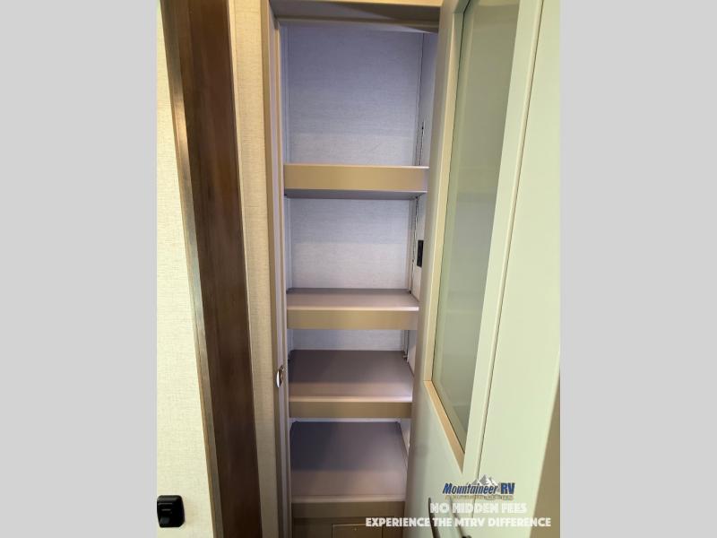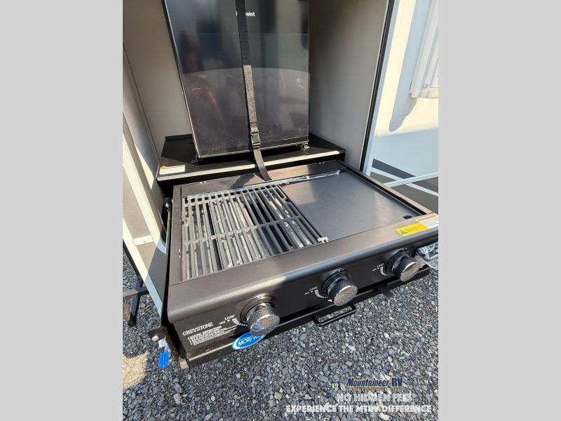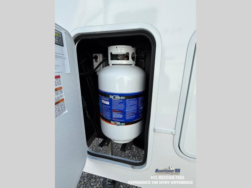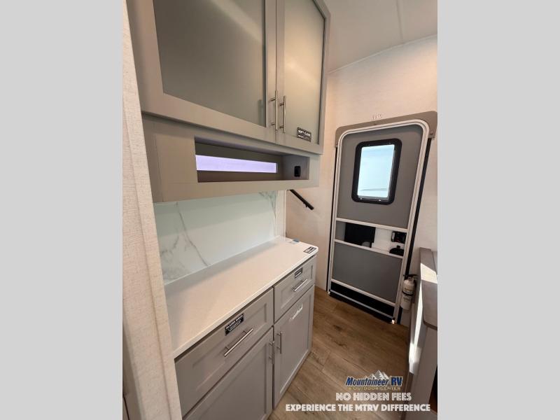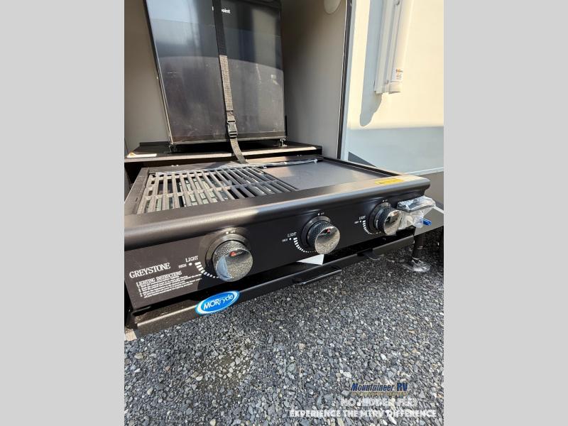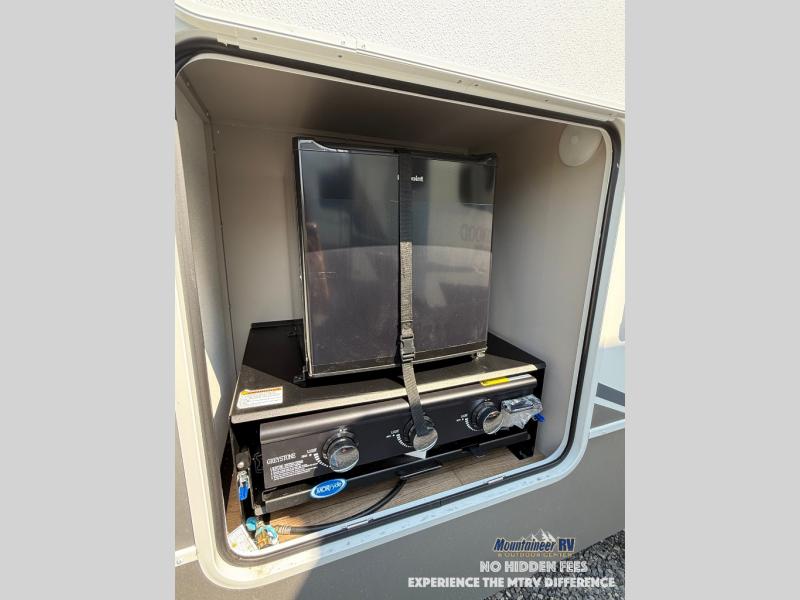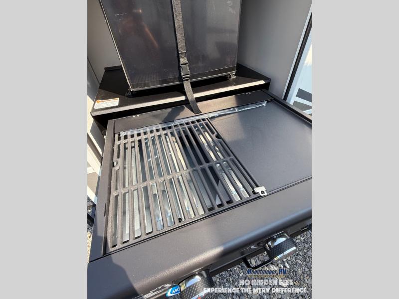 This fifth wheel is ready for adventure when you are! Once you arrive at the campground, you can put out the 16' awning, then start lunch on the exterior griddle. A booth dinette and theater sofa provide seating space inside, and there is a 50" Class HDTV to enjoy movies. The chef will also love the interior kitchen with its ample counter space, and there is plenty of storage with a hutch/pantry, second pantry, and 10 cu. ft. 12V refrigerator. Freshen up in the full bath before heading off to bed in the front private bedroom. Here, you'll find a queen bed, dual nightstands and overhead storage, plus a wardrobe with washer and dryer prep if you choose to add those appliances!