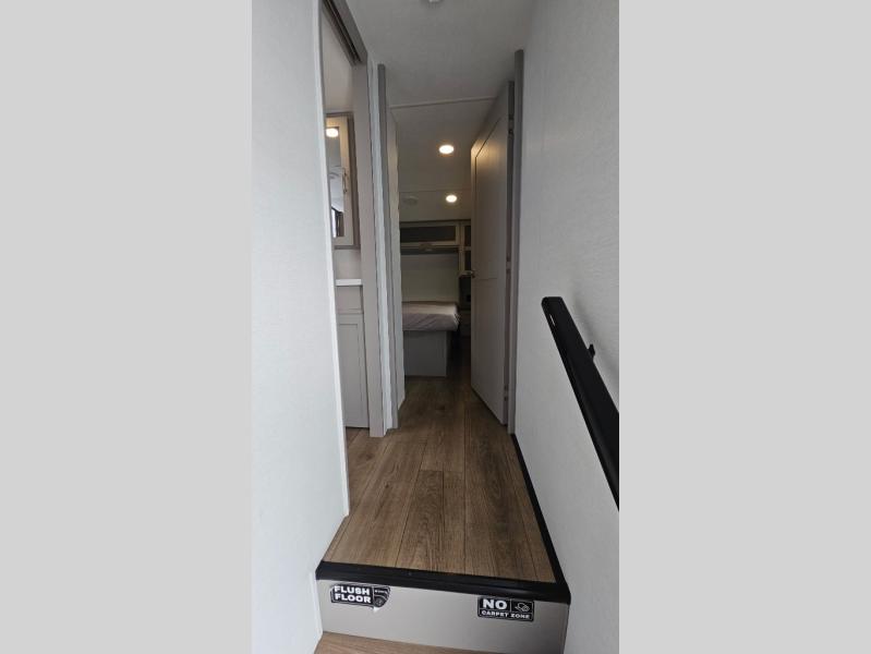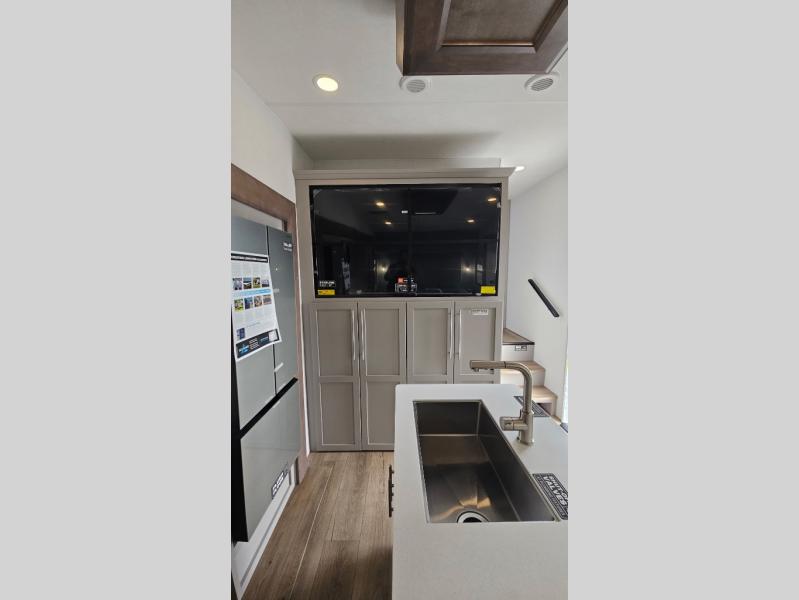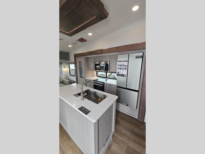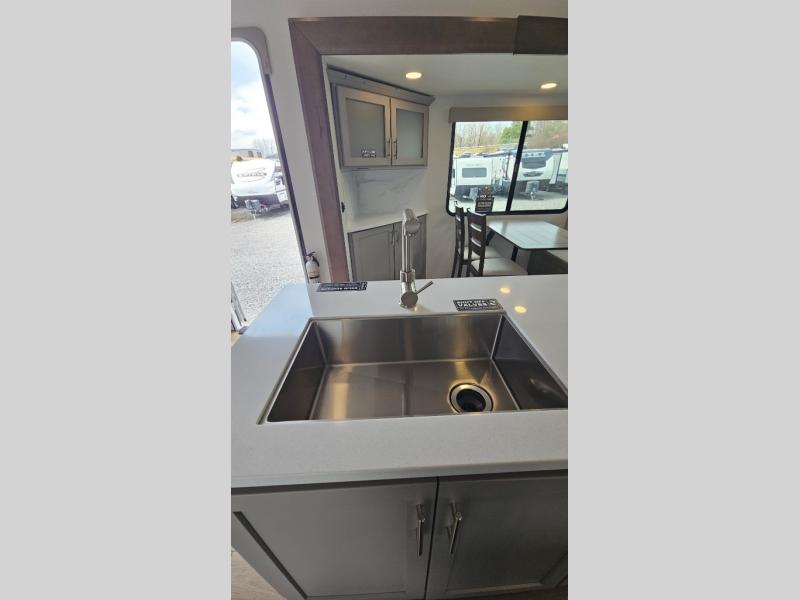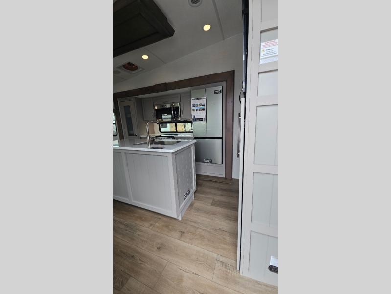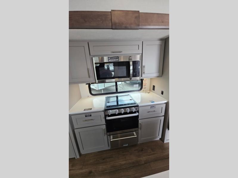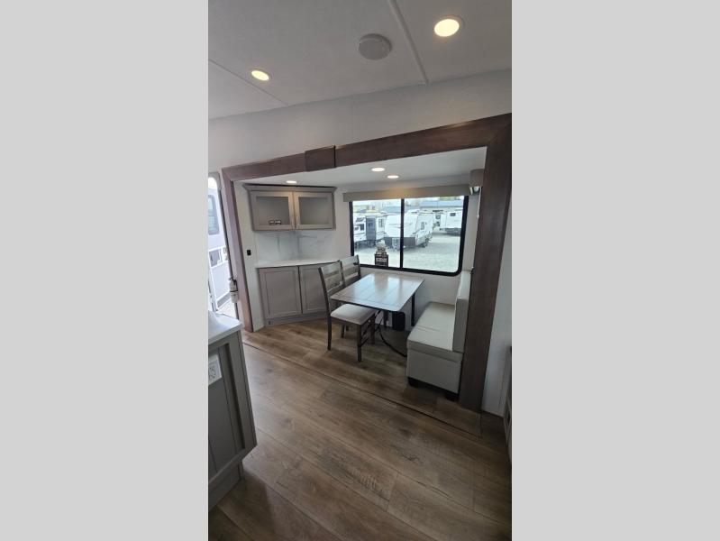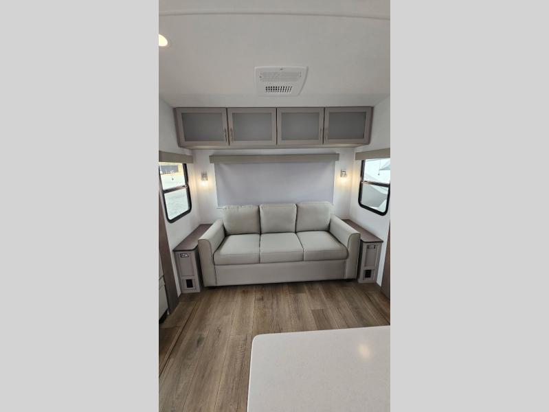 Perfect for families, couples, and travelers who crave space and style. The heart of this fifth wheel is the spacious living area, featuring a tri-fold sleeper sofa that's perfect for lounging and sleeping. Gather around the table with chairs and a bench for meals or socializing. The kitchen is fully equipped with a kitchen island, pantry, hutch, and overhead cabinets, providing ample storage and counter space. The microwave and 10 cu 12V refrigerator ensure that meal preparation and storage are convenient and easy. The full bathroom offers a private space for personal care, ensuring a comfortable and refreshing experience, and the front bedroom is a peaceful retreat, featuring a queen bed, nightstands, and overhead storage.
