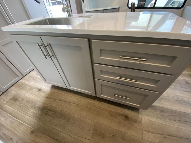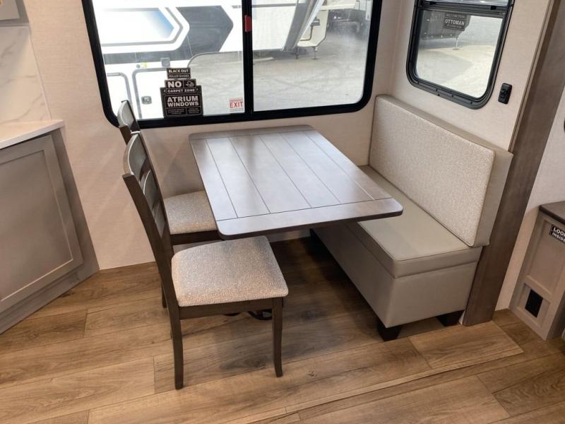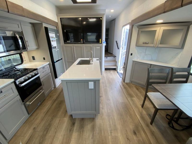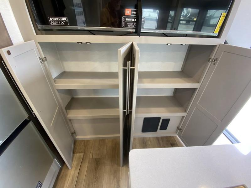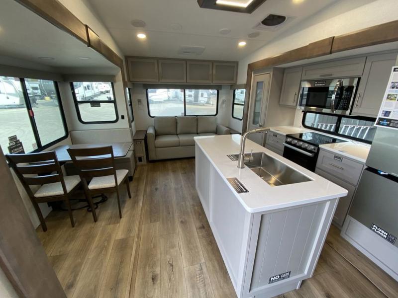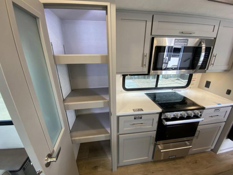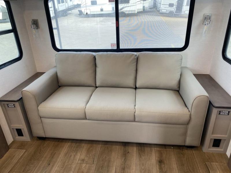 Perfect for families, couples, and travelers who crave space and style. The heart of this fifth wheel is the spacious living area, featuring a tri-fold sleeper sofa that's perfect for lounging and sleeping. Gather around the table with chairs and a bench for meals or socializing. The kitchen is fully equipped with a kitchen island, pantry, hutch, and overhead cabinets, providing ample storage and counter space. The microwave and 10 cu 12V refrigerator ensure that meal preparation and storage are convenient and easy. The full bathroom offers a private space for personal care, ensuring a comfortable and refreshing experience, and the front bedroom is a peaceful retreat, featuring a queen bed, nightstands, and overhead storage.