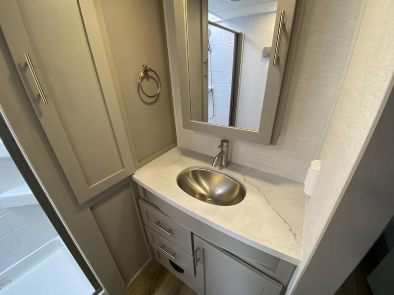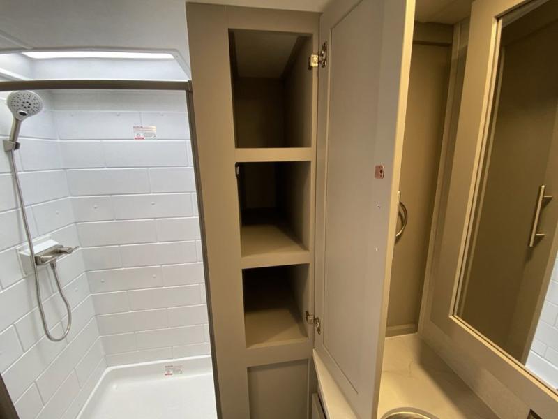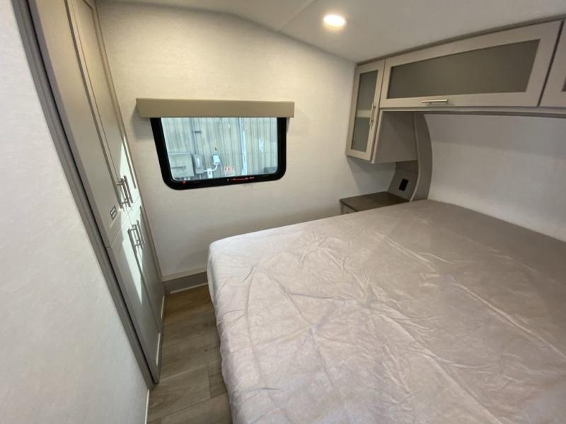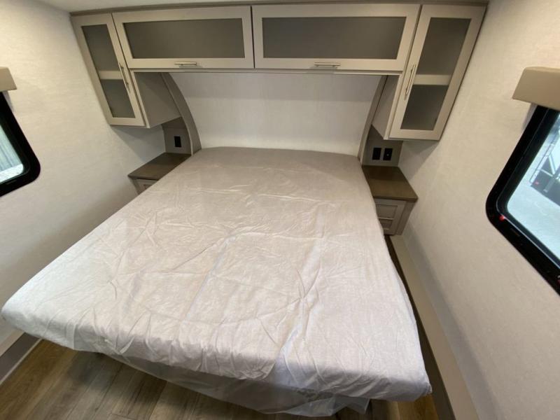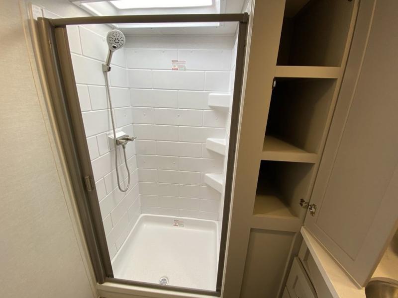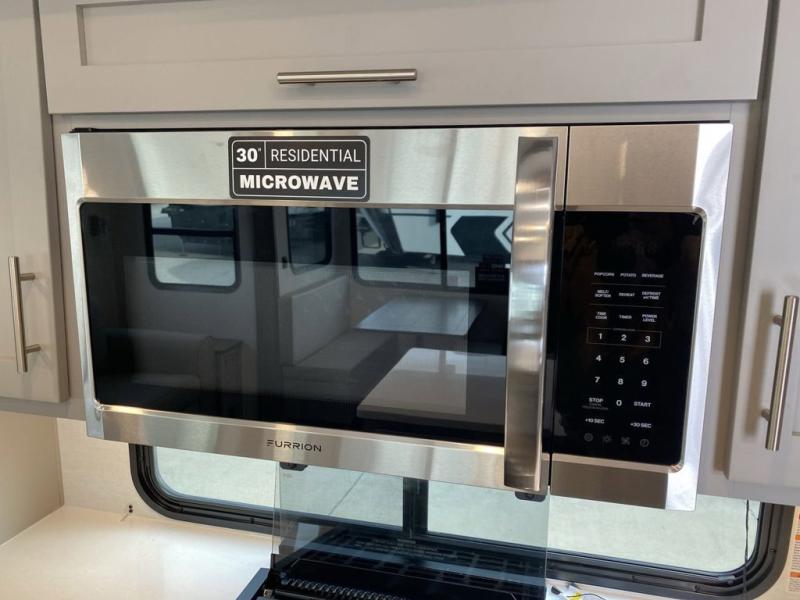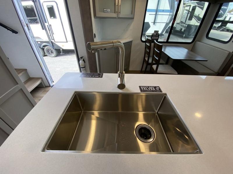 Perfect for families, couples, and travelers who crave space and style. The heart of this fifth wheel is the spacious living area, featuring a tri-fold sleeper sofa that's perfect for lounging and sleeping. Gather around the table with chairs and a bench for meals or socializing. The kitchen is fully equipped with a kitchen island, pantry, hutch, and overhead cabinets, providing ample storage and counter space. The microwave and 10 cu 12V refrigerator ensure that meal preparation and storage are convenient and easy. The full bathroom offers a private space for personal care, ensuring a comfortable and refreshing experience, and the front bedroom is a peaceful retreat, featuring a queen bed, nightstands, and overhead storage.