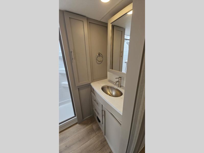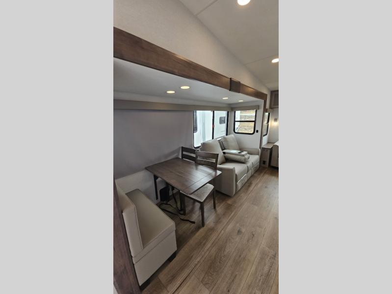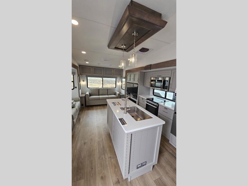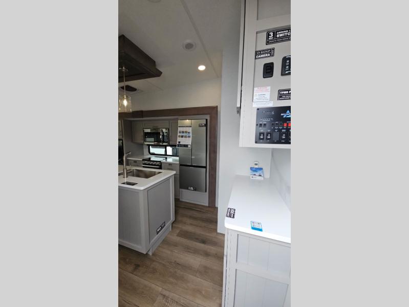 A benchmark chassis creates a space saver upper deck with each one of these Avenue All-Access fifth wheels by Alliance RV! The 101 in. wide-body construction gives you more room to walk around and the flush slide out floors throughout prevent any tripping. There are Azdel composite sidewalls inside and out, and a seamless fully walkable PVC roof for extreme durability and zero maintenance. You are sure to love no carpet throughout making each Avenue All-Access easy to clean and allergen free, not to mention pet friendly. You can maximize your space throughout with innovative storage solutions like the hidden storage behind the TV, inside the end tables, ottoman, and dinette chairs. These units also include the OTG Solar Package with a 200 watt solar panel, 15 amp MPPT charger, multiple outlets, and more to keep you powered up!