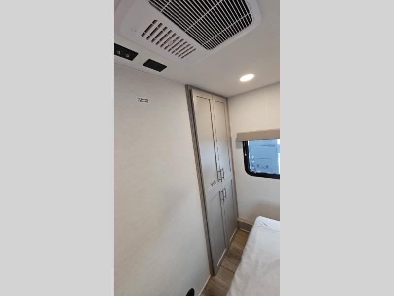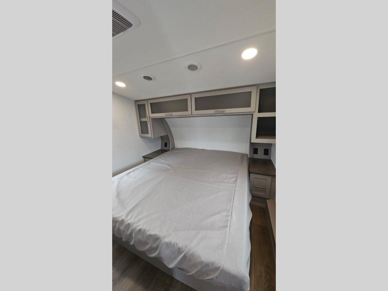 For the couple that enjoys adventures, this rear living coach has everything you need to travel comfortably and take along a couple of friends! The front private bedroom has a queen bed with nightstands on either side for your personal belongings, and a wardrobe to keep your clothes looking nice. Freshen up each morning in the full bathroom with a 30" x 36" shower, and grab a towel stored close by in the linen closet. Now that you're ready for the day, you can head to the kitchen and create a hearty breakfast with the full kitchen amenities. You will appreciate having a 10 cu. ft. 12V refrigerator and three burner cooktop, plus there is a center island with plenty of counter space and a sink to make food prep even easier. Spend your evenings in true relaxation in the dual recliner theater seats across from the swing mount 50" HDTV with hidden storage behind. You will also love the pantry and hutch in the kitchen area for storing all of your dishes and non-perishables. Dine at the floating table with two chairs along with a moveable ottoman featuring storage.