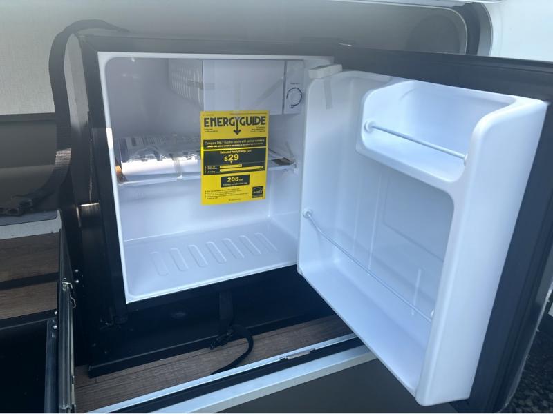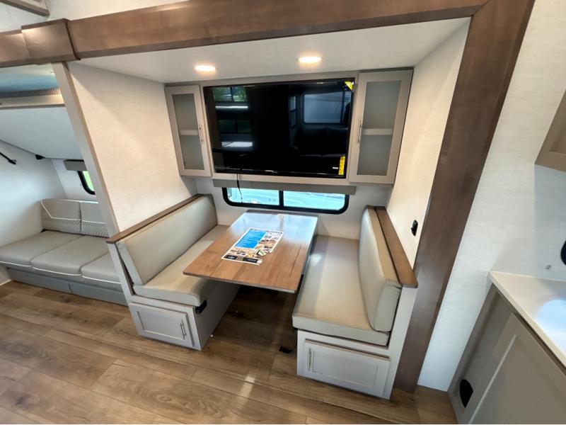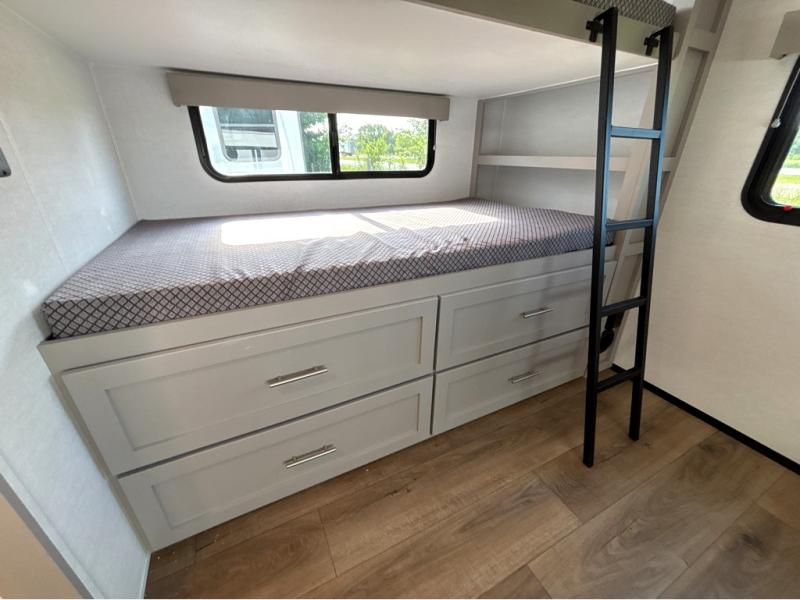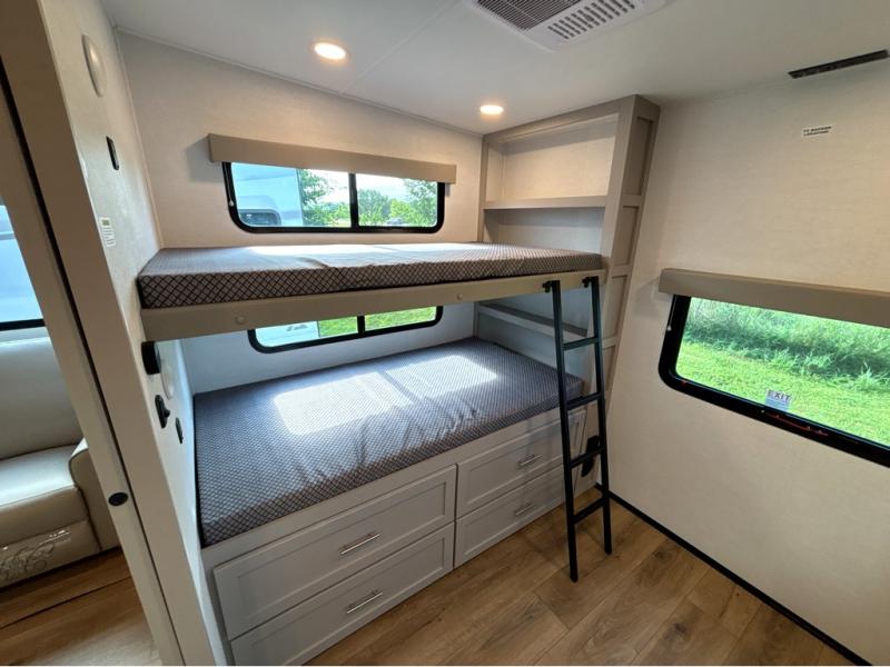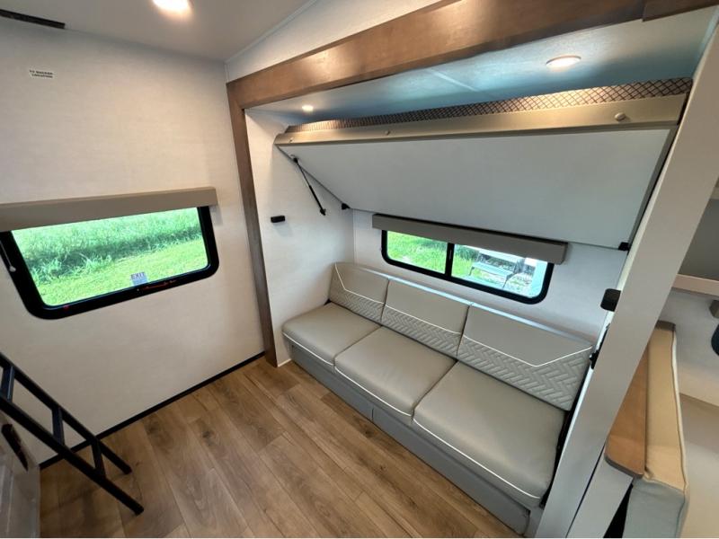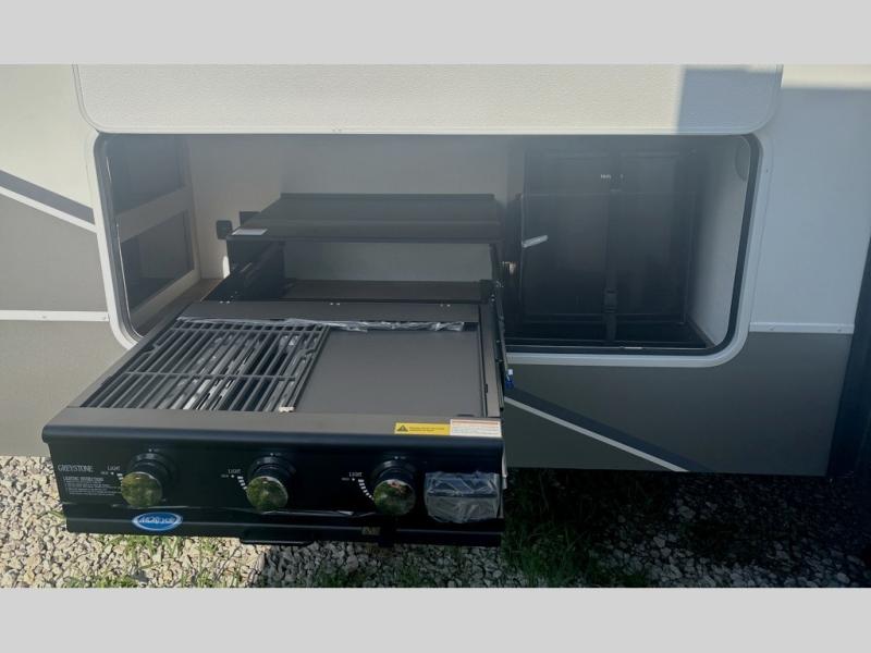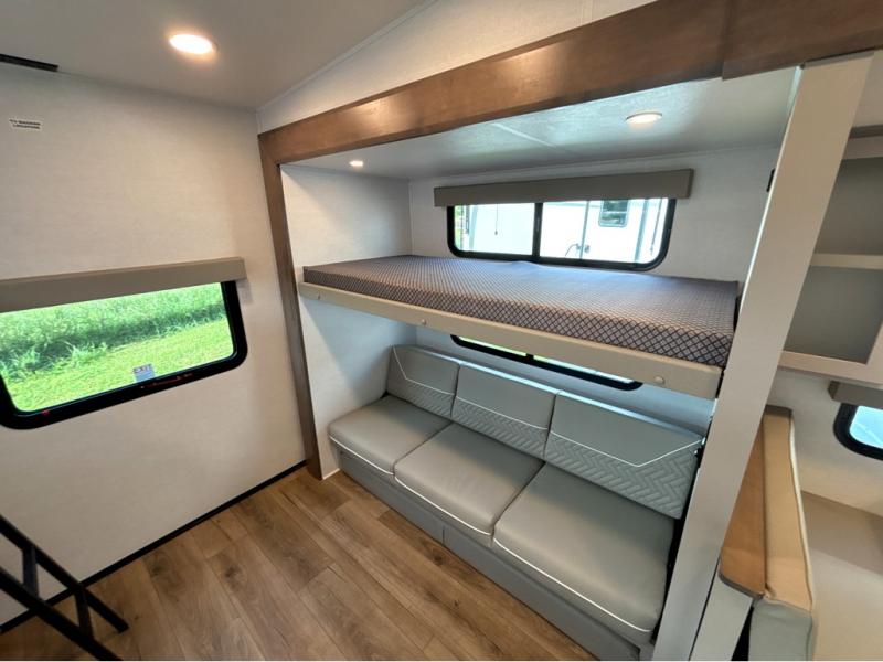 If you've been searching for a fifth wheel with more sleeping space, this is the one! You will find a queen bed in the front private bedroom, along with a wardrobe with washer and dryer prep and overhead storage for your things. Your guests can take the rear bunkhouse that includes 40" x 72" bunks across from a slide out with a flip-up bunk and cube sofa below. Everyone can meet in the middle living area and kitchen to relax on the sofa that is in direct view of the 50" Class HDTV. There is also a booth dinette table here to dine together. If the weather is nice, you may just find yourselves outdoors since there are two awnings and an exterior griddle!