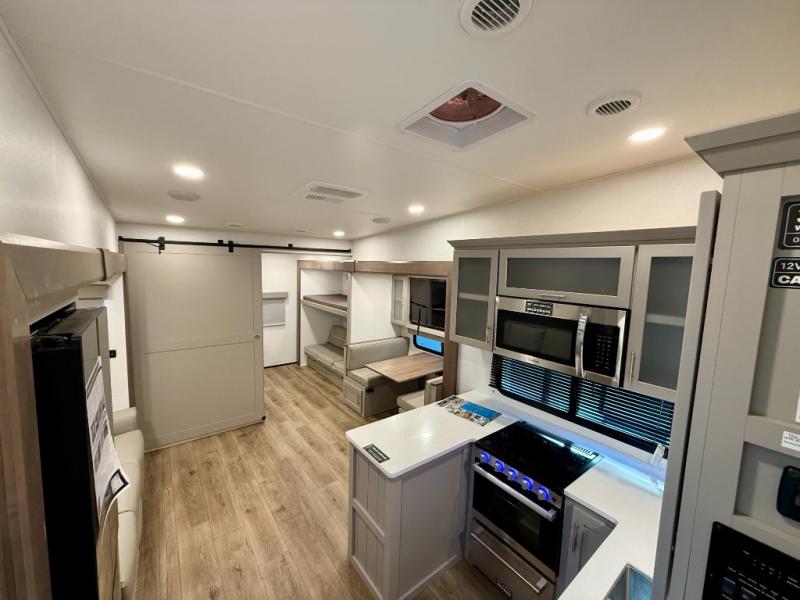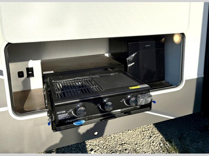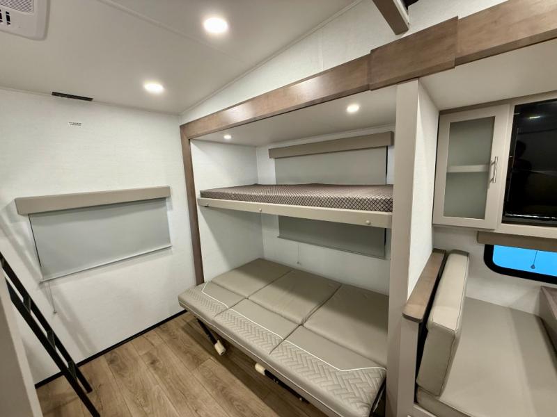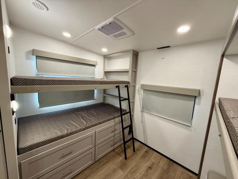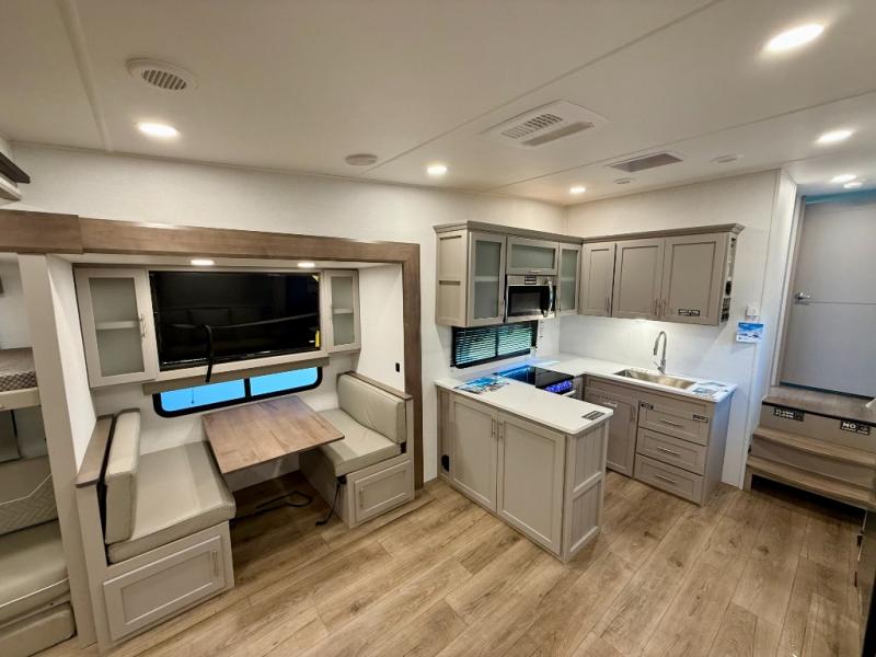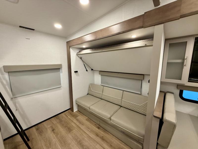 If you've been searching for a fifth wheel with more sleeping space, this is the one! You will find a queen bed in the front private bedroom, along with a wardrobe with washer and dryer prep and overhead storage for your things. Your guests can take the rear bunkhouse that includes 40" x 72" bunks across from a slide out with a flip-up bunk and cube sofa below. Everyone can meet in the middle living area and kitchen to relax on the sofa that is in direct view of the 50" Class HDTV. There is also a booth dinette table here to dine together. If the weather is nice, you may just find yourselves outdoors since there are two awnings and an exterior griddle!