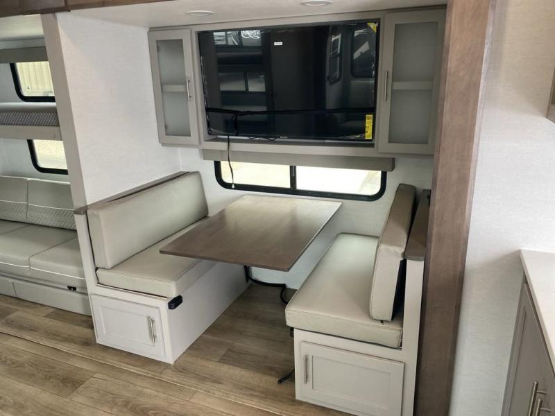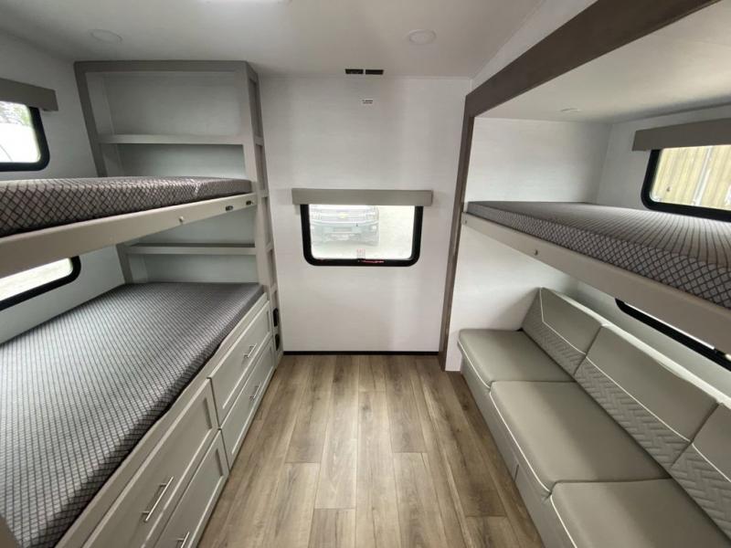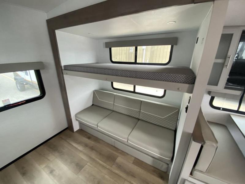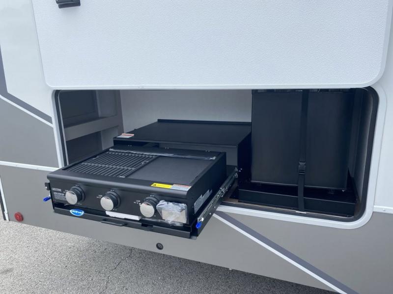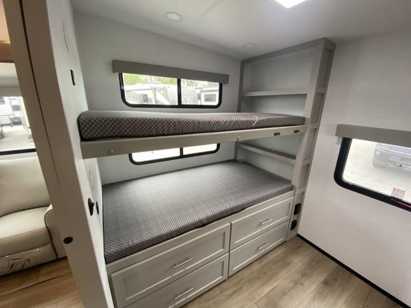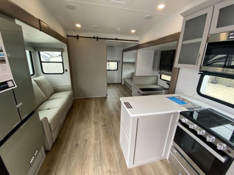 If you've been searching for a fifth wheel with more sleeping space, this is the one! You will find a queen bed in the front private bedroom, along with a wardrobe with washer and dryer prep and overhead storage for your things. Your guests can take the rear bunkhouse that includes 40" x 72" bunks across from a slide out with a flip-up bunk and cube sofa below. Everyone can meet in the middle living area and kitchen to relax on the sofa that is in direct view of the 50" Class HDTV. There is also a booth dinette table here to dine together. If the weather is nice, you may just find yourselves outdoors since there are two awnings and an exterior griddle!
