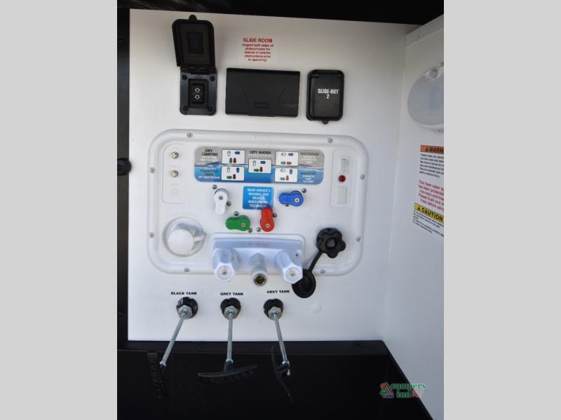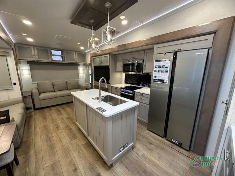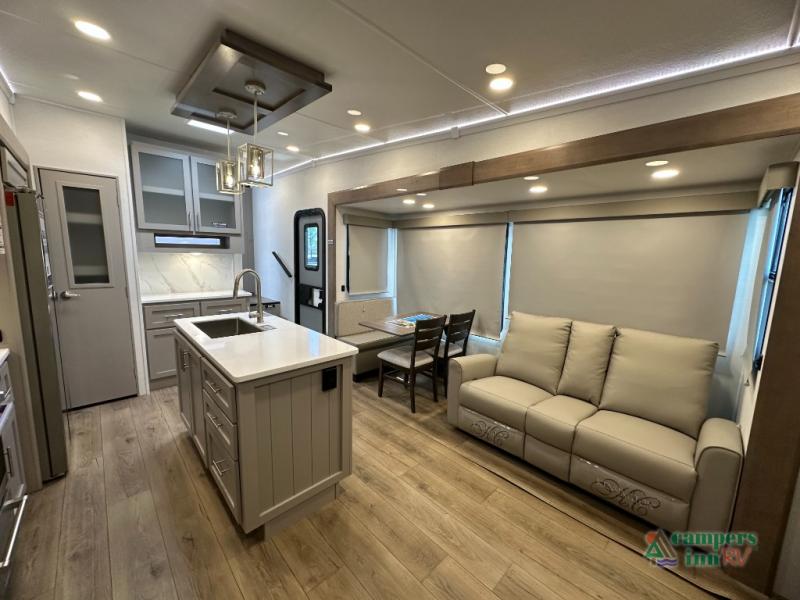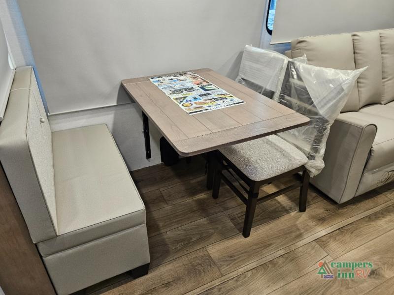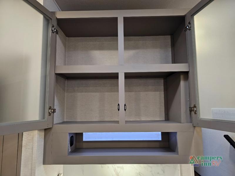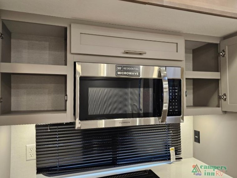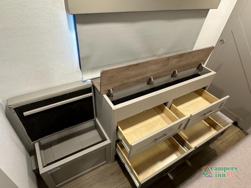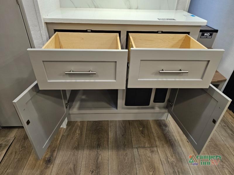 A kitchen island with countertop space makes it easy to prepare meals in this fifth wheel! The floating dinette table has two chairs on one side and a movable ottoman with flip up storage on the other side to keep your games or extra table cloths in. You can store your dishes and snacks inside the hutch/pantry or in the second pantry. The front private bedroom has a queen bed slide but can be switched out for the optional king bed if you like. There is also a dresser and large wardrobe for storage, and either side of the wardrobe with washer and dryer prep. The rear living area features a dual recliner theater seat across from an entertainment center with a 50" class HDTV with hidden storage behind it, and is also on a swing mount for all to see even at the rear sleeper sofa!