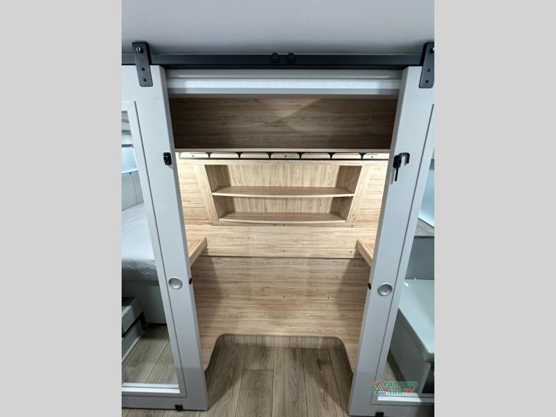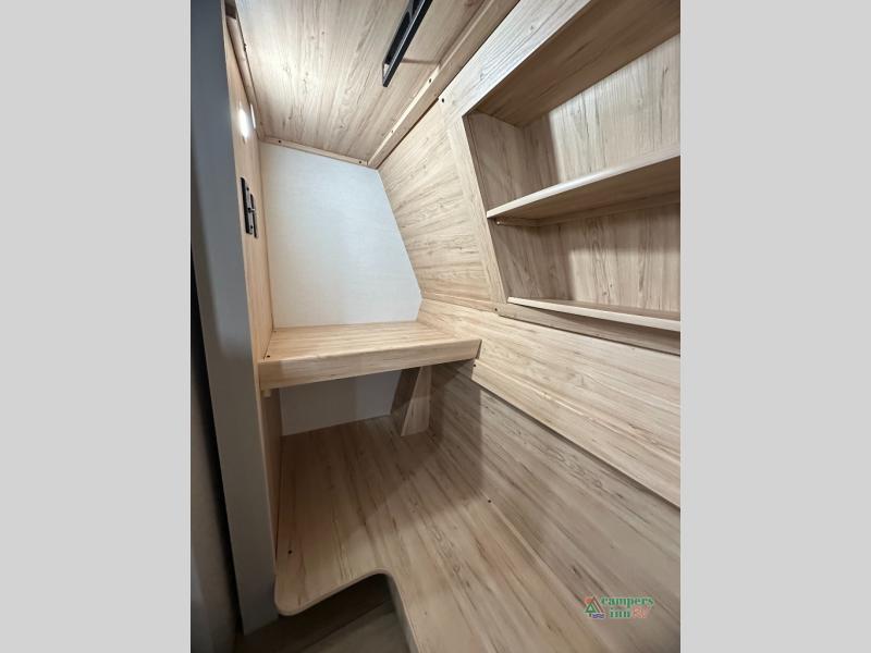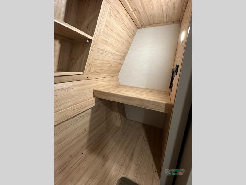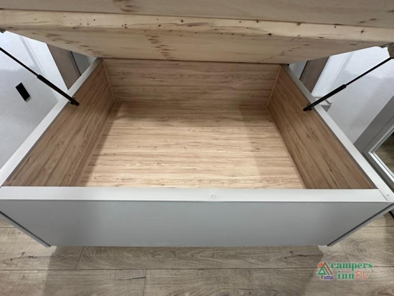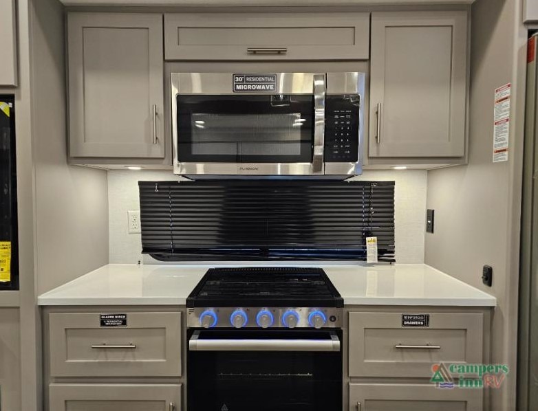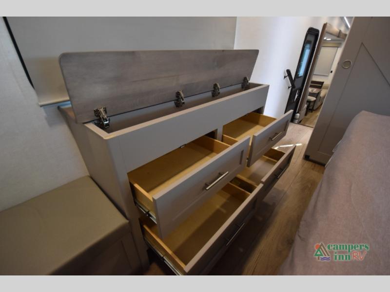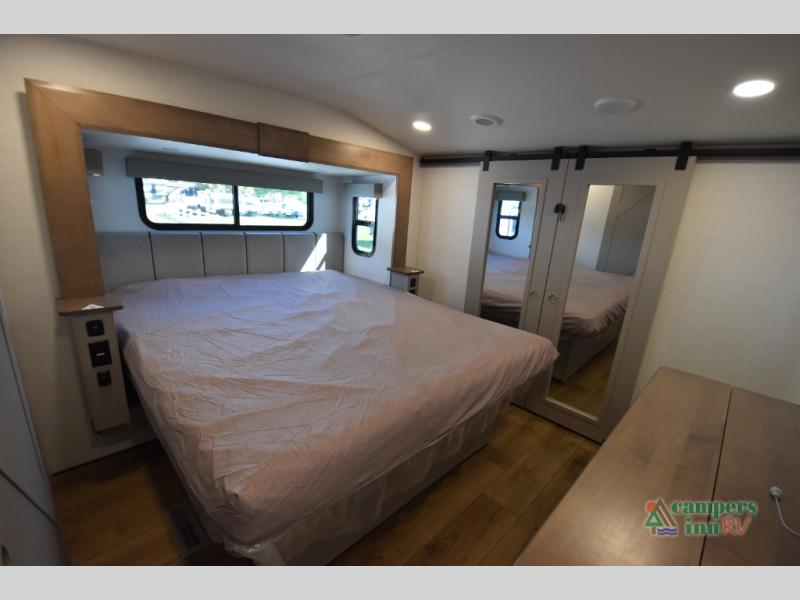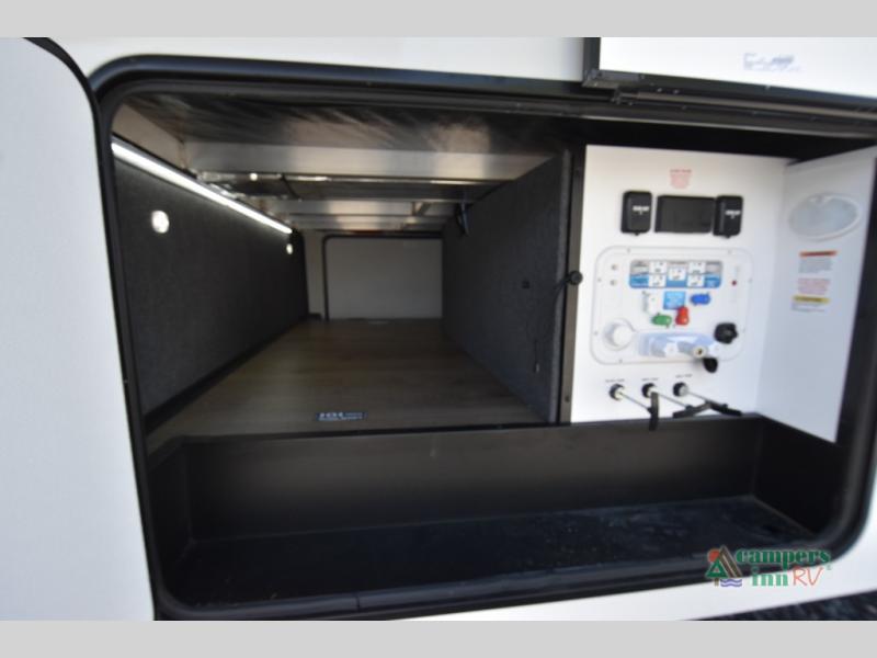 A kitchen island with countertop space makes it easy to prepare meals in this fifth wheel! The floating dinette table has two chairs on one side and a movable ottoman with flip up storage on the other side to keep your games or extra table cloths in. You can store your dishes and snacks inside the hutch/pantry or in the second pantry. The front private bedroom has a queen bed slide but can be switched out for the optional king bed if you like. There is also a dresser and large wardrobe for storage, and either side of the wardrobe with washer and dryer prep. The rear living area features a dual recliner theater seat across from an entertainment center with a 50" class HDTV with hidden storage behind it, and is also on a swing mount for all to see even at the rear sleeper sofa!