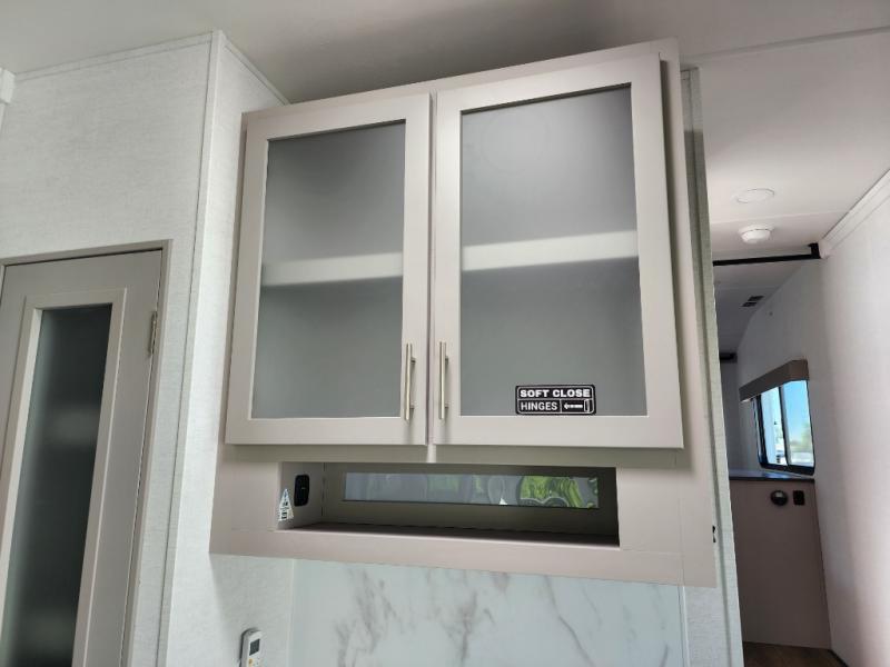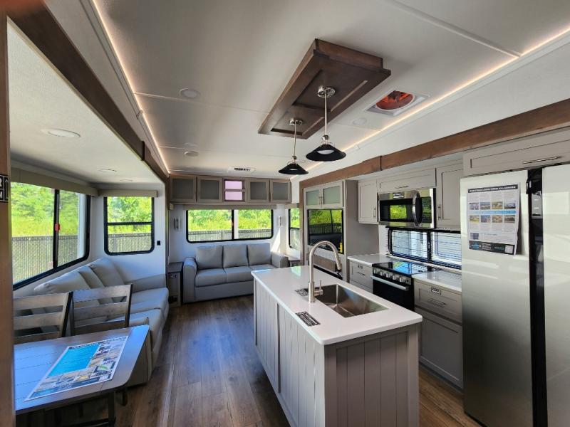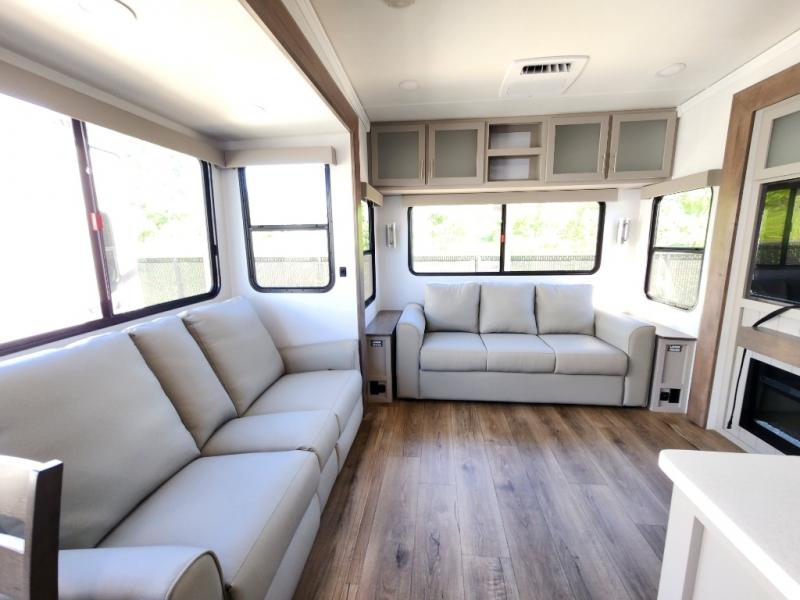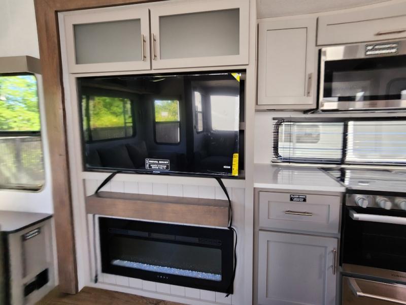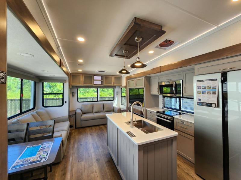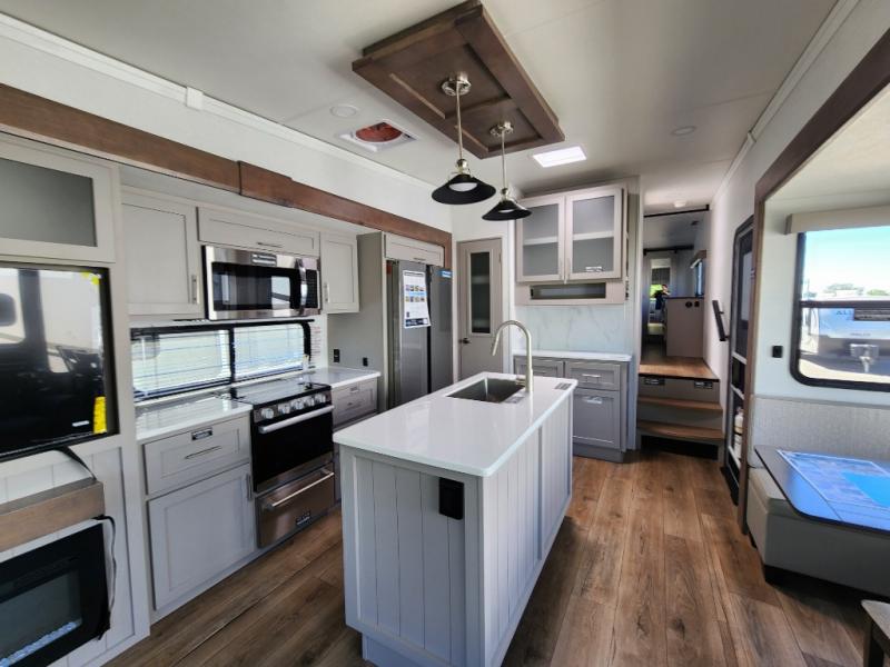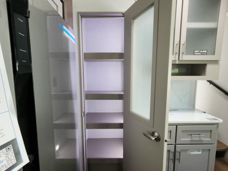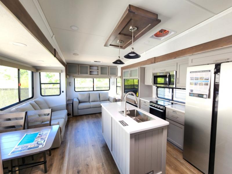 A kitchen island with countertop space makes it easy to prepare meals in this fifth wheel! The floating dinette table has two chairs on one side and a movable ottoman with flip up storage on the other side to keep your games or extra table cloths in. You can store your dishes and snacks inside the hutch/pantry or in the second pantry. The front private bedroom has a queen bed slide but can be switched out for the optional king bed if you like. There is also a dresser and large wardrobe for storage, and either side of the wardrobe with washer and dryer prep. The rear living area features a dual recliner theater seat across from an entertainment center with a 50" class HDTV with hidden storage behind it, and is also on a swing mount for all to see even at the rear sleeper sofa!