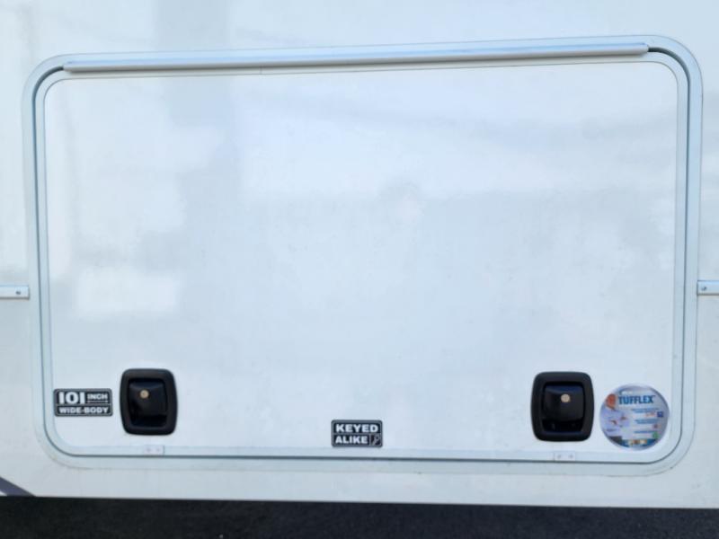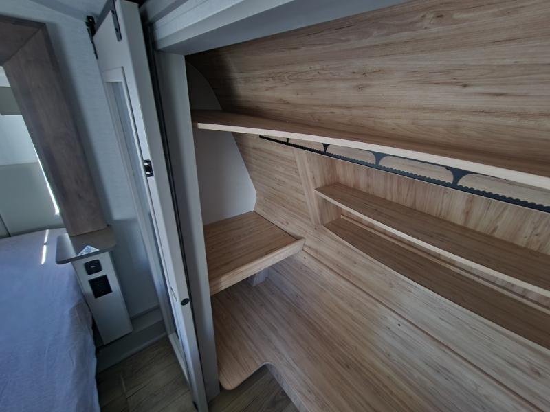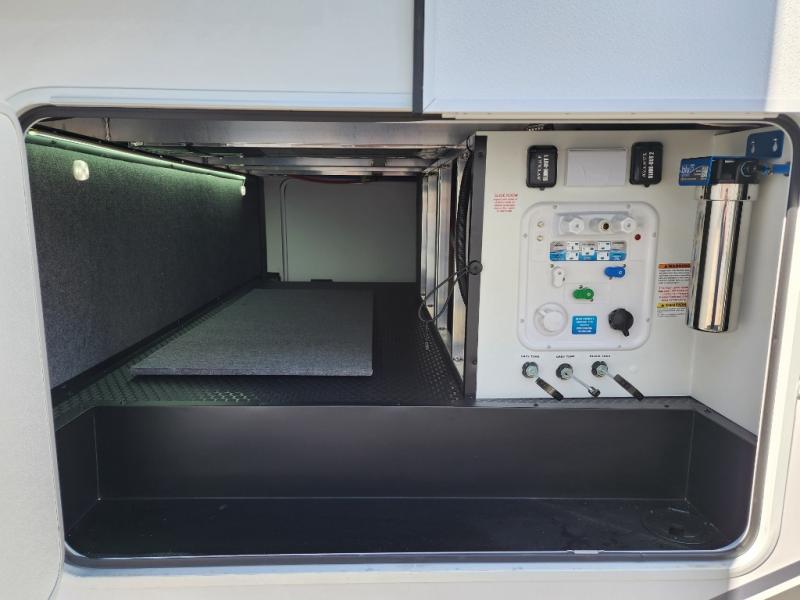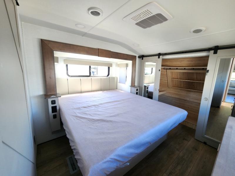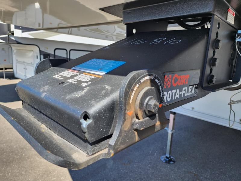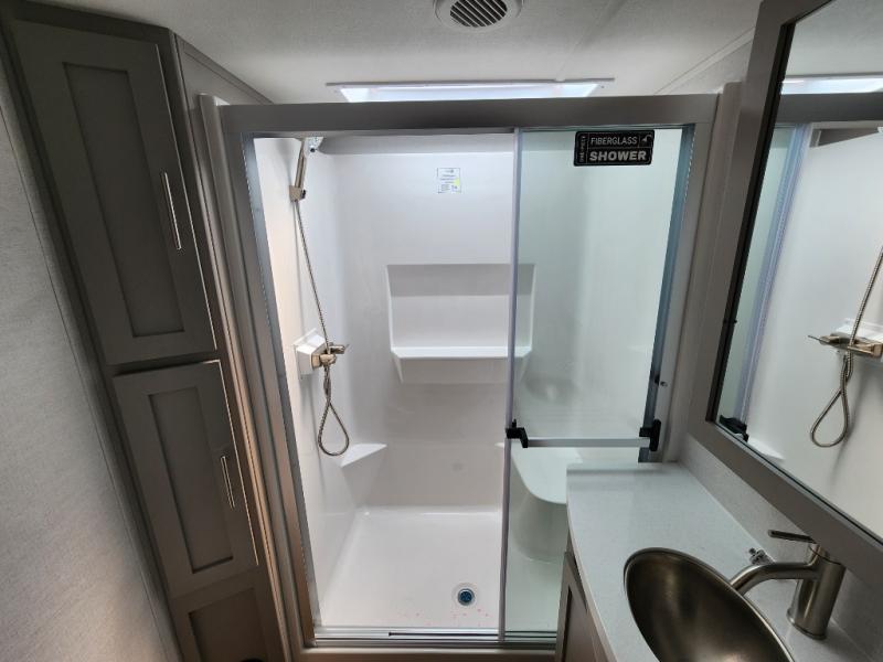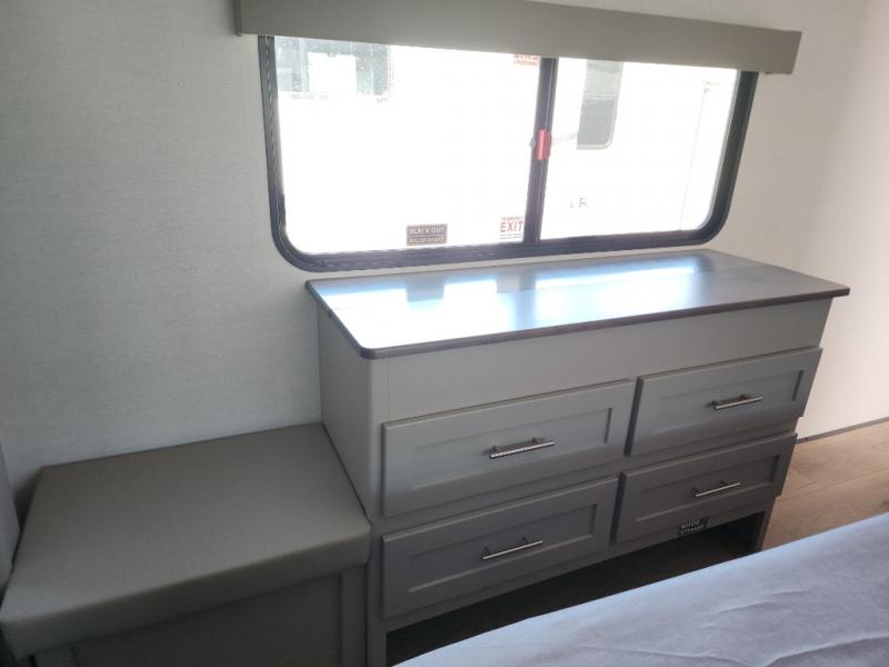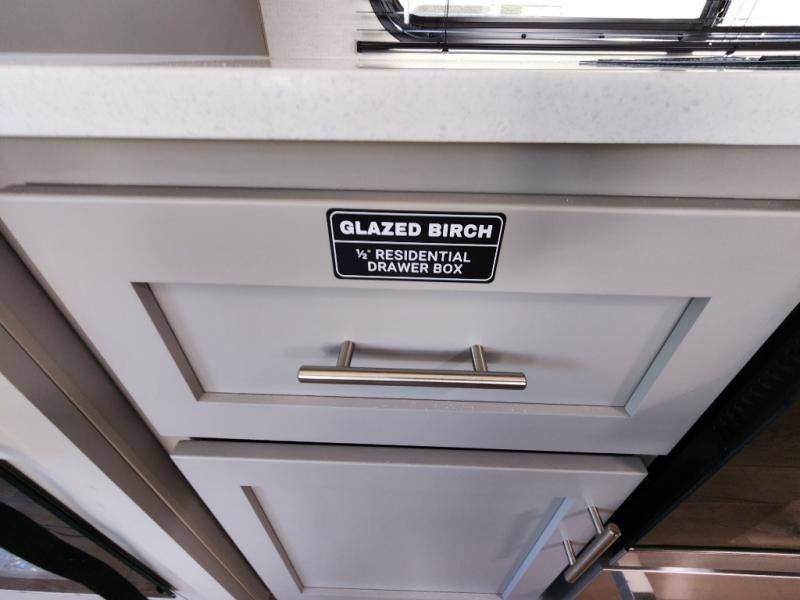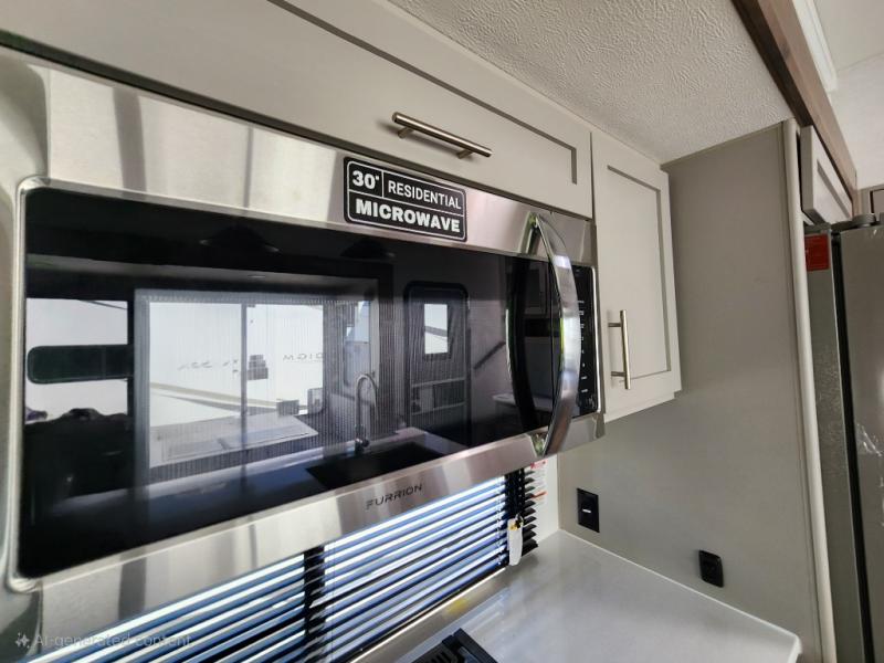 A kitchen island with countertop space makes it easy to prepare meals in this fifth wheel! The floating dinette table has two chairs on one side and a movable ottoman with flip up storage on the other side to keep your games or extra table cloths in. You can store your dishes and snacks inside the hutch/pantry or in the second pantry. The front private bedroom has a queen bed slide but can be switched out for the optional king bed if you like. There is also a dresser and large wardrobe for storage, and either side of the wardrobe with washer and dryer prep. The rear living area features a dual recliner theater seat across from an entertainment center with a 50" class HDTV with hidden storage behind it, and is also on a swing mount for all to see even at the rear sleeper sofa!