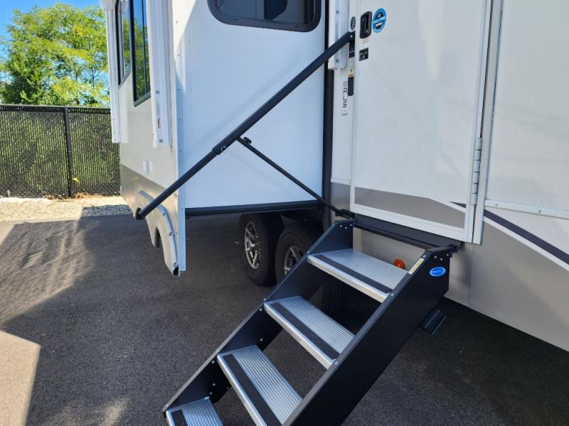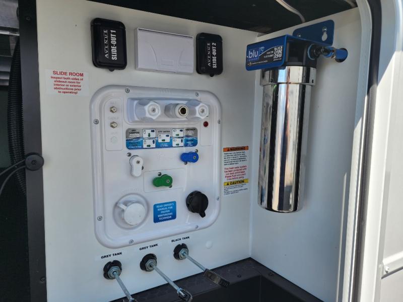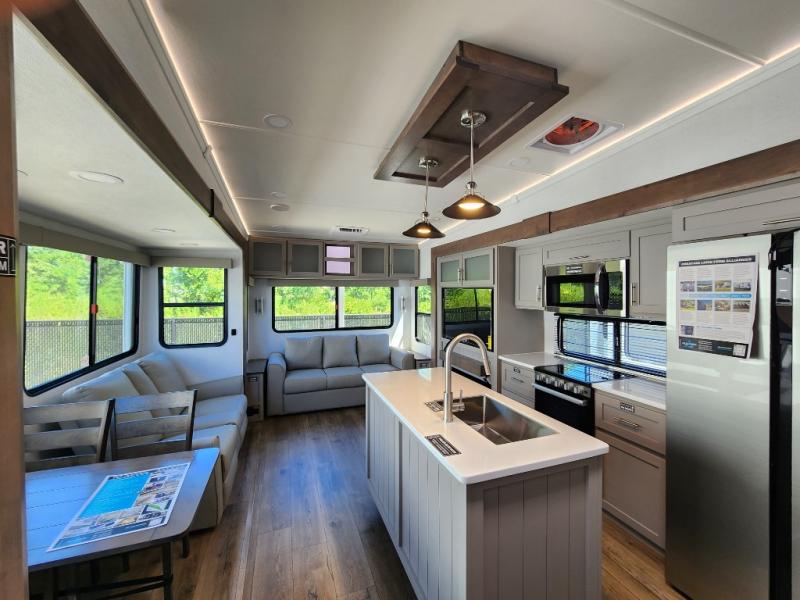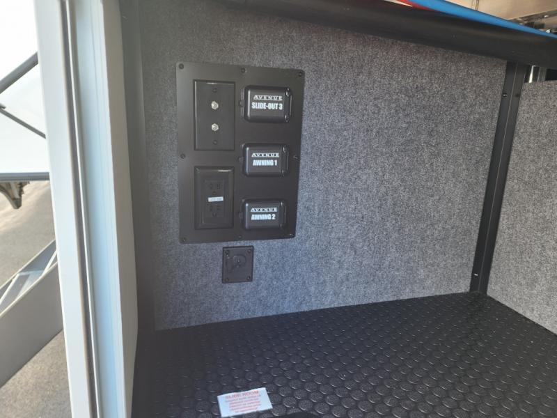 With any Avenue fifth wheel or travel trailer by Alliance RV, you will enjoy more interior space provided by the 8' 5" wide-body construction, and a long list of luxury features. Each is built with Azdel composite sidewalls both inside and out, along with a PVC roof for added strength. There are innovative storage solutions that include hidden storage behind the TV, within end tables and ottomans, and more. Since these units feature no carpet throughout, cleaning will be easier than ever, and there are flush floor slides throughout for seamless living spaces. The Avenue also comes with the OTG Solar Package with a 400 watt solar panel, inverter prep, multiple outlets, and more to keep you charged up!