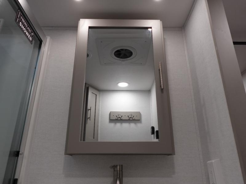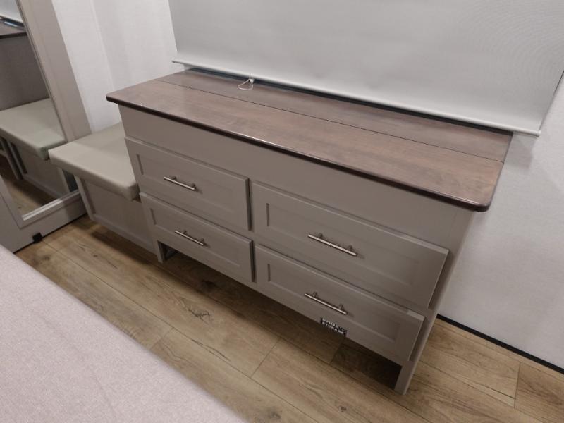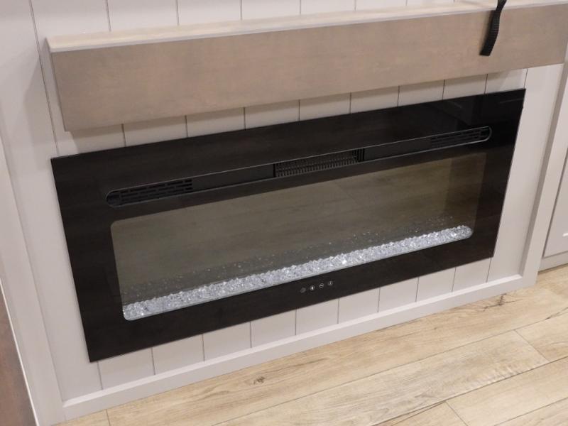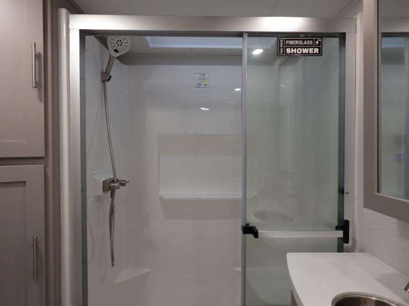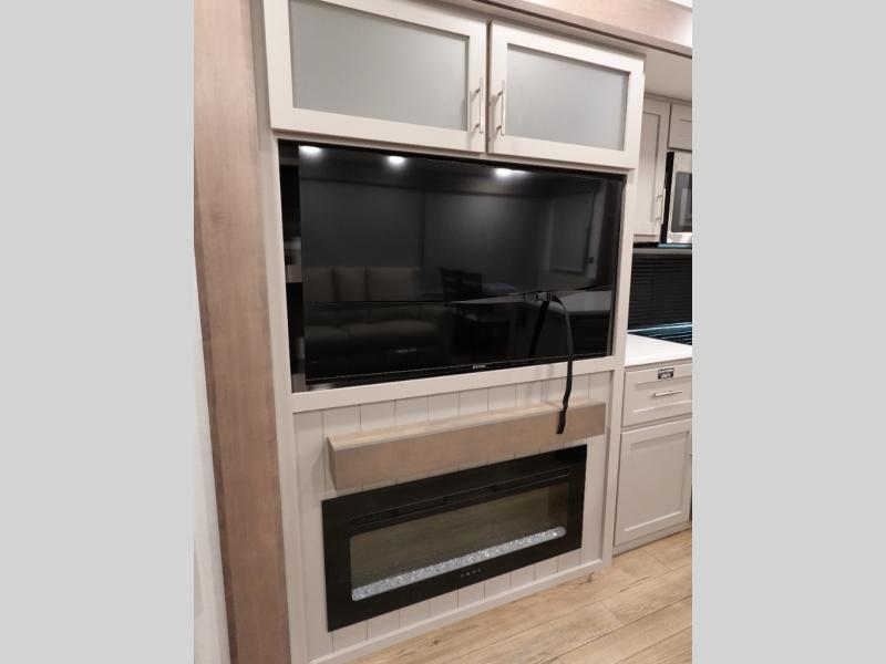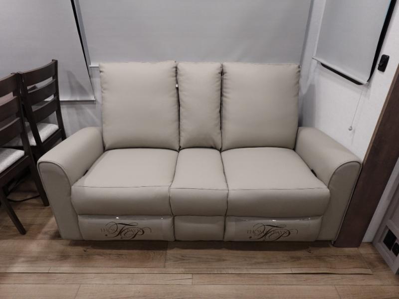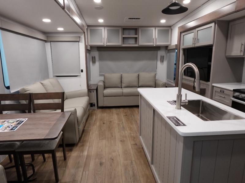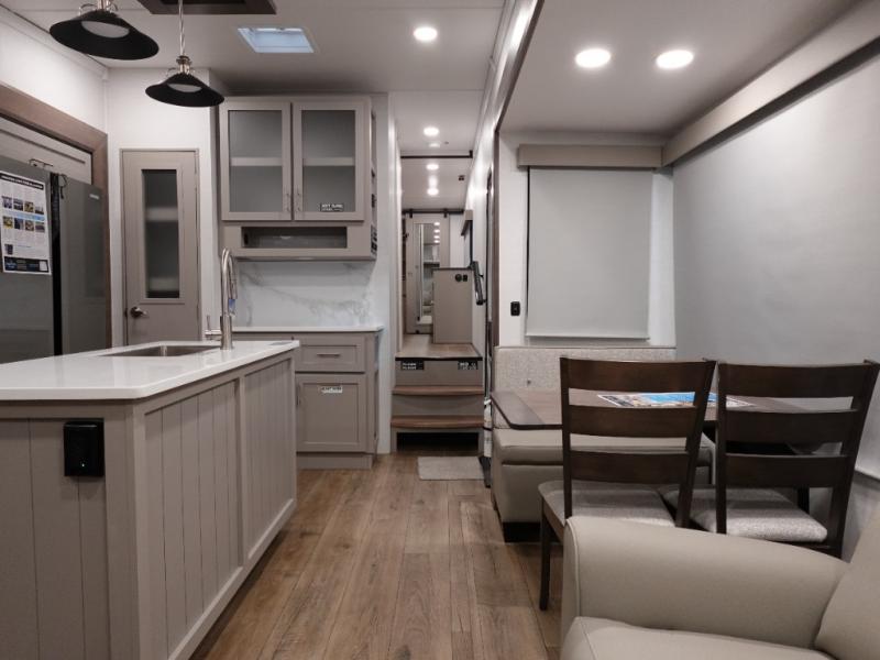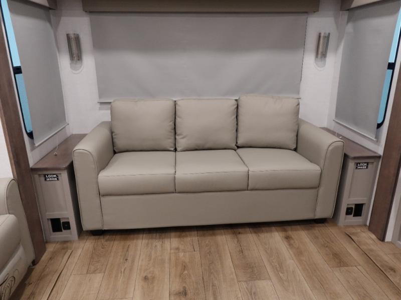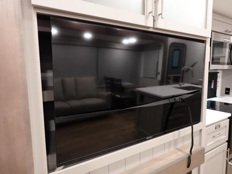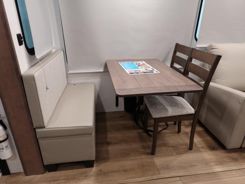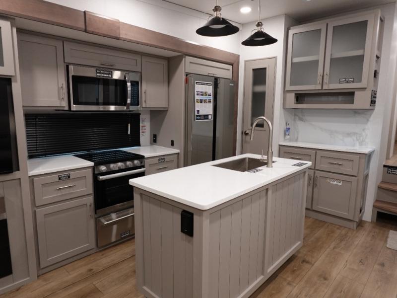 A kitchen island with countertop space makes it easy to prepare meals in this fifth wheel! The floating dinette table has two chairs on one side and a movable ottoman with flip up storage on the other side to keep your games or extra table cloths in. You can store your dishes and snacks inside the hutch/pantry or in the second pantry. The front private bedroom has a king bed slide. There is also a dresser and large wardrobe for storage, and either side of the wardrobe with washer and dryer prep. The rear living area features a dual recliner theater seat across from an entertainment center with a 50" class HDTV with hidden storage behind it, and is also on a swing mount for all to see even at the rear sleeper sofa!