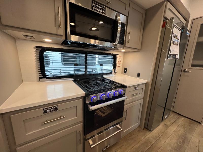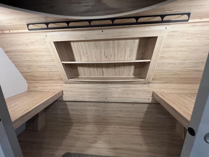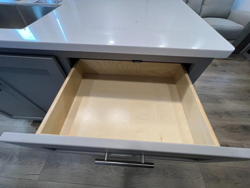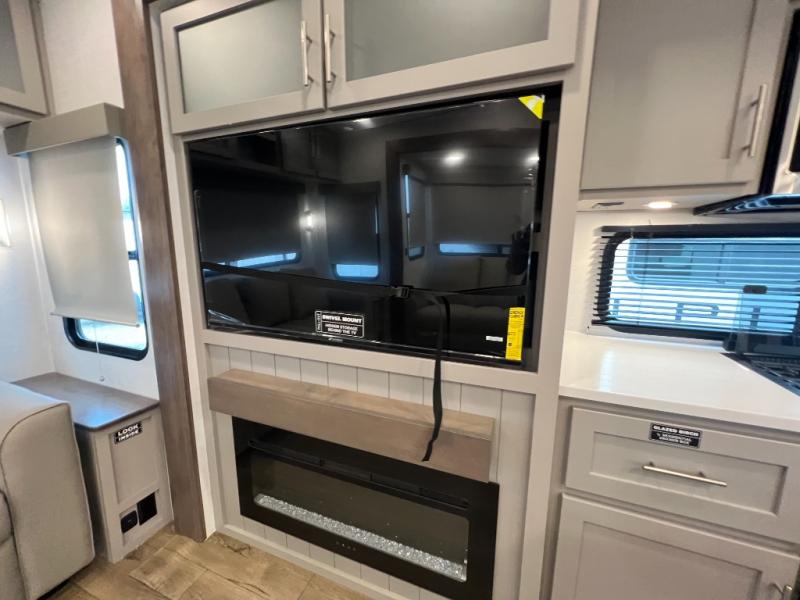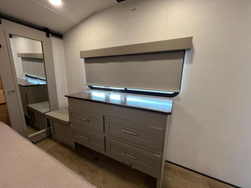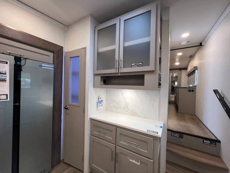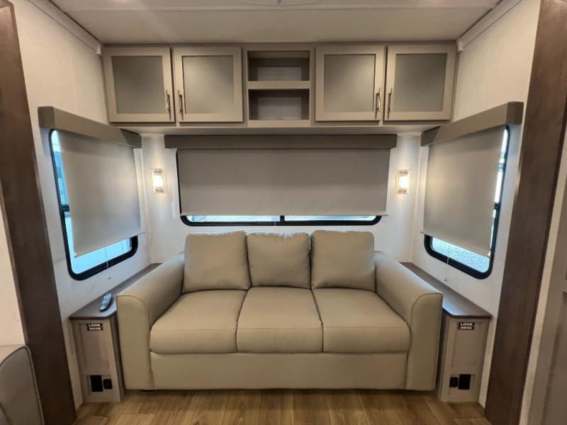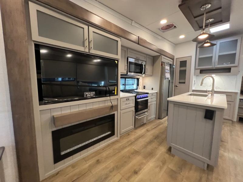 A kitchen island with countertop space makes it easy to prepare meals in this fifth wheel! The floating dinette table has two chairs on one side and a movable ottoman with flip up storage on the other side to keep your games or extra table cloths in. You can store your dishes and snacks inside the hutch/pantry or in the second pantry. The front private bedroom has a queen bed slide but can be switched out for the optional king bed if you like. There is also a dresser and large wardrobe for storage, and either side of the wardrobe with washer and dryer prep. The rear living area features a dual recliner theater seat across from an entertainment center with a 50" class HDTV with hidden storage behind it, and is also on a swing mount for all to see even at the rear sleeper sofa!