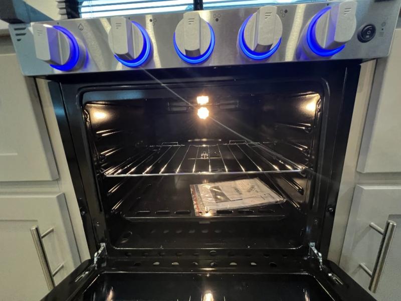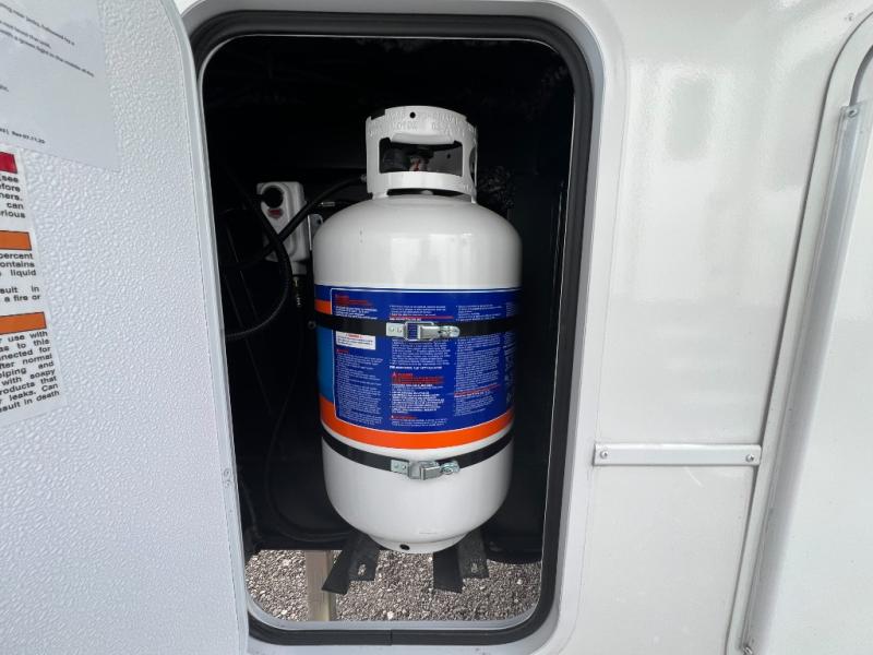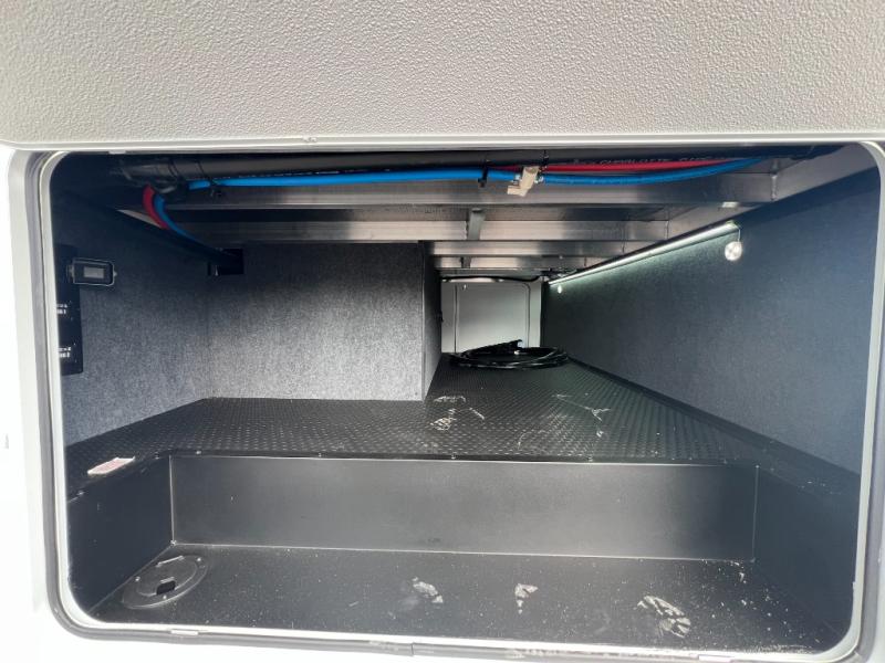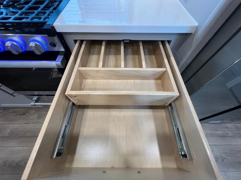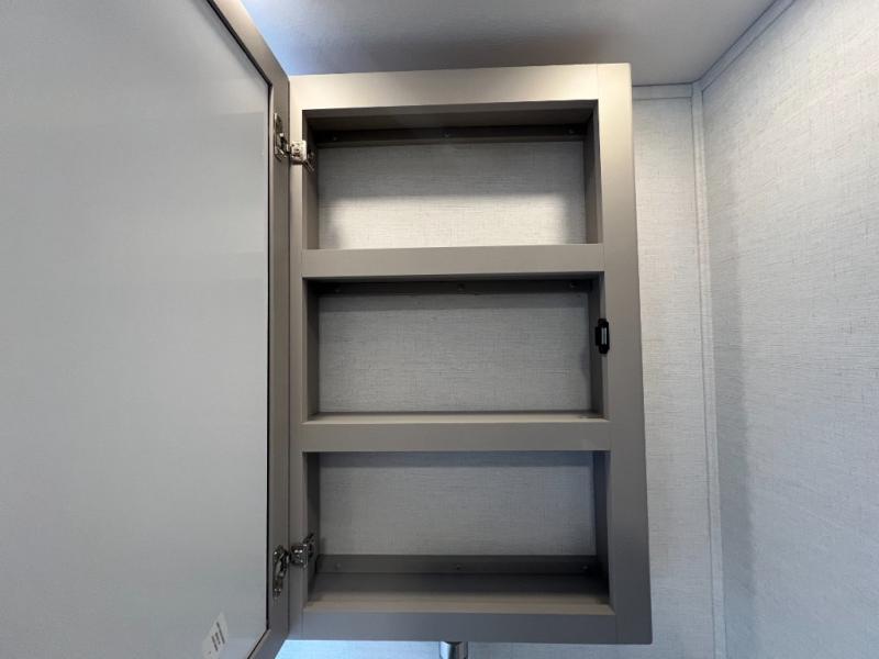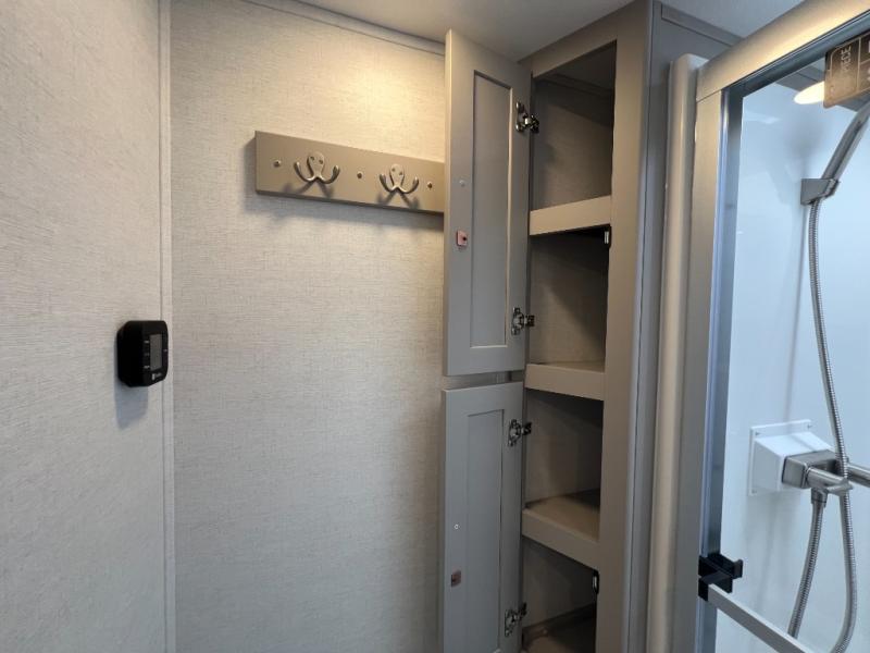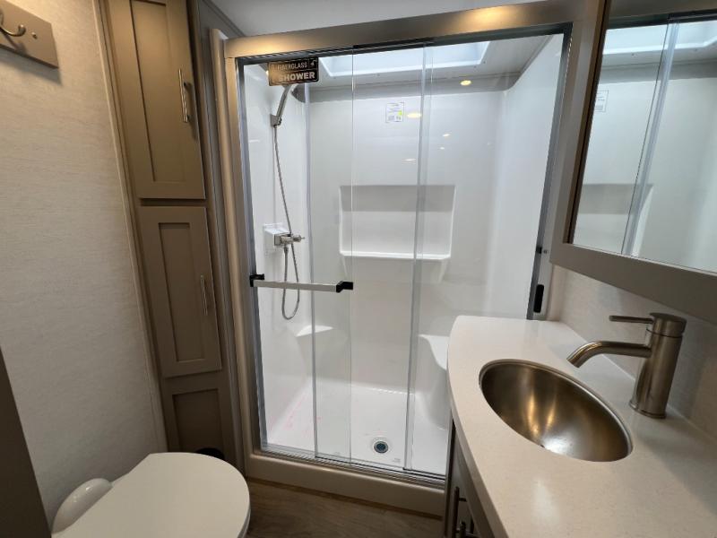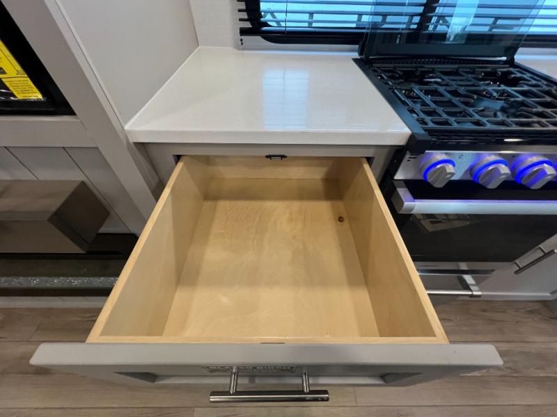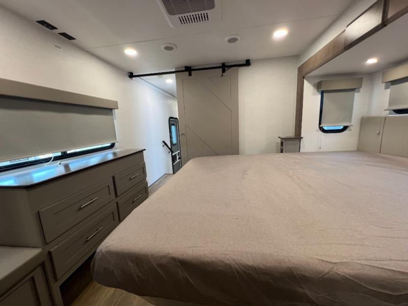 A kitchen island with countertop space makes it easy to prepare meals in this fifth wheel! The floating dinette table has two chairs on one side and a movable ottoman with flip up storage on the other side to keep your games or extra table cloths in. You can store your dishes and snacks inside the hutch/pantry or in the second pantry. The front private bedroom has a queen bed slide but can be switched out for the optional king bed if you like. There is also a dresser and large wardrobe for storage, and either side of the wardrobe with washer and dryer prep. The rear living area features a dual recliner theater seat across from an entertainment center with a 50" class HDTV with hidden storage behind it, and is also on a swing mount for all to see even at the rear sleeper sofa!