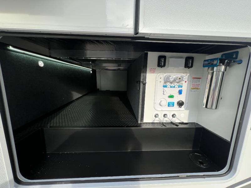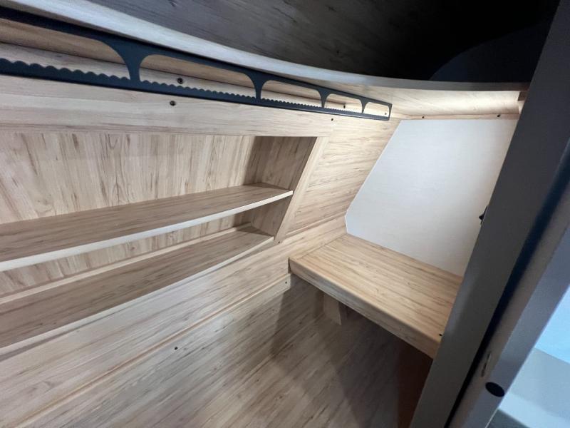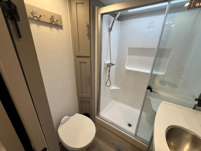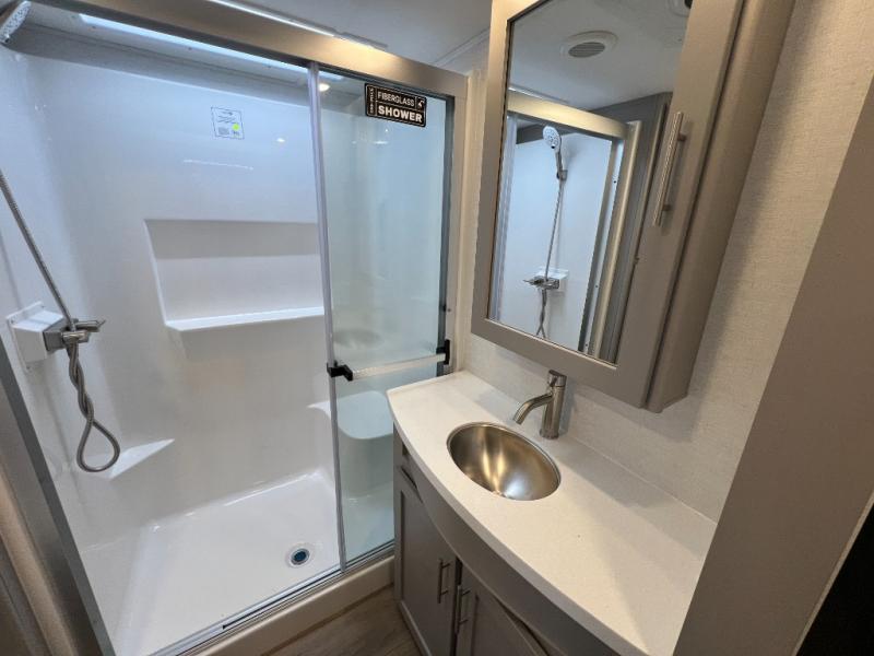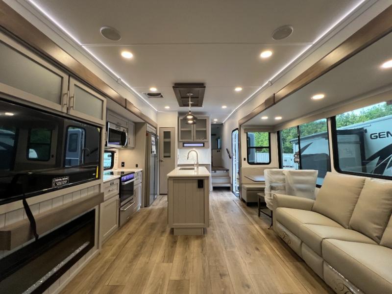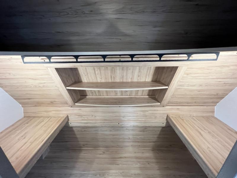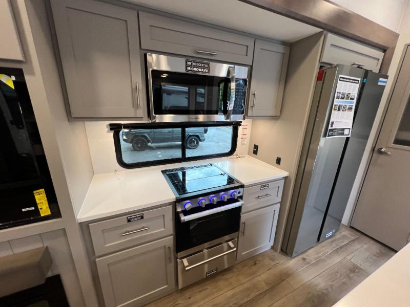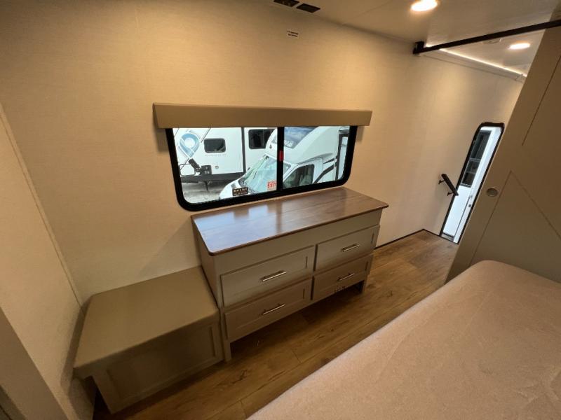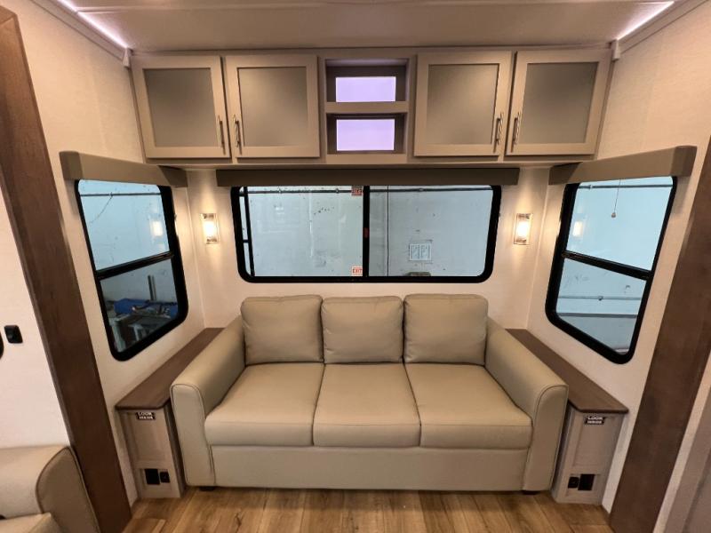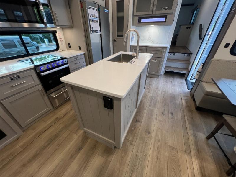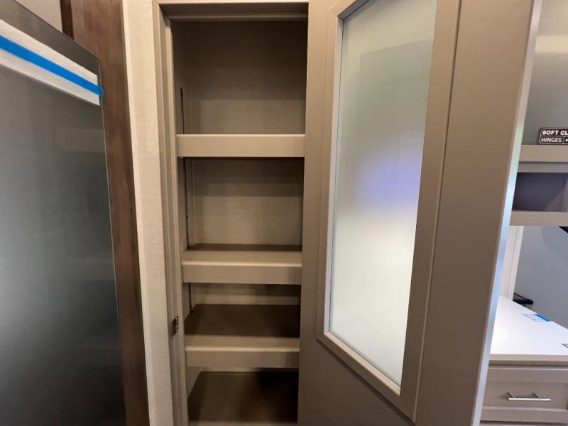 A kitchen island with countertop space makes it easy to prepare meals in this fifth wheel! The floating dinette table has two chairs on one side and a movable ottoman with flip up storage on the other side to keep your games or extra table cloths in. You can store your dishes and snacks inside the hutch/pantry or in the second pantry. The front private bedroom has a queen bed slide but can be switched out for the optional king bed if you like. There is also a dresser and large wardrobe for storage, and either side of the wardrobe with washer and dryer prep. The rear living area features a dual recliner theater seat across from an entertainment center with a 50" class HDTV with hidden storage behind it, and is also on a swing mount for all to see even at the rear sleeper sofa!