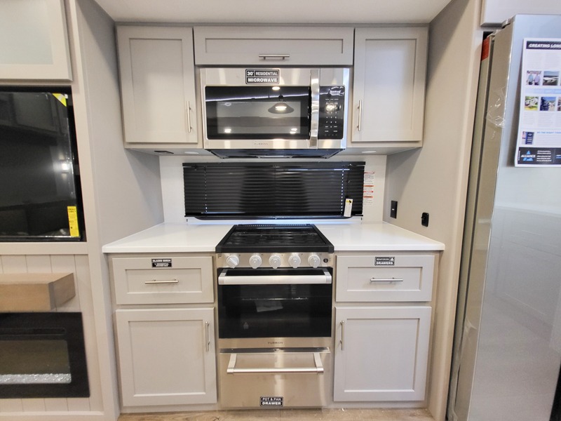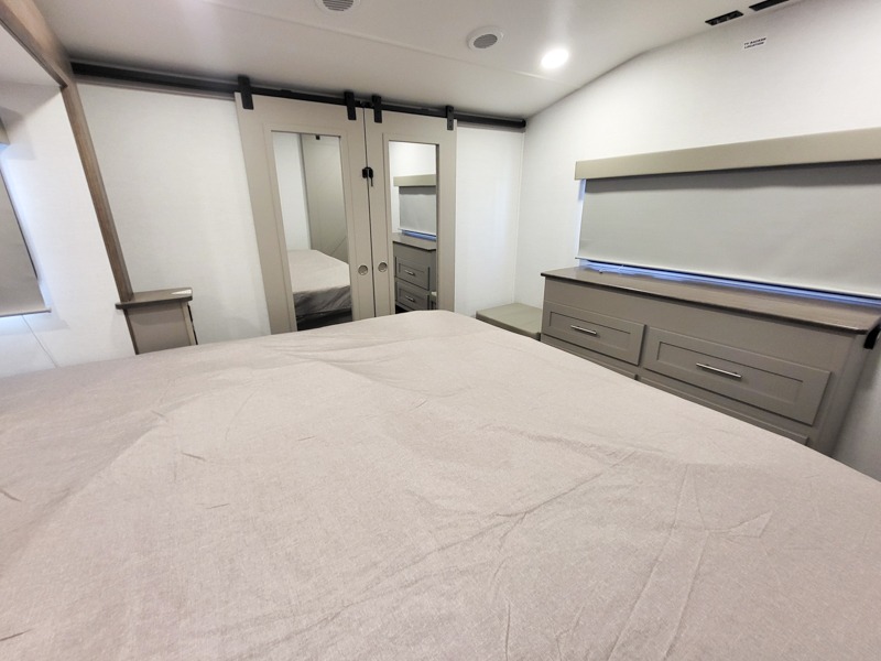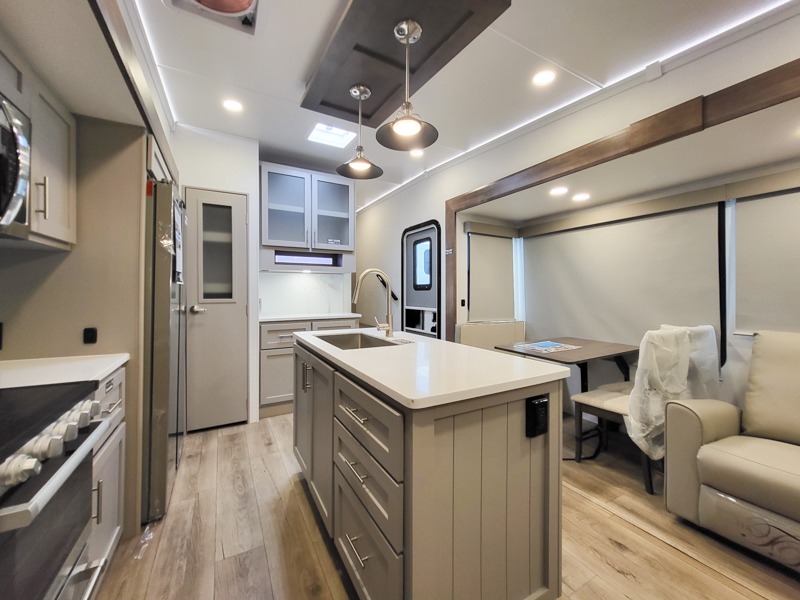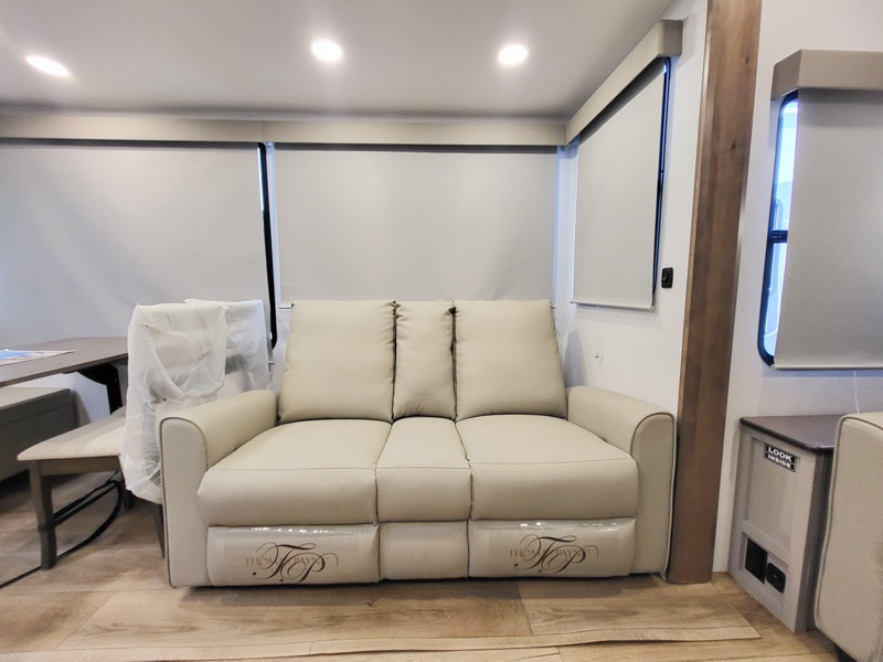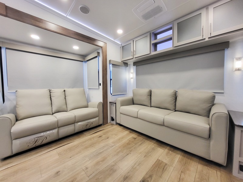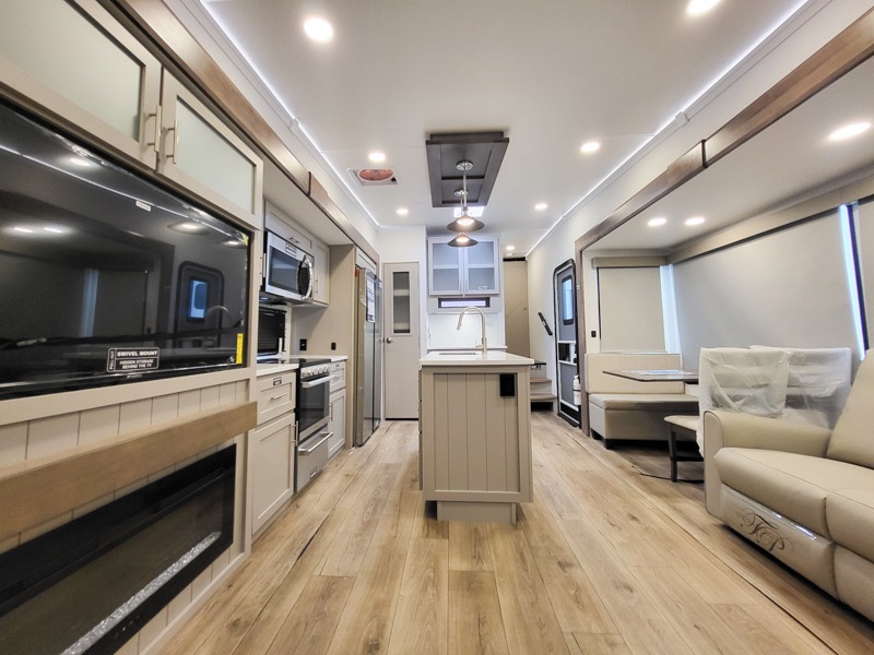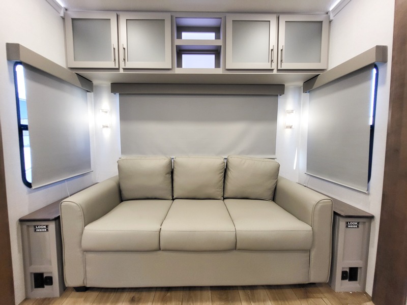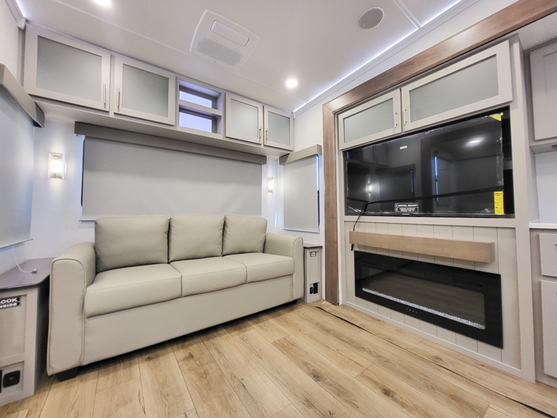 A kitchen island with countertop space makes it easy to prepare meals in this fifth wheel! The floating dinette table has two chairs on one side and a movable ottoman with flip up storage on the other side to keep your games or extra table cloths in. You can store your dishes and snacks inside the hutch/pantry or in the second pantry. The front private bedroom has a queen bed slide but can be switched out for the optional king bed if you like. There is also a dresser and large wardrobe for storage, and either side of the wardrobe with washer and dryer prep. The rear living area features a dual recliner theater seat across from an entertainment center with a 50" class HDTV with hidden storage behind it, and is also on a swing mount for all to see even at the rear sleeper sofa!