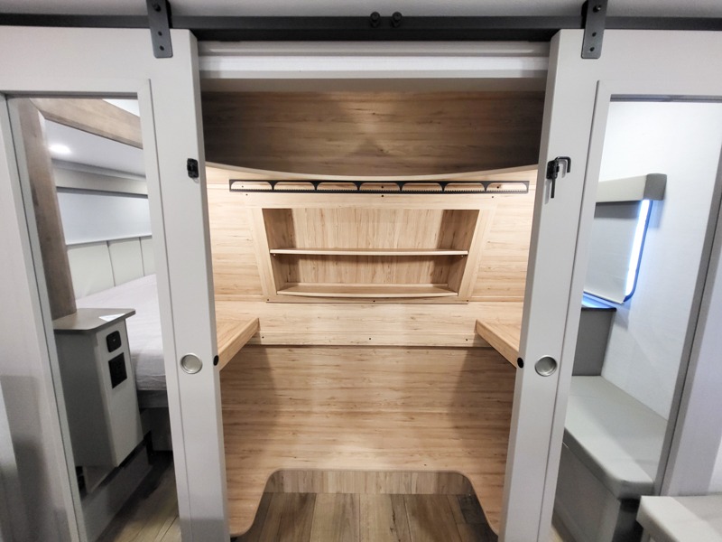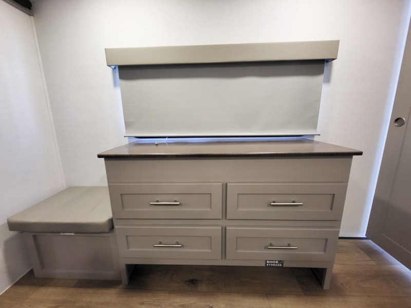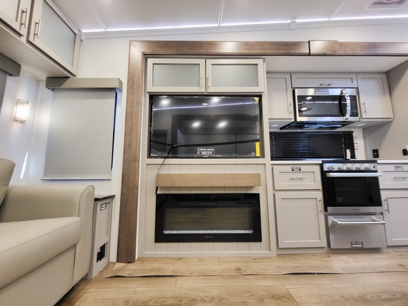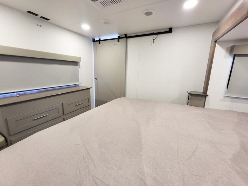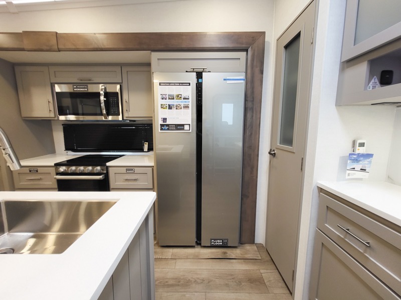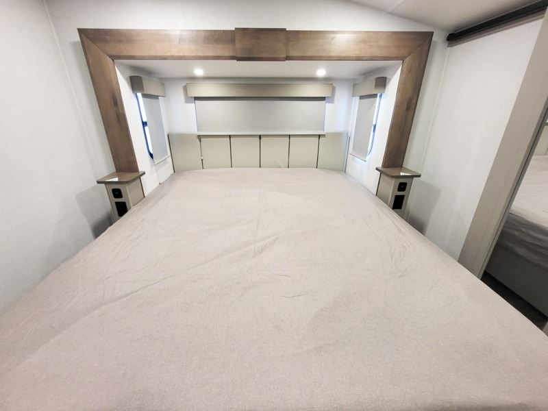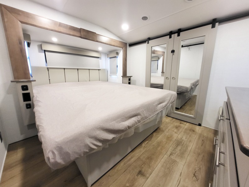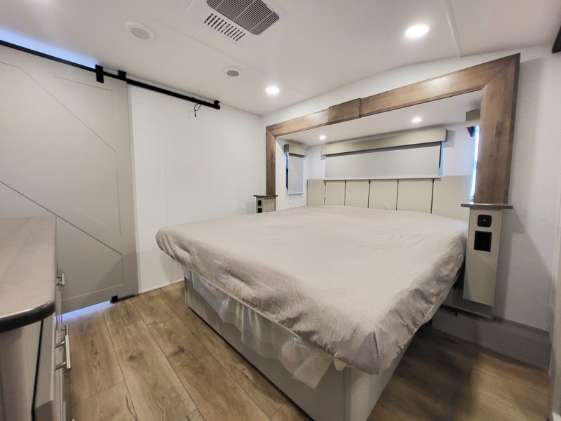 A kitchen island with countertop space makes it easy to prepare meals in this fifth wheel! The floating dinette table has two chairs on one side and a movable ottoman with flip up storage on the other side to keep your games or extra table cloths in. You can store your dishes and snacks inside the hutch/pantry or in the second pantry. The front private bedroom has a queen bed slide but can be switched out for the optional king bed if you like. There is also a dresser and large wardrobe for storage, and either side of the wardrobe with washer and dryer prep. The rear living area features a dual recliner theater seat across from an entertainment center with a 50" class HDTV with hidden storage behind it, and is also on a swing mount for all to see even at the rear sleeper sofa!