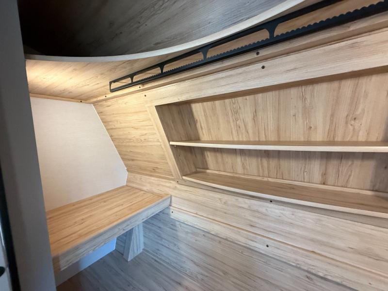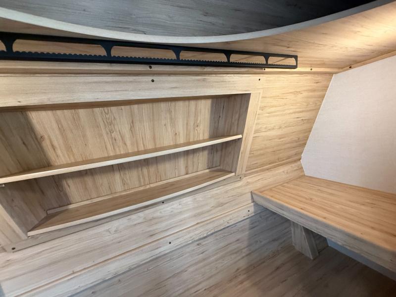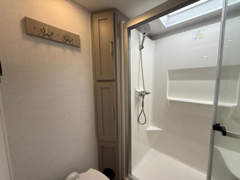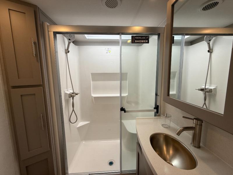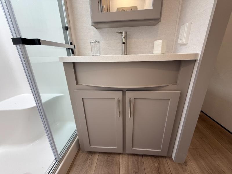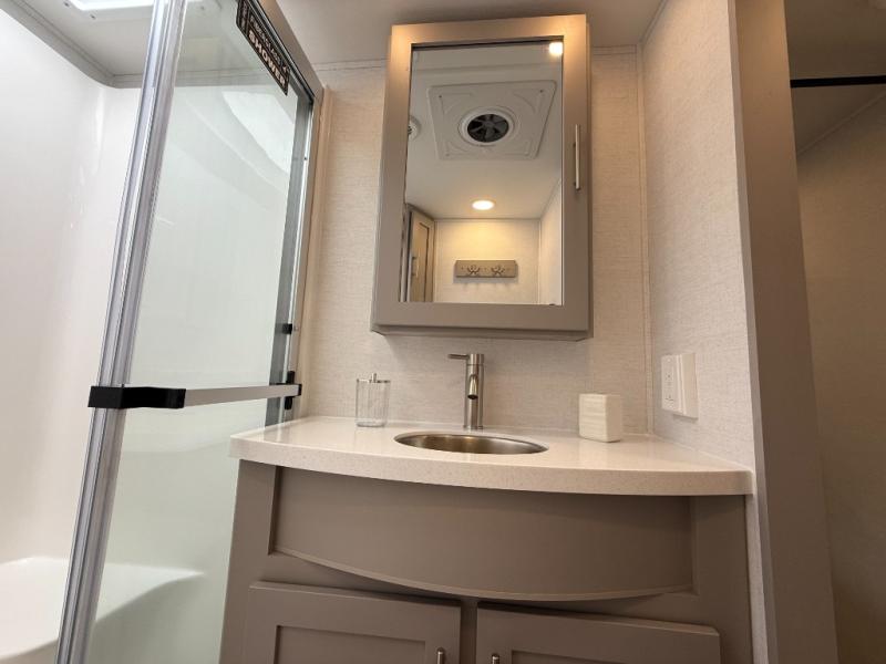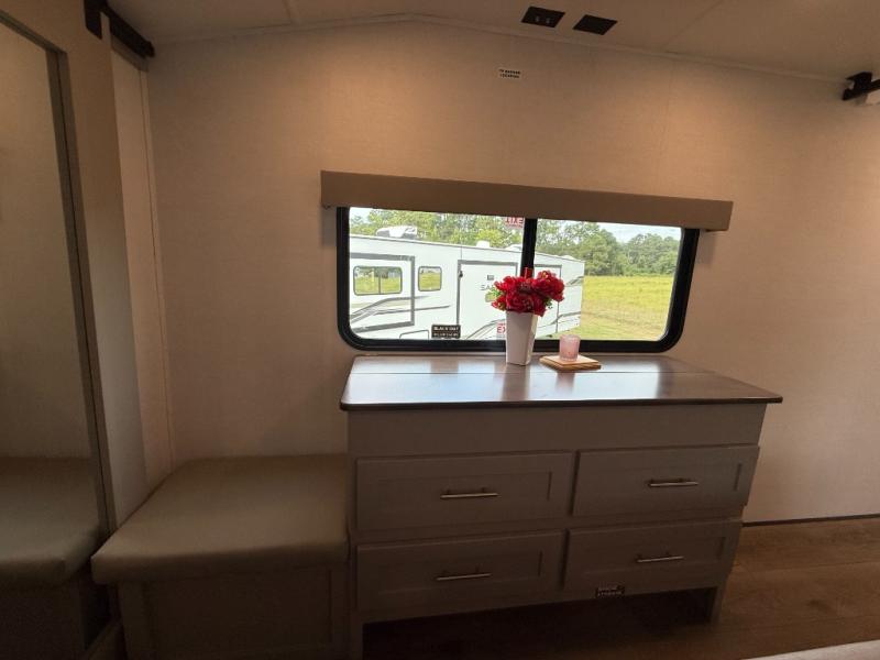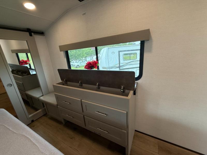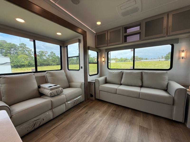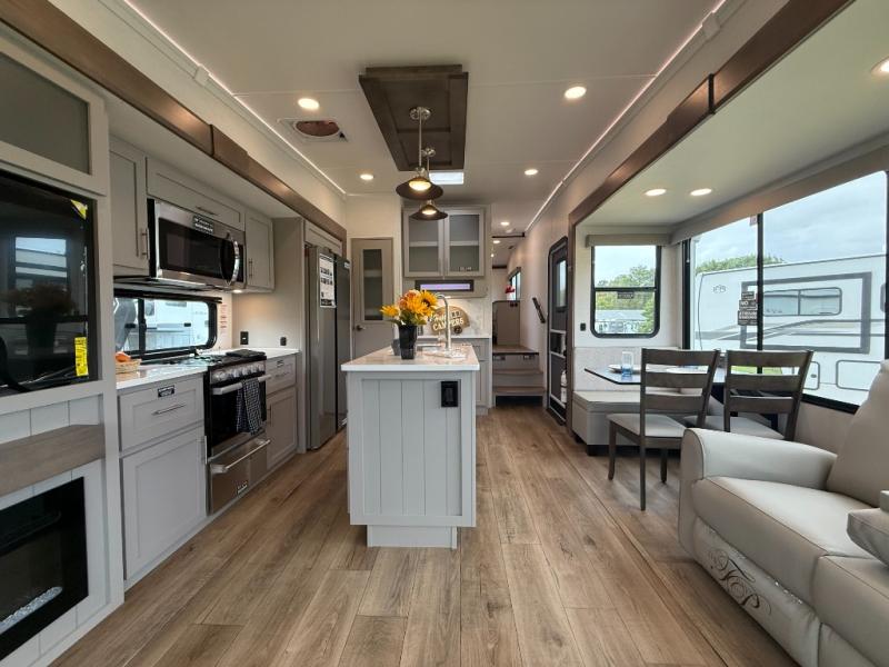 A kitchen island with countertop space makes it easy to prepare meals in this fifth wheel! The floating dinette table has two chairs on one side and a movable ottoman with flip up storage on the other side to keep your games or extra table cloths in. You can store your dishes and snacks inside the hutch/pantry or in the second pantry. The front private bedroom has a queen bed slide but can be switched out for the optional king bed if you like. There is also a dresser and large wardrobe for storage, and either side of the wardrobe with washer and dryer prep. The rear living area features a dual recliner theater seat across from an entertainment center with a 50" class HDTV with hidden storage behind it, and is also on a swing mount for all to see even at the rear sleeper sofa!