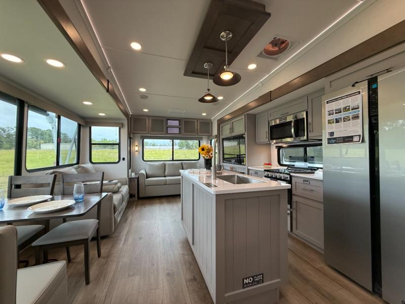 With any Avenue fifth wheel or travel trailer by Alliance RV, you will enjoy more interior space provided by the 8' 5" wide-body construction, and a long list of luxury features. Each is built with Azdel composite sidewalls both inside and out, along with a PVC roof for added strength. There are innovative storage solutions that include hidden storage behind the TV, within end tables and ottomans, and more. Since these units feature no carpet throughout, cleaning will be easier than ever, and there are flush floor slides throughout for seamless living spaces. The Avenue also comes with the OTG Solar Package with a 400 watt solar panel, inverter prep, multiple outlets, and more to keep you charged up!