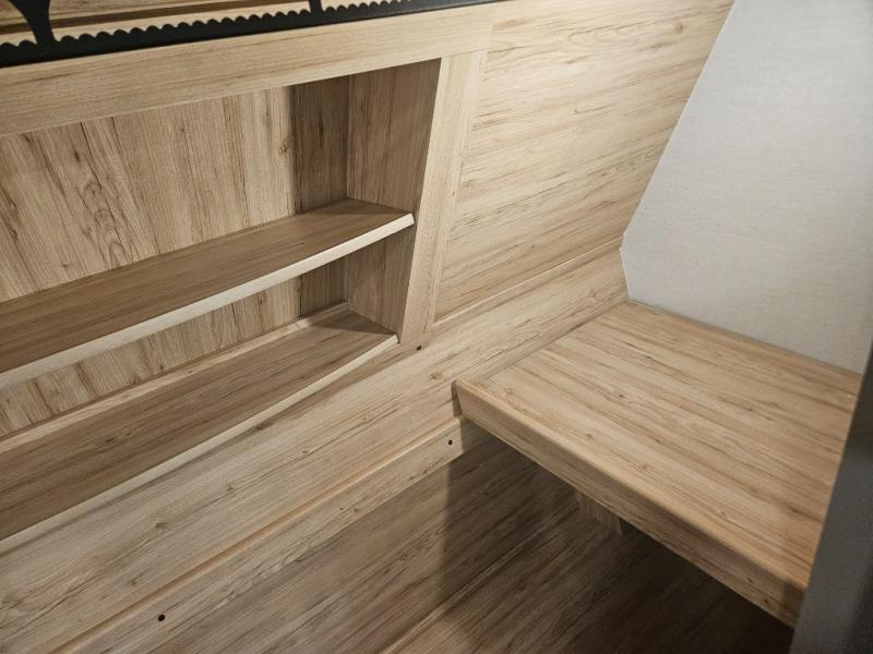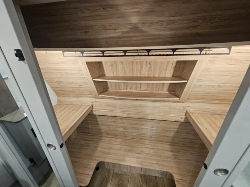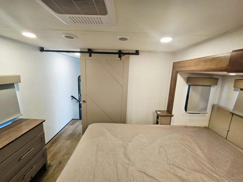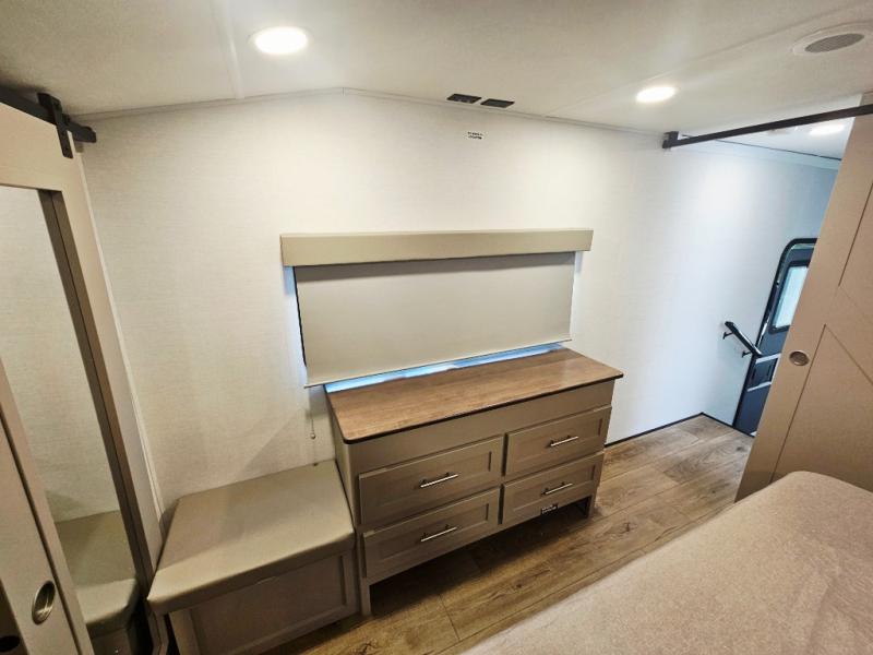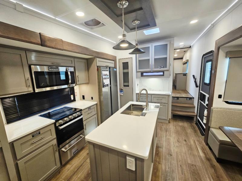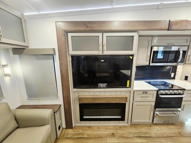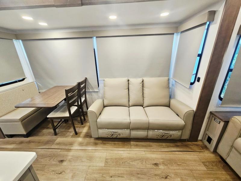 A kitchen island with countertop space makes it easy to prepare meals in this fifth wheel! The floating dinette table has two chairs on one side and a movable ottoman with flip up storage on the other side to keep your games or extra table cloths in. You can store your dishes and snacks inside the hutch/pantry or in the second pantry. The front private bedroom has a queen bed slide but can be switched out for the optional king bed if you like. There is also a dresser and large wardrobe for storage, and either side of the wardrobe with washer and dryer prep. The rear living area features a dual recliner theater seat across from an entertainment center with a 50" class HDTV with hidden storage behind it, and is also on a swing mount for all to see even at the rear sleeper sofa!
