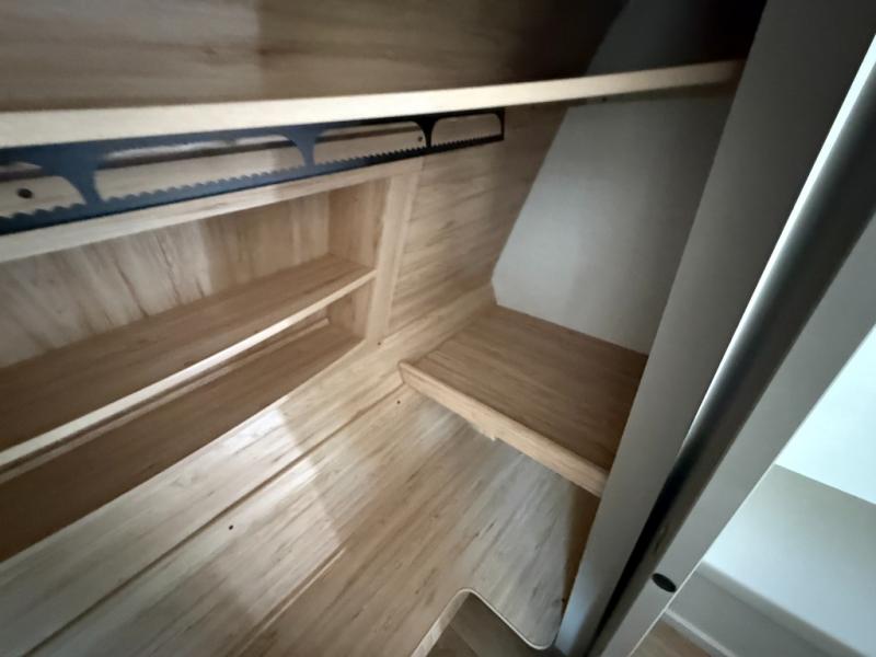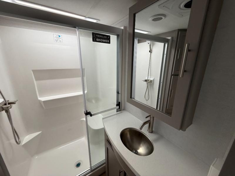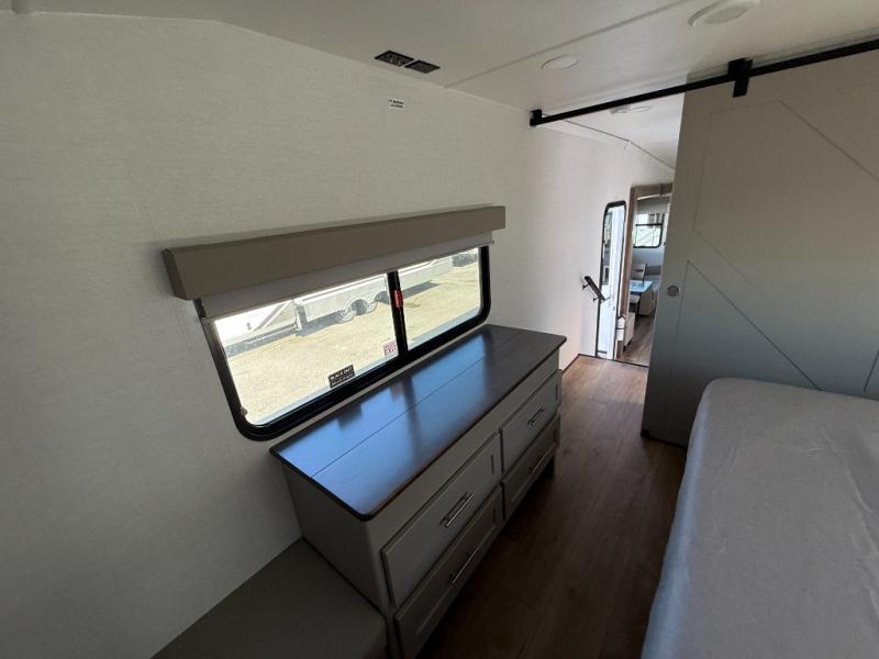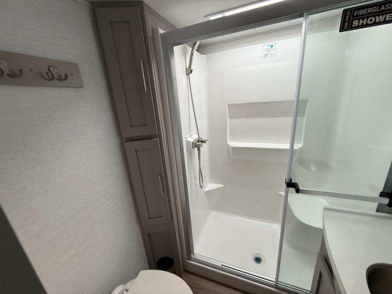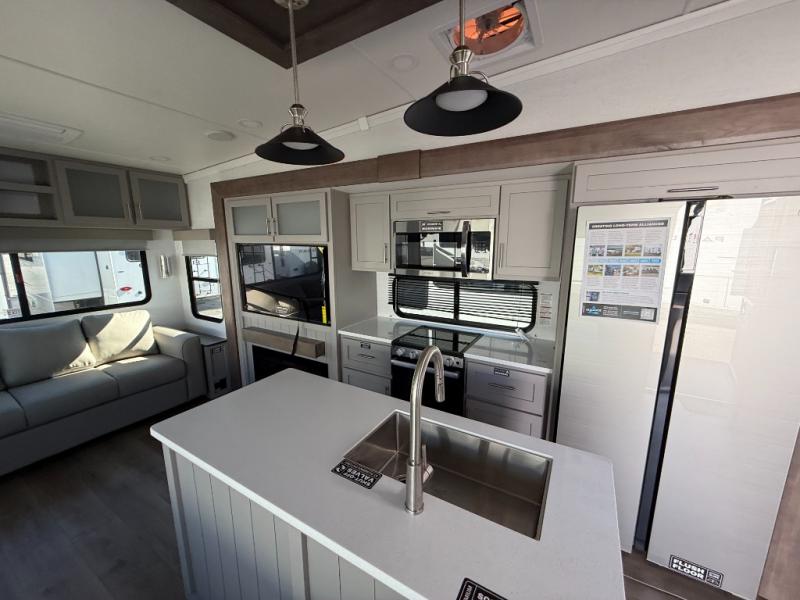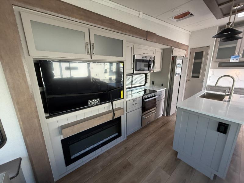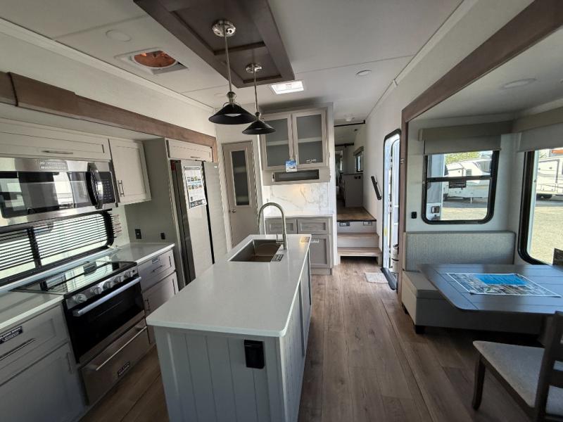 A kitchen island with countertop space makes it easy to prepare meals in this fifth wheel! The floating dinette table has two chairs on one side and a movable ottoman with flip up storage on the other side to keep your games or extra table cloths in. You can store your dishes and snacks inside the hutch/pantry or in the second pantry. The front private bedroom has a queen bed slide but can be switched out for the optional king bed if you like. There is also a dresser and large wardrobe for storage, and either side of the wardrobe with washer and dryer prep. The rear living area features a dual recliner theater seat across from an entertainment center with a 50" class HDTV with hidden storage behind it, and is also on a swing mount for all to see even at the rear sleeper sofa!