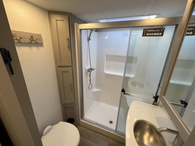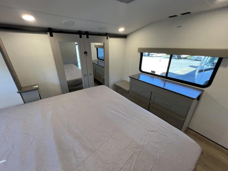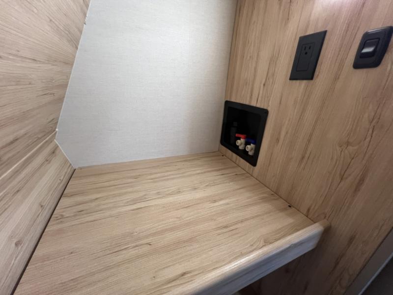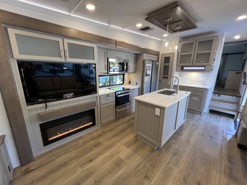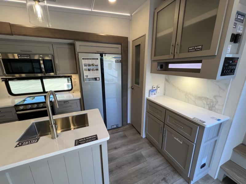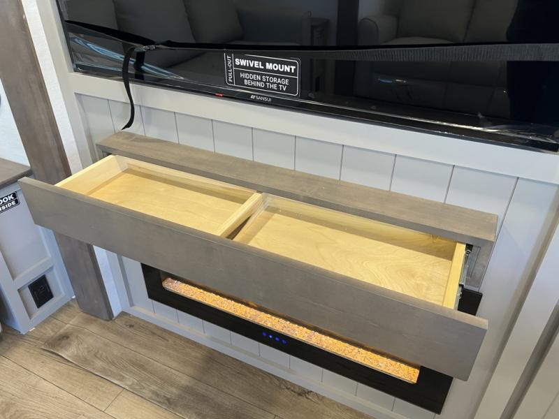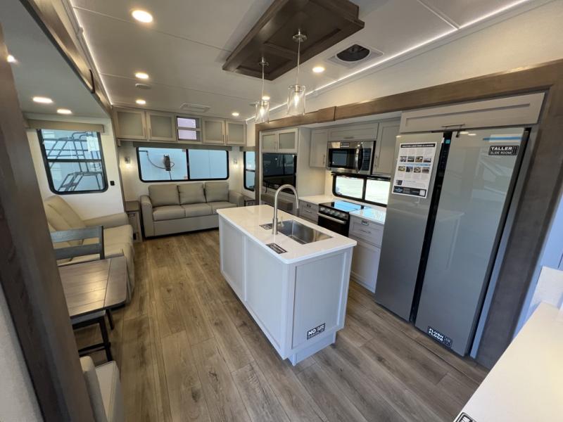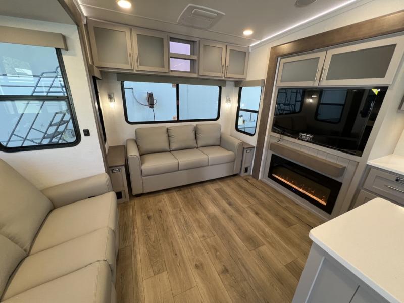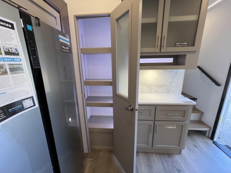 A kitchen island with countertop space makes it easy to prepare meals in this fifth wheel! The floating dinette table has two chairs on one side and a movable ottoman with flip up storage on the other side to keep your games or extra table cloths in. You can store your dishes and snacks inside the hutch/pantry or in the second pantry. The front private bedroom has a queen bed slide but can be switched out for the optional king bed if you like. There is also a dresser and large wardrobe for storage, and either side of the wardrobe with washer and dryer prep. The rear living area features a dual recliner theater seat across from an entertainment center with a 50" class HDTV with hidden storage behind it, and is also on a swing mount for all to see even at the rear sleeper sofa!