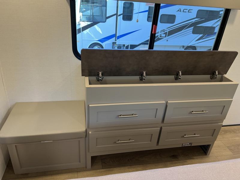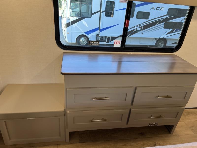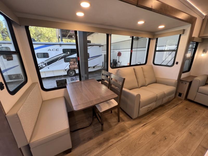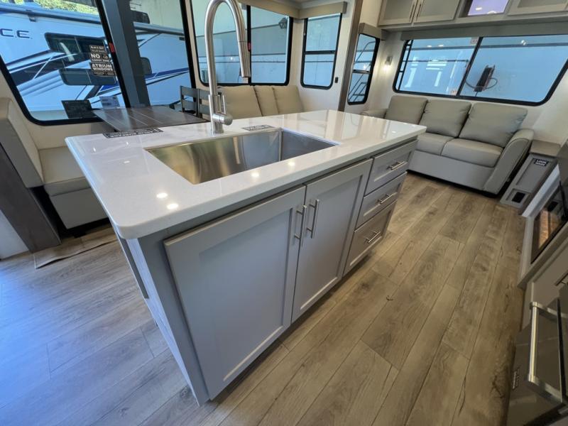 With any Avenue fifth wheel or travel trailer by Alliance RV, you will enjoy more interior space provided by the 8' 5" wide-body construction, and a long list of luxury features. Each is built with Azdel composite sidewalls both inside and out, along with a PVC roof for added strength. There are innovative storage solutions that include hidden storage behind the TV, within end tables and ottomans, and more. Since these units feature no carpet throughout, cleaning will be easier than ever, and there are flush floor slides throughout for seamless living spaces. The Avenue also comes with the OTG Solar Package with a 400 watt solar panel, inverter prep, multiple outlets, and more to keep you charged up!
