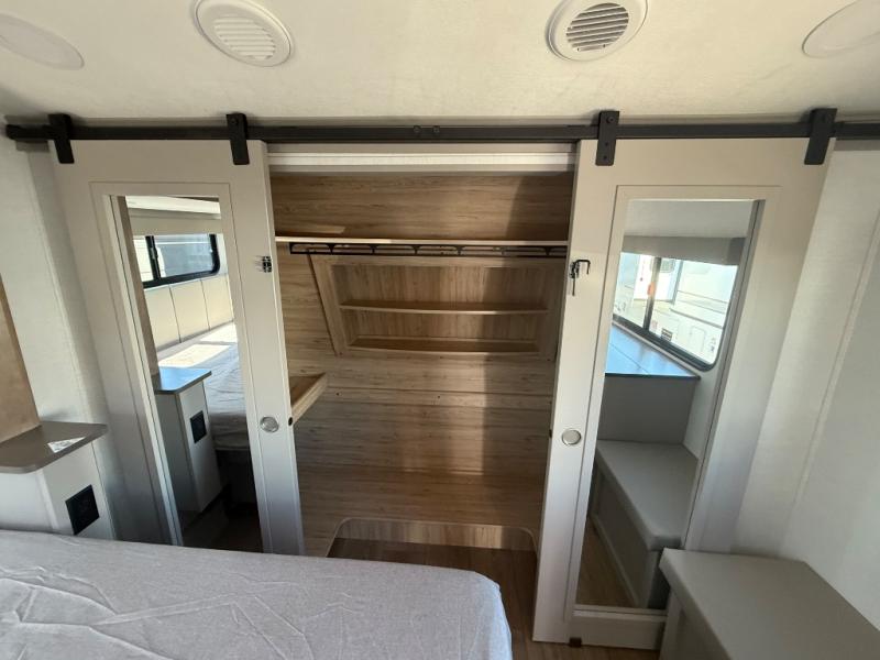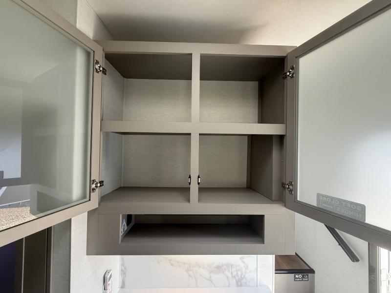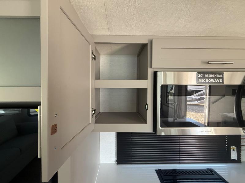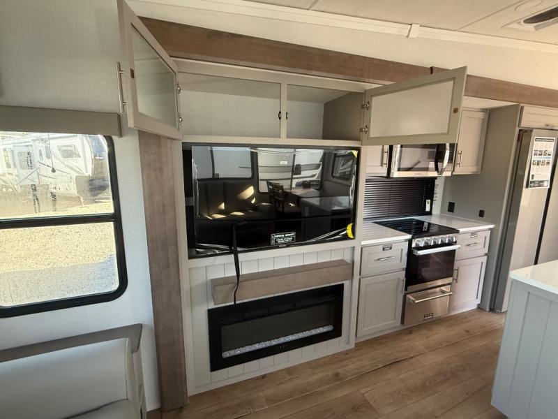 A kitchen island with countertop space makes it easy to prepare meals in this fifth wheel! The floating dinette table has two chairs on one side and a movable ottoman with flip up storage on the other side to keep your games or extra table cloths in. You can store your dishes and snacks inside the hutch/pantry or in the second pantry. The front private bedroom has a queen bed slide but can be switched out for the optional king bed if you like. There is also a dresser and large wardrobe for storage, and either side of the wardrobe with washer and dryer prep. The rear living area features a dual recliner theater seat across from an entertainment center with a 50" class HDTV with hidden storage behind it, and is also on a swing mount for all to see even at the rear sleeper sofa!