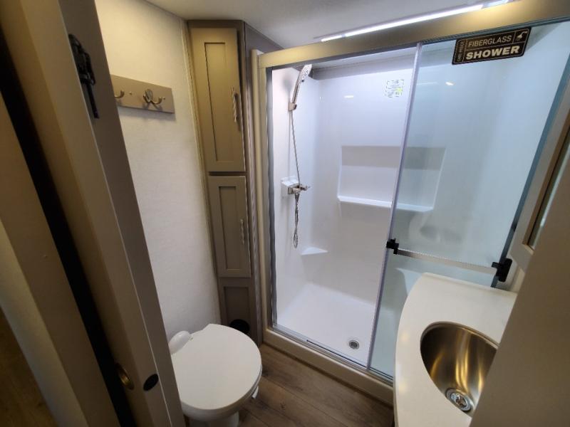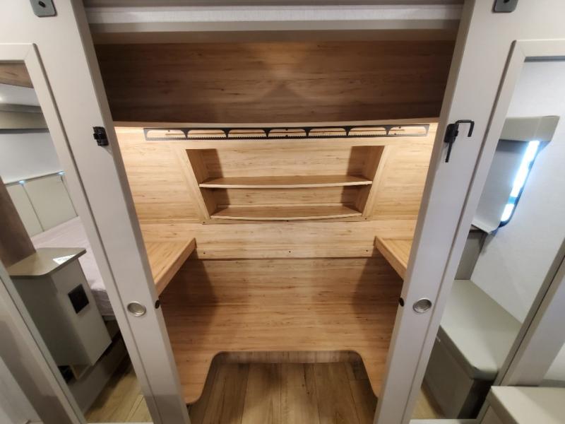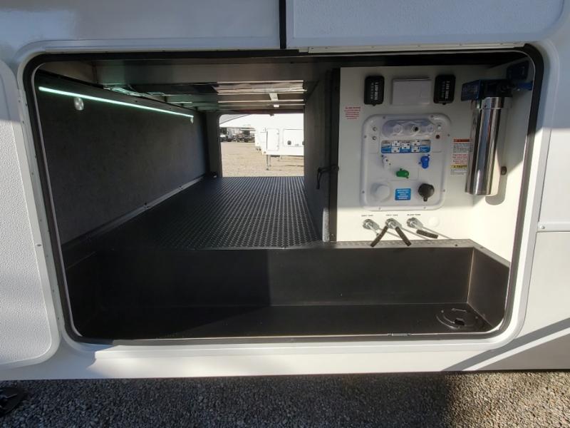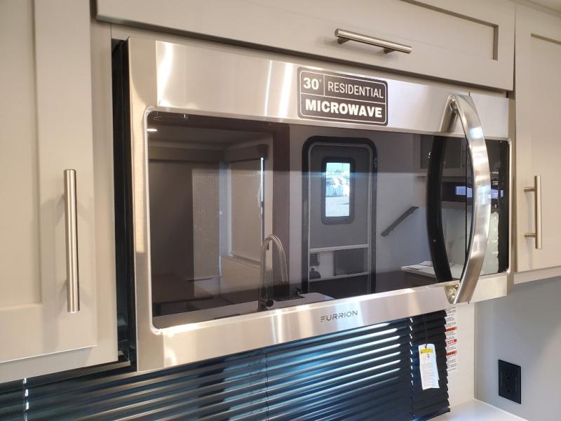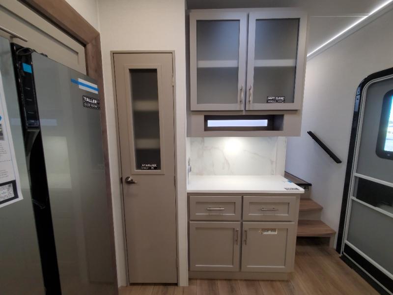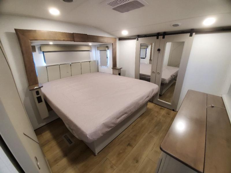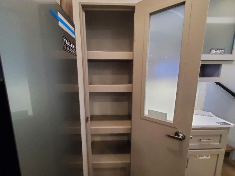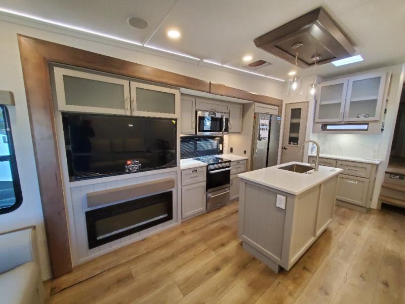 A kitchen island with countertop space makes it easy to prepare meals in this fifth wheel! The floating dinette table has two chairs on one side and a movable ottoman with flip up storage on the other side to keep your games or extra table cloths in. You can store your dishes and snacks inside the hutch/pantry or in the second pantry. The front private bedroom has a queen bed slide but can be switched out for the optional king bed if you like. There is also a dresser and large wardrobe for storage, and either side of the wardrobe with washer and dryer prep. The rear living area features a dual recliner theater seat across from an entertainment center with a 50" class HDTV with hidden storage behind it, and is also on a swing mount for all to see even at the rear sleeper sofa!