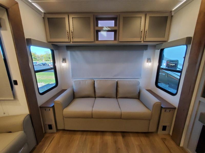 With any Avenue fifth wheel or travel trailer by Alliance RV, you will enjoy more interior space provided by the 8' 5" wide-body construction, and a long list of luxury features. Each is built with Azdel composite sidewalls both inside and out, along with a PVC roof for added strength. There are innovative storage solutions that include hidden storage behind the TV, within end tables and ottomans, and more. Since these units feature no carpet throughout, cleaning will be easier than ever, and there are flush floor slides throughout for seamless living spaces. The Avenue also comes with the OTG Solar Package with a 400 watt solar panel, inverter prep, multiple outlets, and more to keep you charged up!