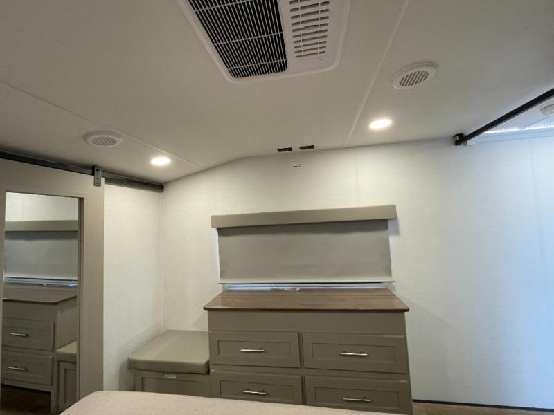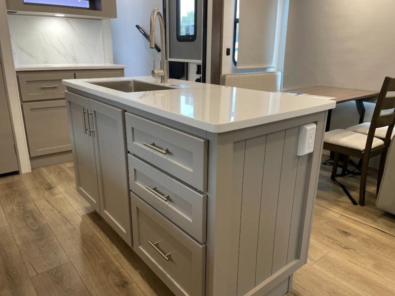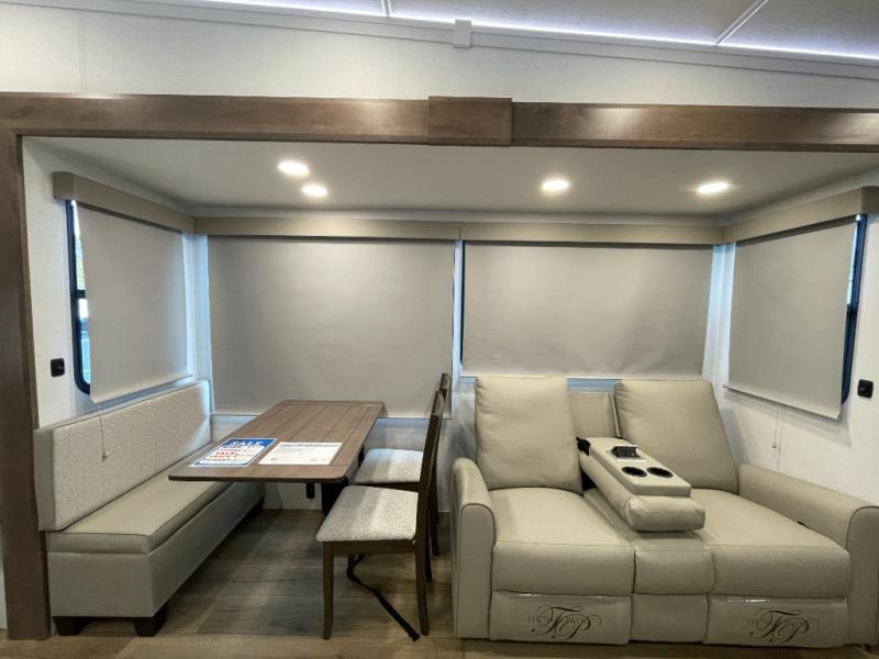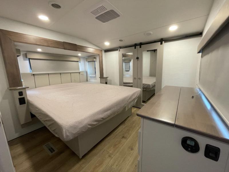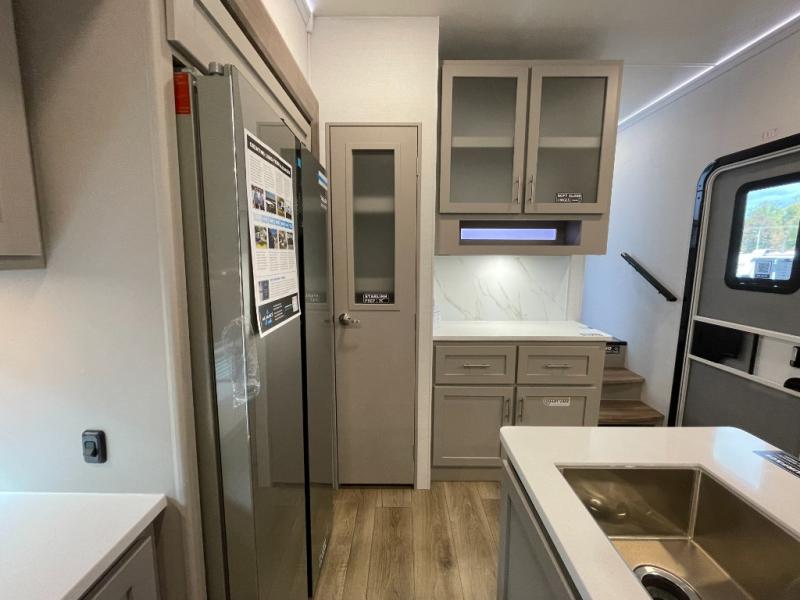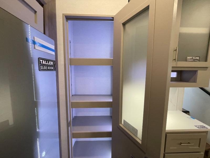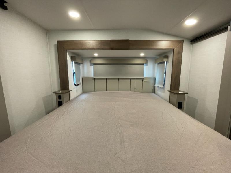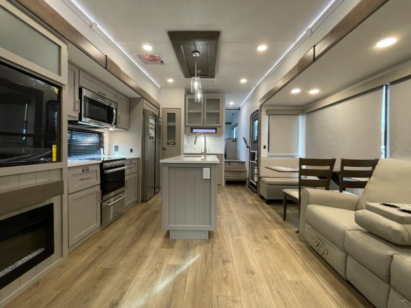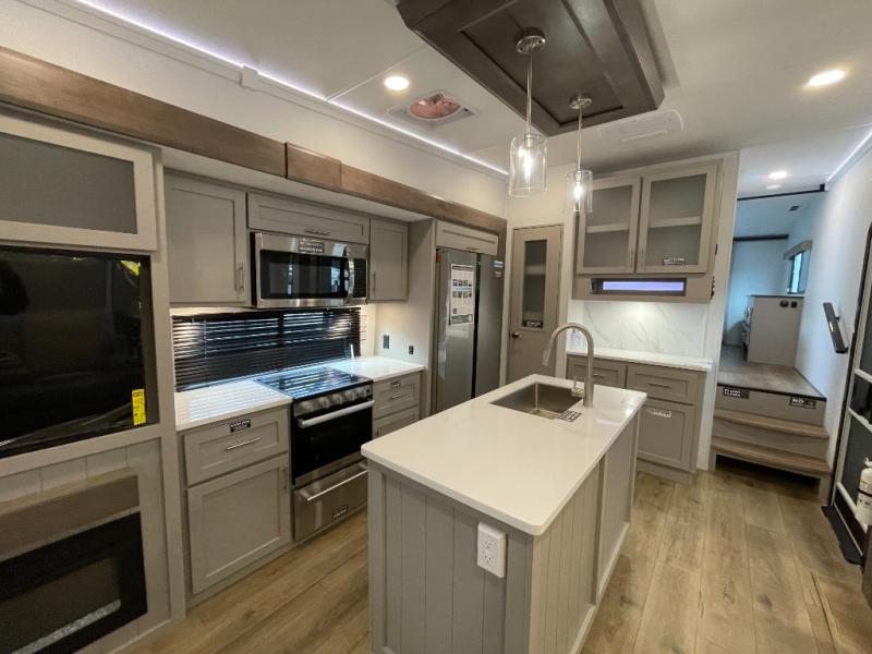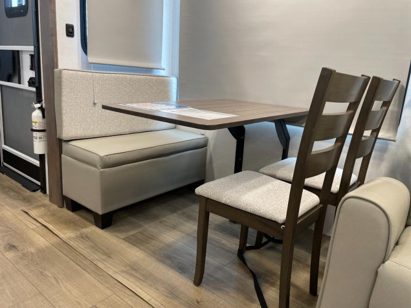 A kitchen island with countertop space makes it easy to prepare meals in this fifth wheel! The floating dinette table has two chairs on one side and a movable ottoman with flip up storage on the other side to keep your games or extra table cloths in. You can store your dishes and snacks inside the hutch/pantry or in the second pantry. The front private bedroom has a queen bed slide but can be switched out for the optional king bed if you like. There is also a dresser and large wardrobe for storage, and either side of the wardrobe with washer and dryer prep. The rear living area features a dual recliner theater seat across from an entertainment center with a 50" class HDTV with hidden storage behind it, and is also on a swing mount for all to see even at the rear sleeper sofa!