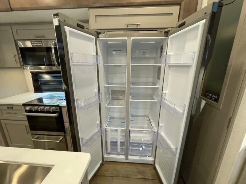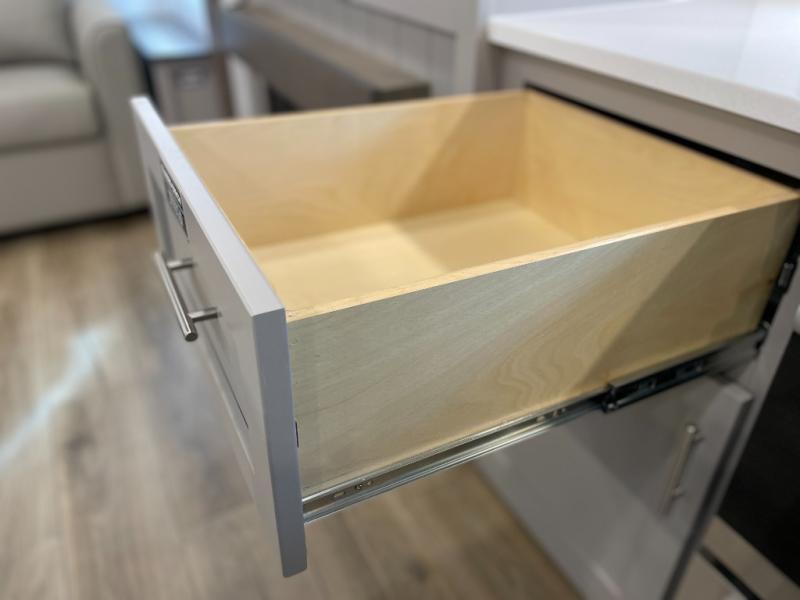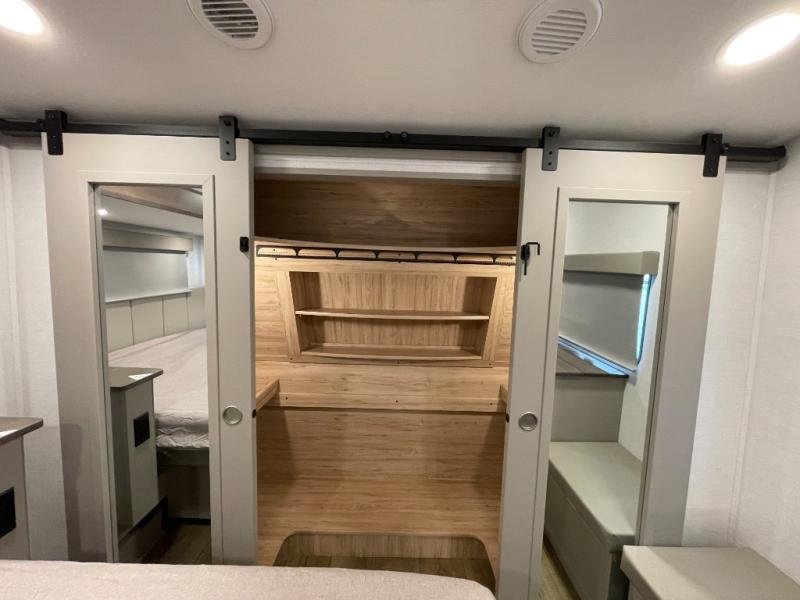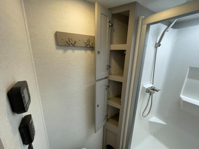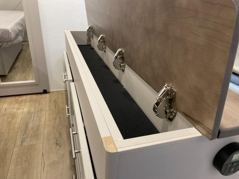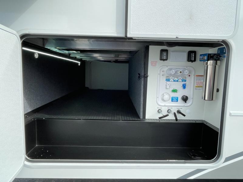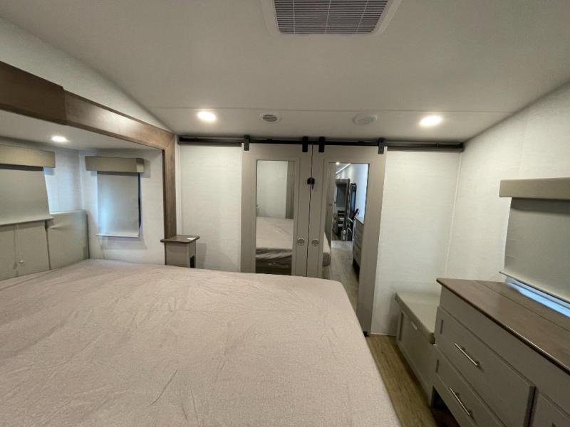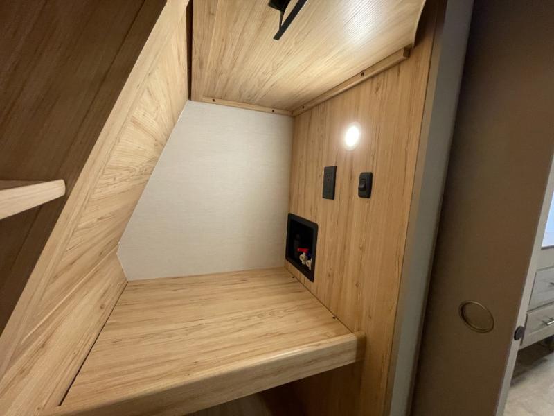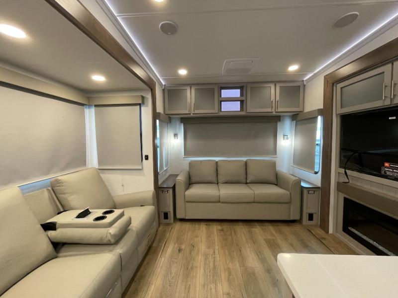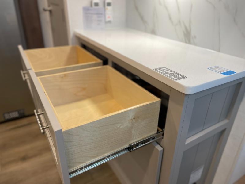 A kitchen island with countertop space makes it easy to prepare meals in this fifth wheel! The floating dinette table has two chairs on one side and a movable ottoman with flip up storage on the other side to keep your games or extra table cloths in. You can store your dishes and snacks inside the hutch/pantry or in the second pantry. The front private bedroom has a queen bed slide but can be switched out for the optional king bed if you like. There is also a dresser and large wardrobe for storage, and either side of the wardrobe with washer and dryer prep. The rear living area features a dual recliner theater seat across from an entertainment center with a 50" class HDTV with hidden storage behind it, and is also on a swing mount for all to see even at the rear sleeper sofa!