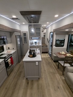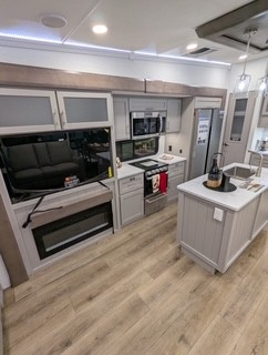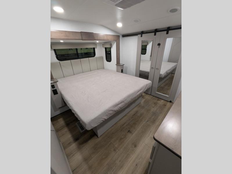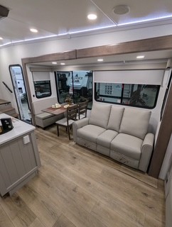 A kitchen island with countertop space makes it easy to prepare meals in this fifth wheel! The floating dinette table has two chairs on one side and a movable ottoman with flip up storage on the other side to keep your games or extra table cloths in. You can store your dishes and snacks inside the hutch/pantry or in the second pantry. The front private bedroom has a queen bed slide but can be switched out for the optional king bed if you like. There is also a dresser and large wardrobe for storage, and either side of the wardrobe with washer and dryer prep. The rear living area features a dual recliner theater seat across from an entertainment center with a 50" class HDTV with hidden storage behind it, and is also on a swing mount for all to see even at the rear sleeper sofa!